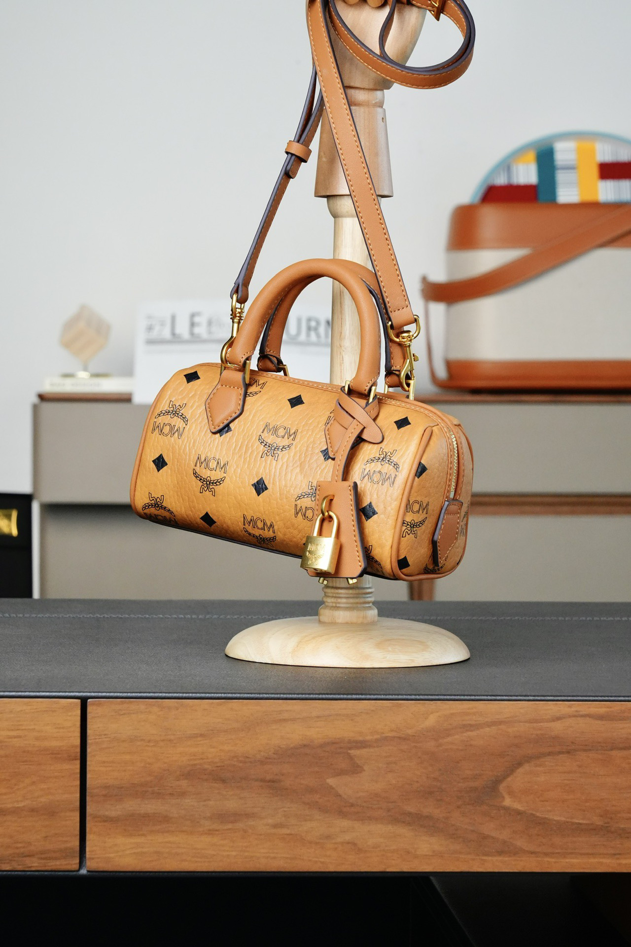 秋冬特惠💰780 原单MCM 原厂皮 干邑色𝙈𝙞𝙣𝙞 波士顿挂锁包MWPCSVI01CO001 Visetos波士顿包采用天然Nappa皮革饰边、皮革吊牌及挂锁设计。这款迷你Ella波士顿包诞生于慕尼黑黄金时代,是一款日用的肩背包。皮革吊牌及雕花Logo金属挂锁的设计灵感源自品牌的旅行传统,直接取材于品牌的经典旅行箱。