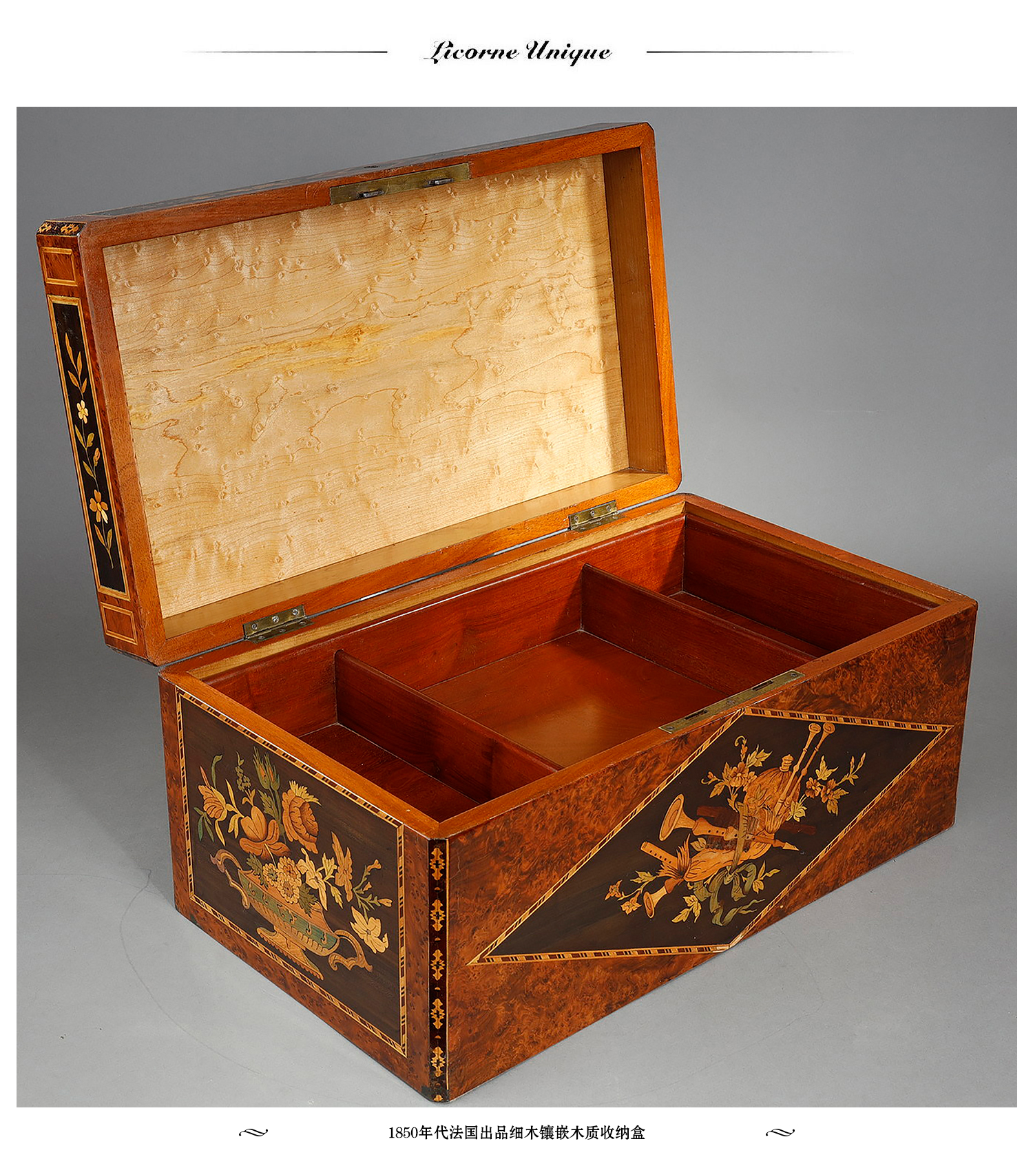 独角鹿西洋古董家居摆件1850年代法国细木镶嵌木质收纳盒珍宝盒