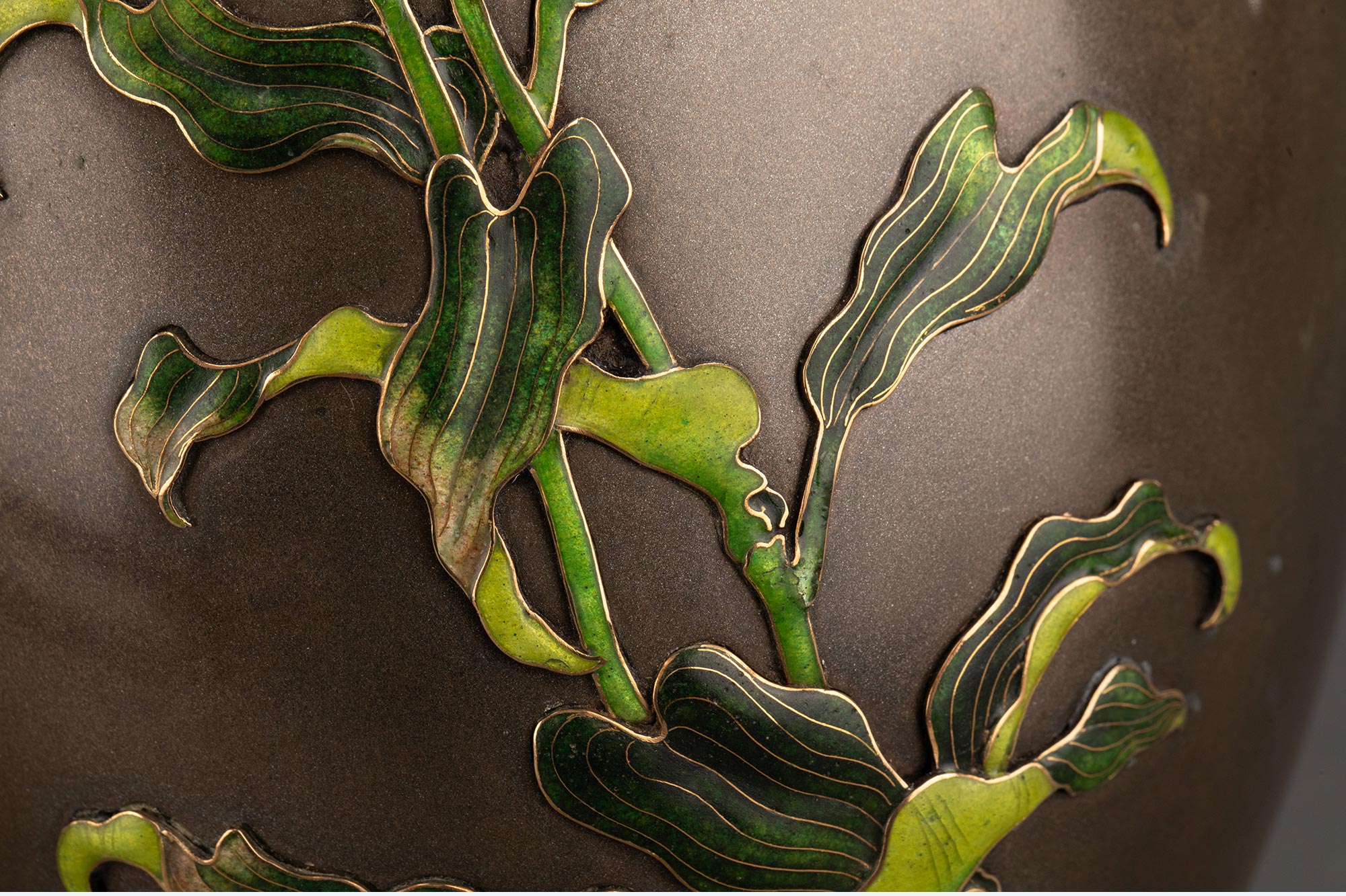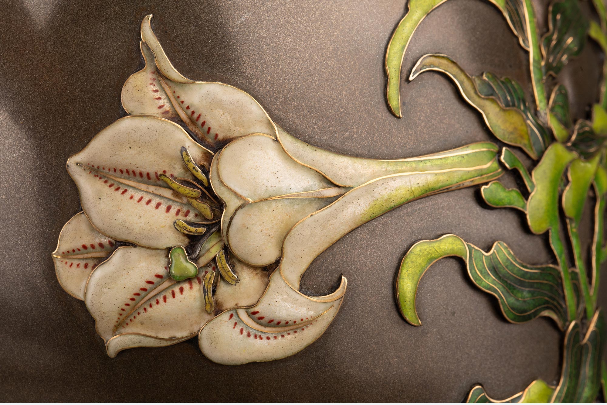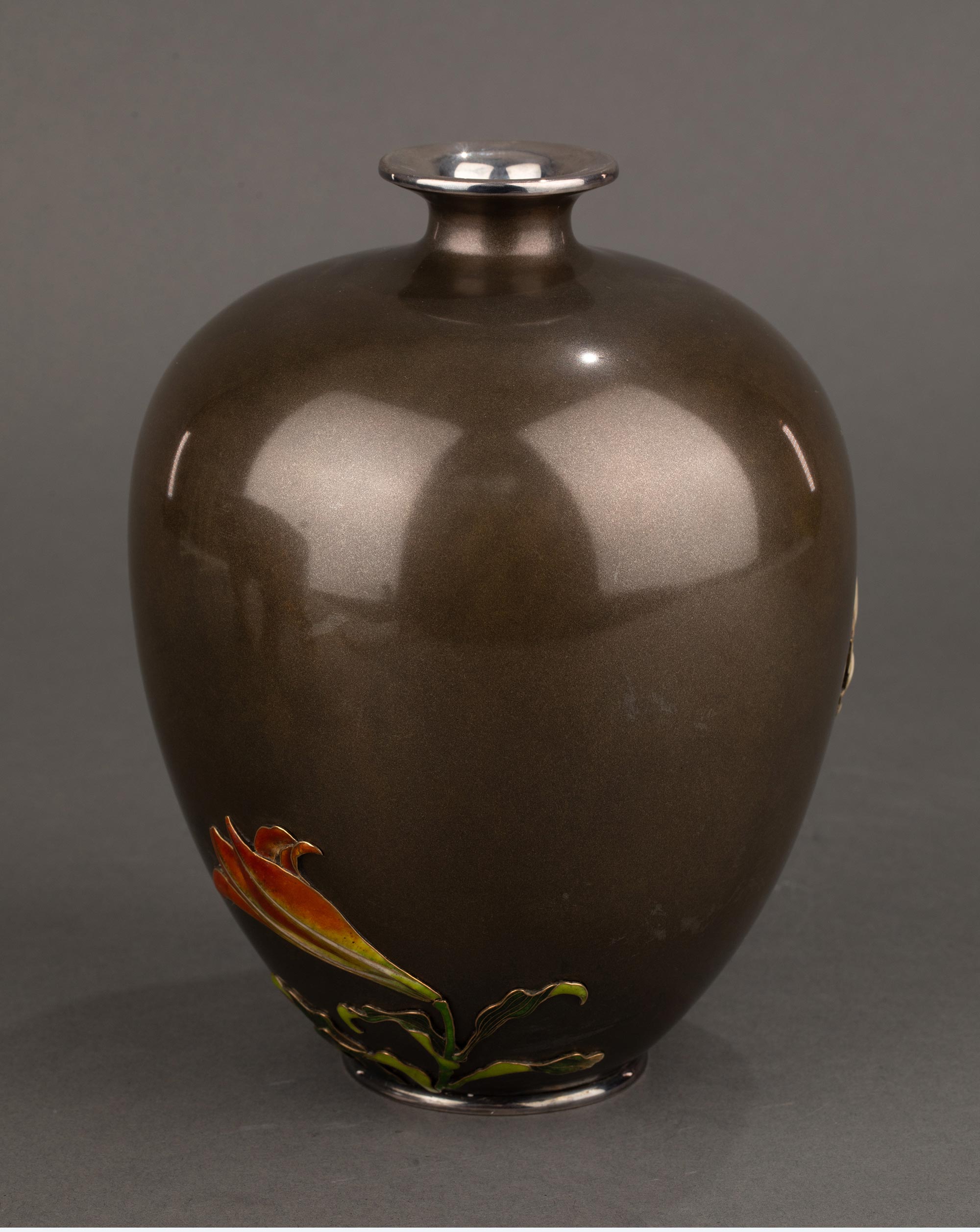 1880年代日本明治时期工匠高崎光一签名创作出品百合花主题镀银精雕装饰珐琅彩绘赤铜花瓶