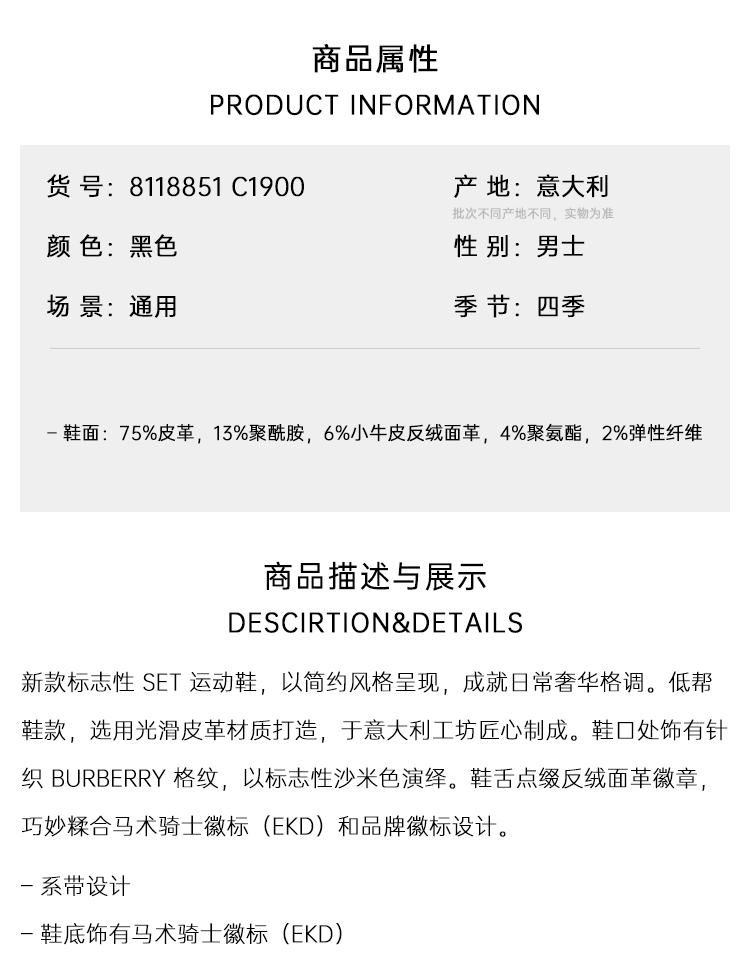 BURBERRY 巴宝莉 男士皮革 Set 休闲运动鞋 黑色 8118851 C1900