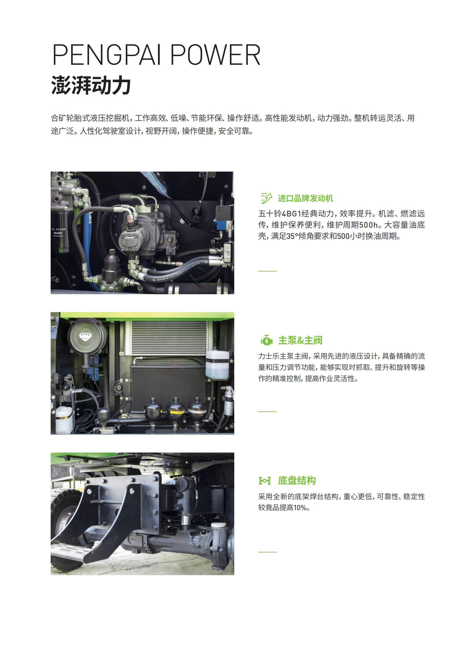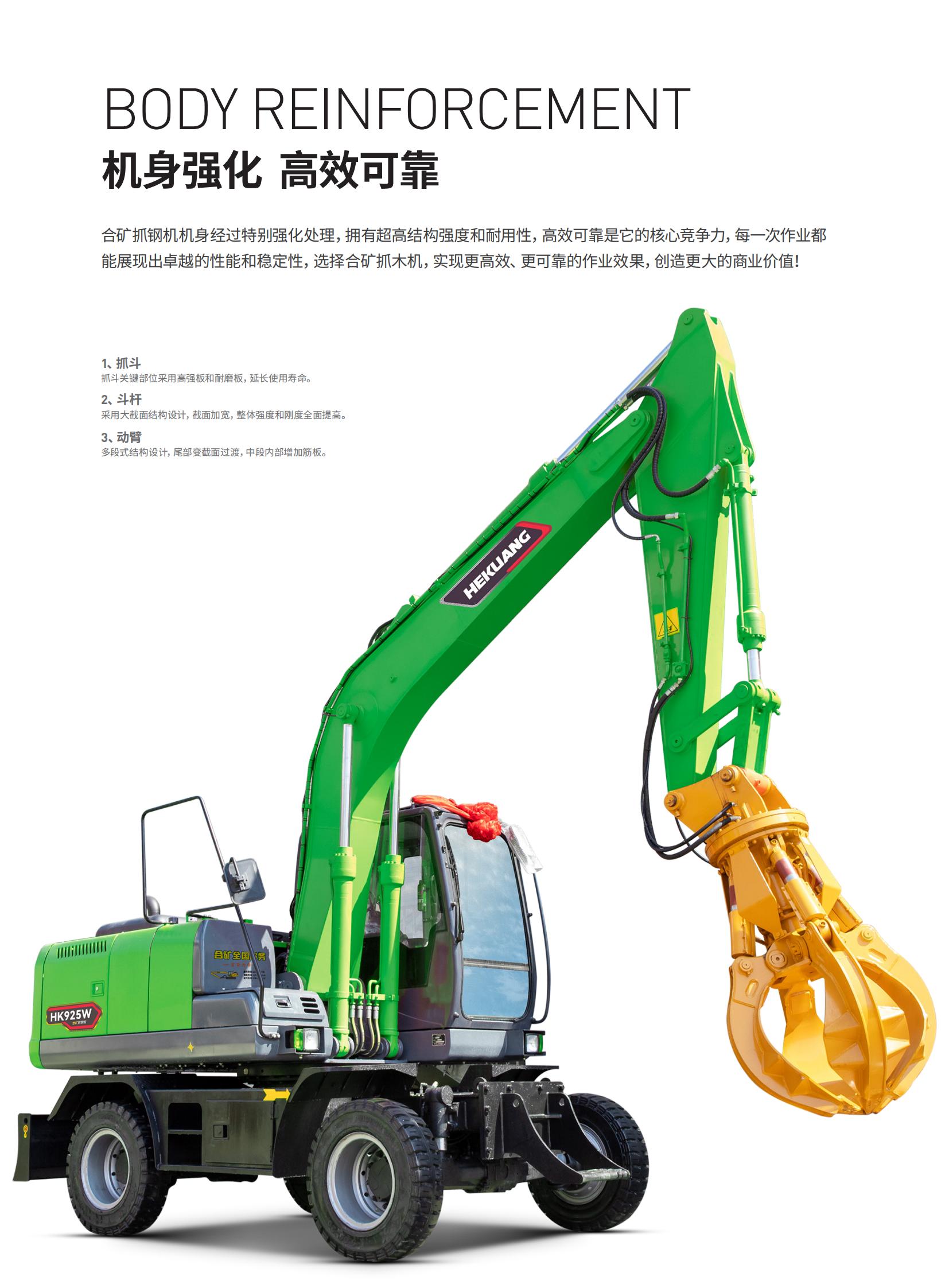 合矿轮胎式全液压抓钢机,工作高效、低噪、节能环保、操作舒适。高性能发动机,动力强劲。整机转运灵活、用途广泛。人性化驾驶室设计,视野开阔,操作便捷,安全可靠。