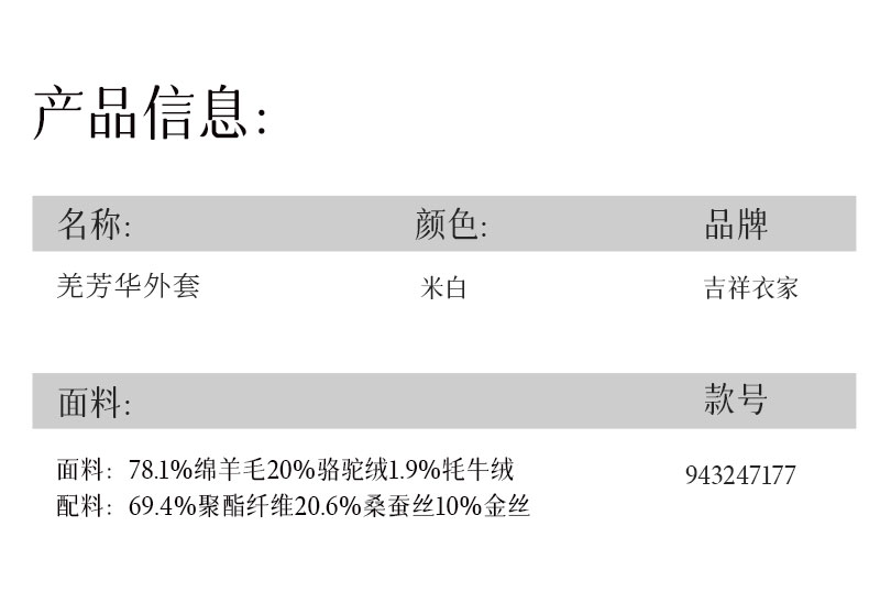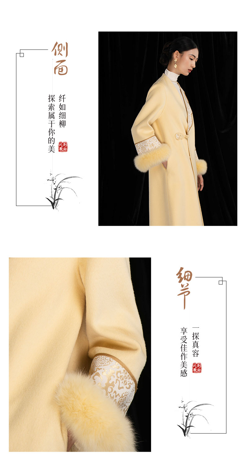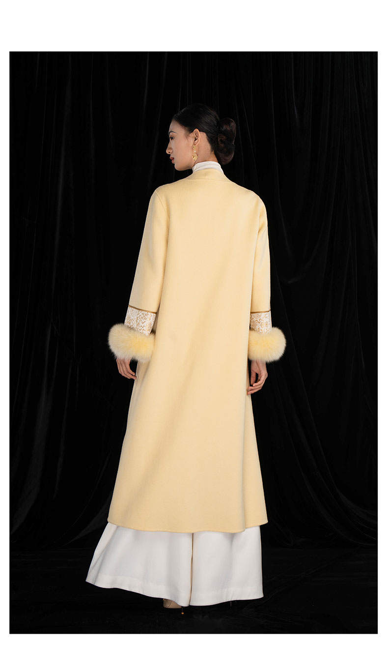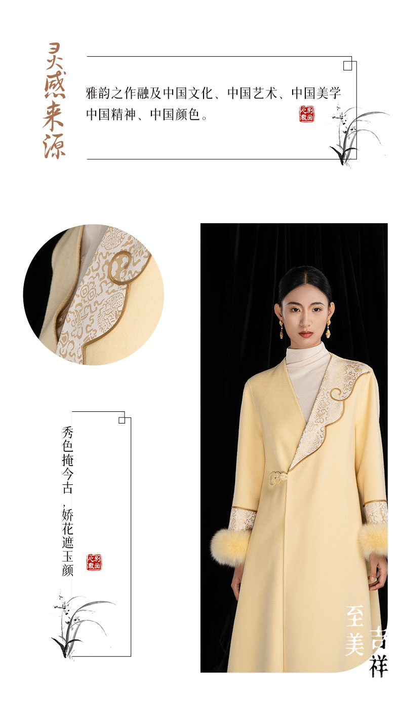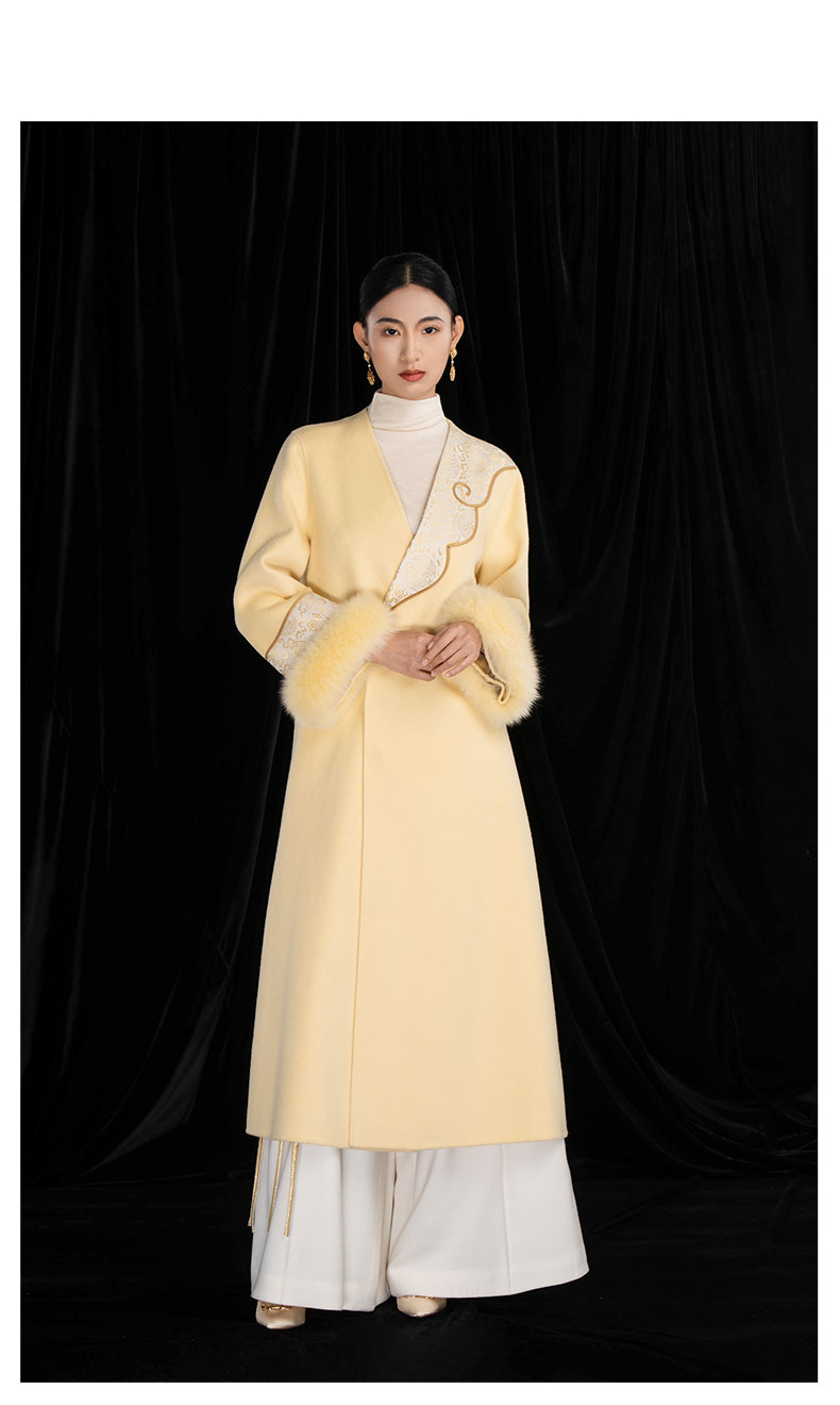 吉祥衣家国风绵羊毛大衣高级感V领气质保暖新中式长款羌芳华外套