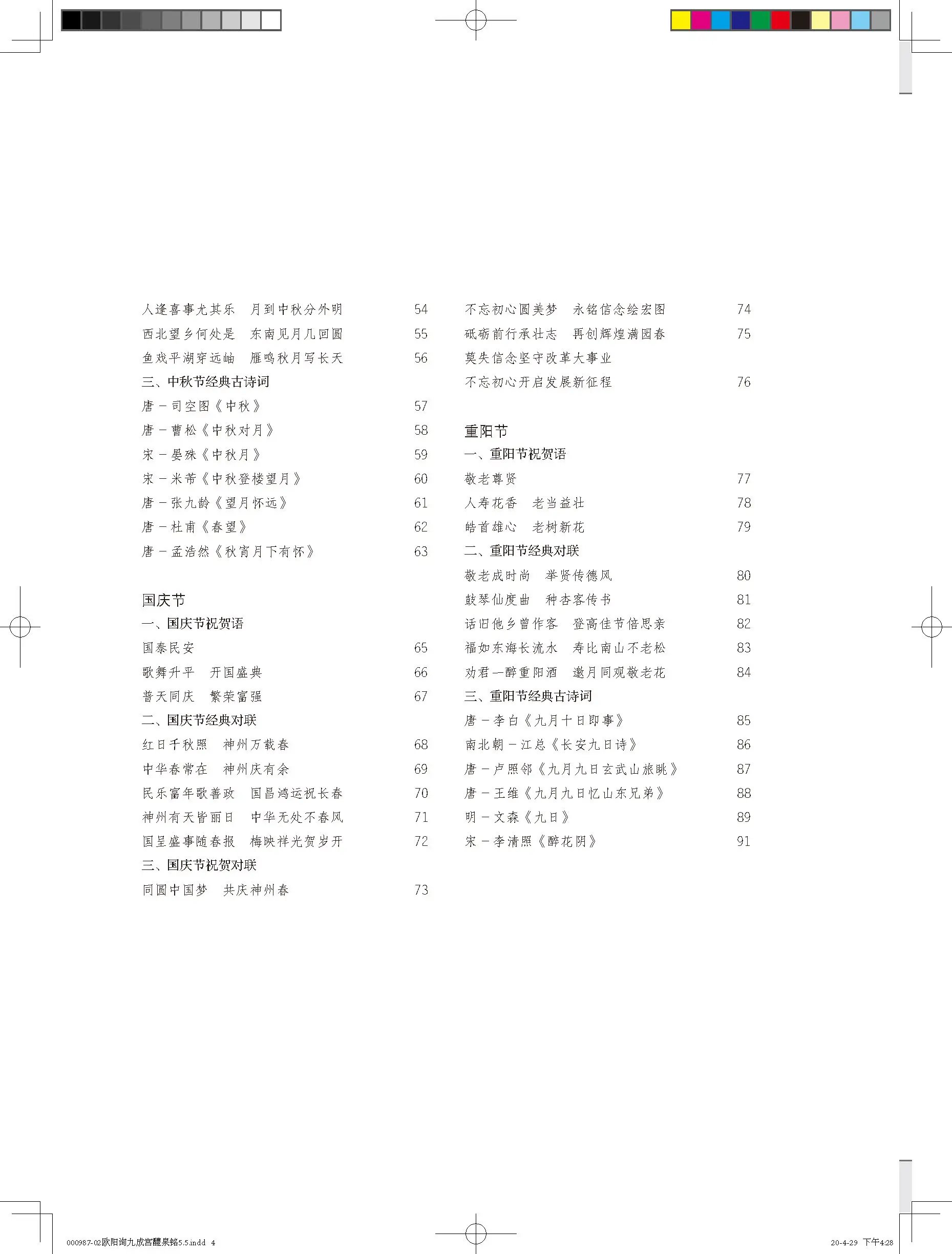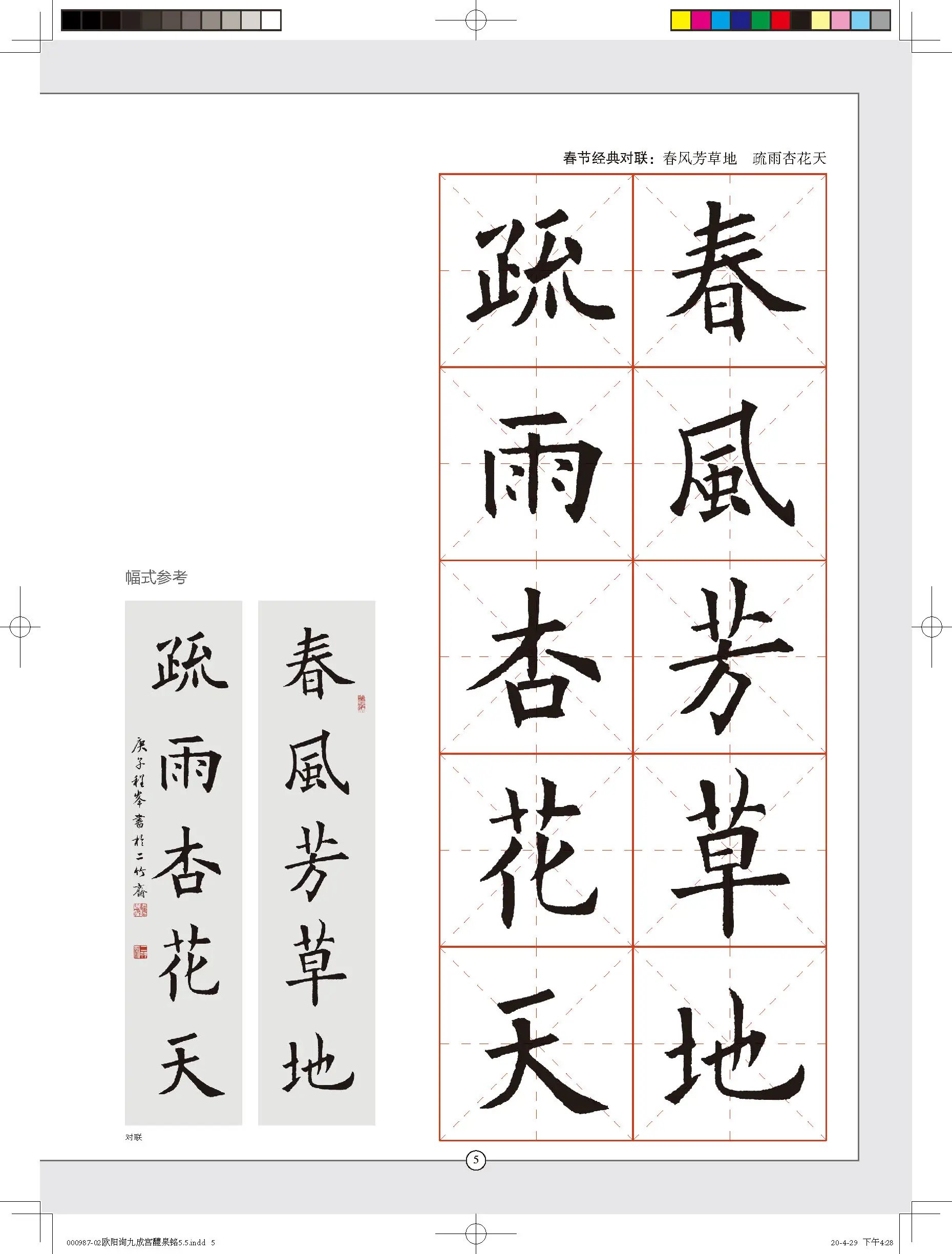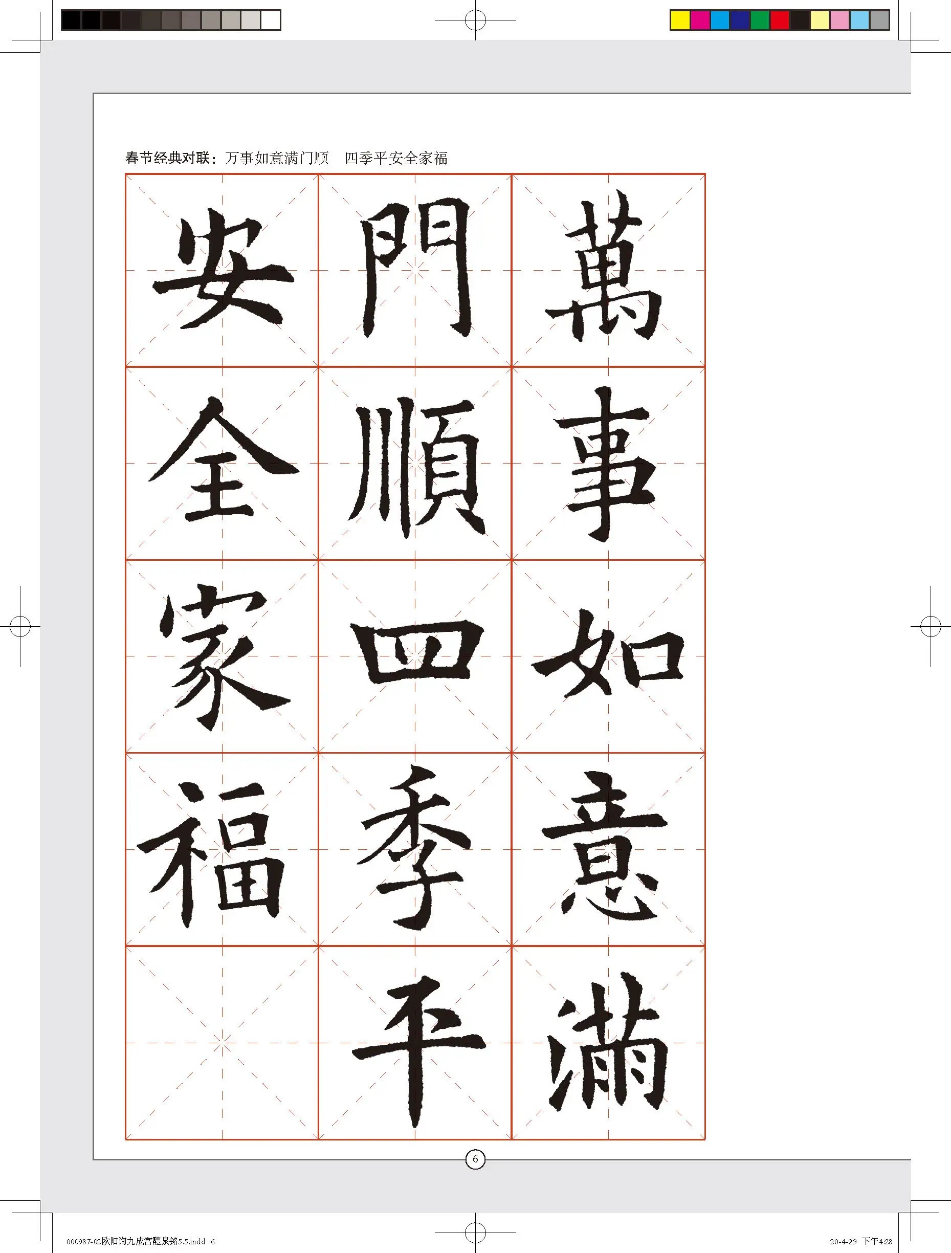 出版时间:2020-5内容简介:“节庆挥毫宝典”系列以春节、端午节、儿童节、重阳节、国庆节、中秋节为主题,集名家名帖之字,一家一帖集成一书,幅式参考涵盖了团扇、对联、斗方、中堂、条幅等,其内容又以类相从编排,不仅从形式到内容上有力地保证了全书的一致性与连贯性,更便于读者有针对性地、分门别类地欣赏、临摹、创作之用。《欧阳询九成宫醴泉铭集字吉语诗词》是此系列中的一本