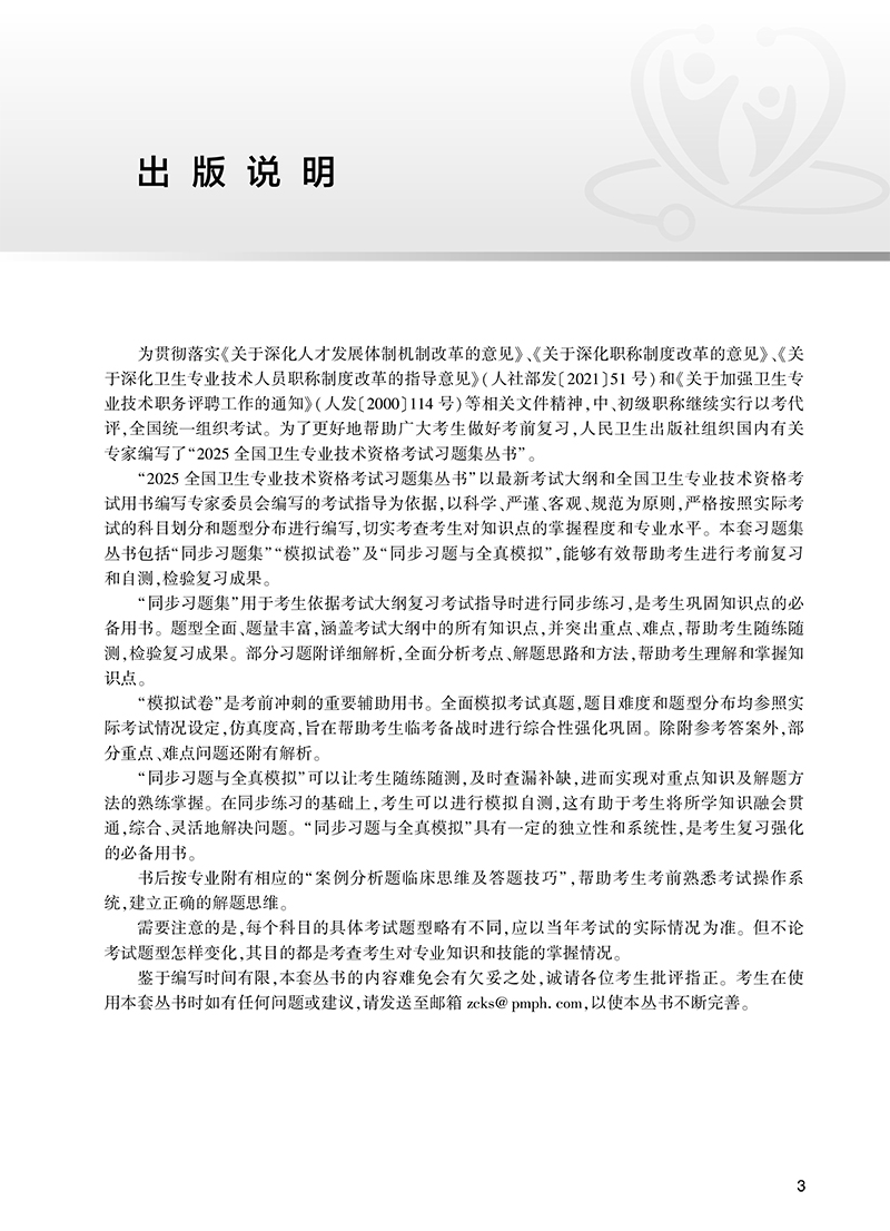 “全国卫生专业技术资格考试习题集丛书”以最新考试大纲和全国卫生专业技术资格考试用书编写专家委员会编写的考试指导为依据,编写工作遵循科学、严谨、客观、规范的原则,严格按照实际考试的科目划分和题型分布进行编写,切实考查考生对知识点的掌握程度和专业水平。本套习题集丛书包括《同步习题与全真模拟》《同步习题集》《模拟试卷》,能够有效帮助考生考前复习、自测和反馈学习成果。《同步习题与全真模拟》按考试指导的章节编写,题型全面,题量丰富,涵盖考试大纲的所有知识点,突出重点、难点。附有模拟试卷,方便考生综合检测。
