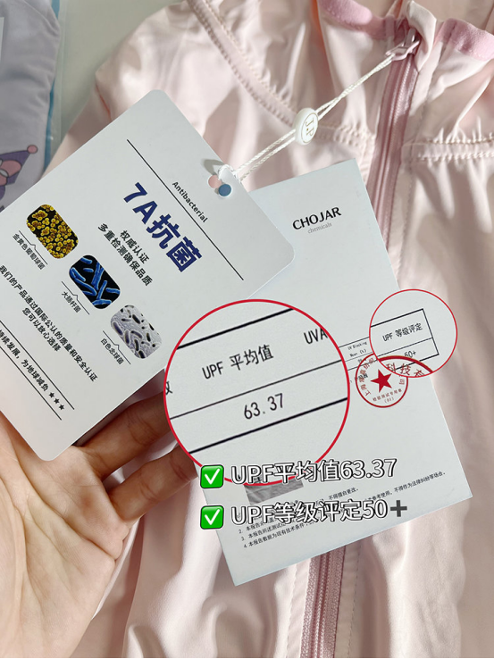 UPF50+的防晒系数,有效阻隔紫外线。 我还用专业的紫外线感应卡实际测试了一下 几乎完全阻挡住了紫外线