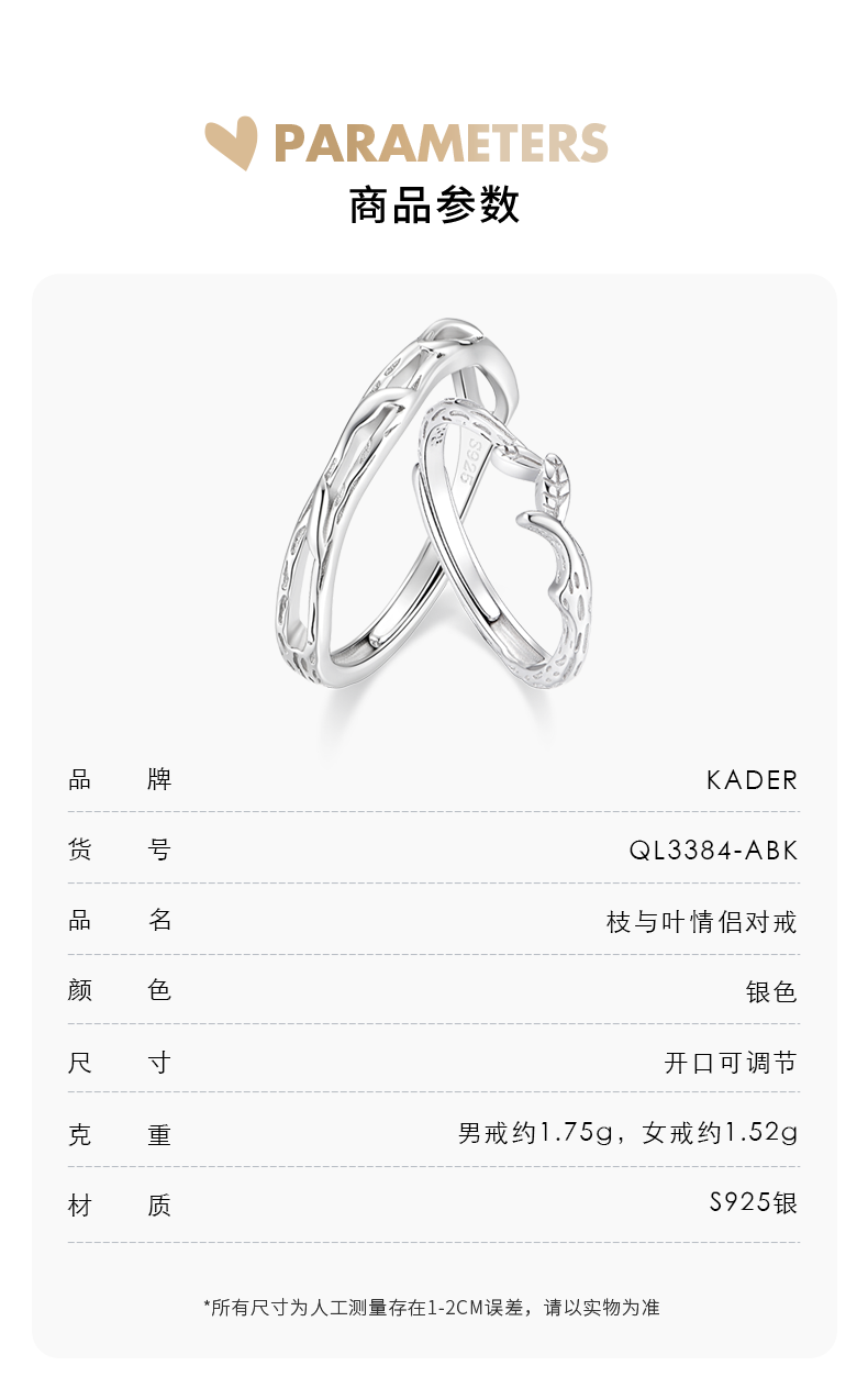 卡蒂罗/KADER 枝与叶情侣对戒 925银森系枝叶造型简约大气开口可调节素圈一对 爱意缠绵浪漫甜蜜配饰 520送女生
