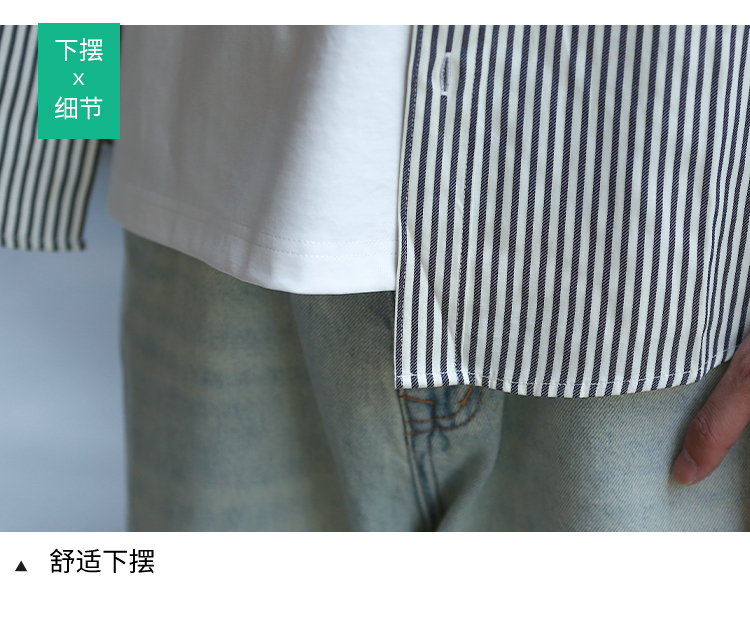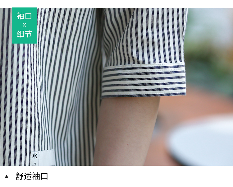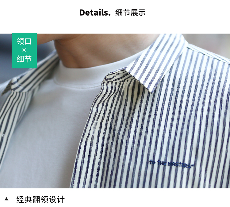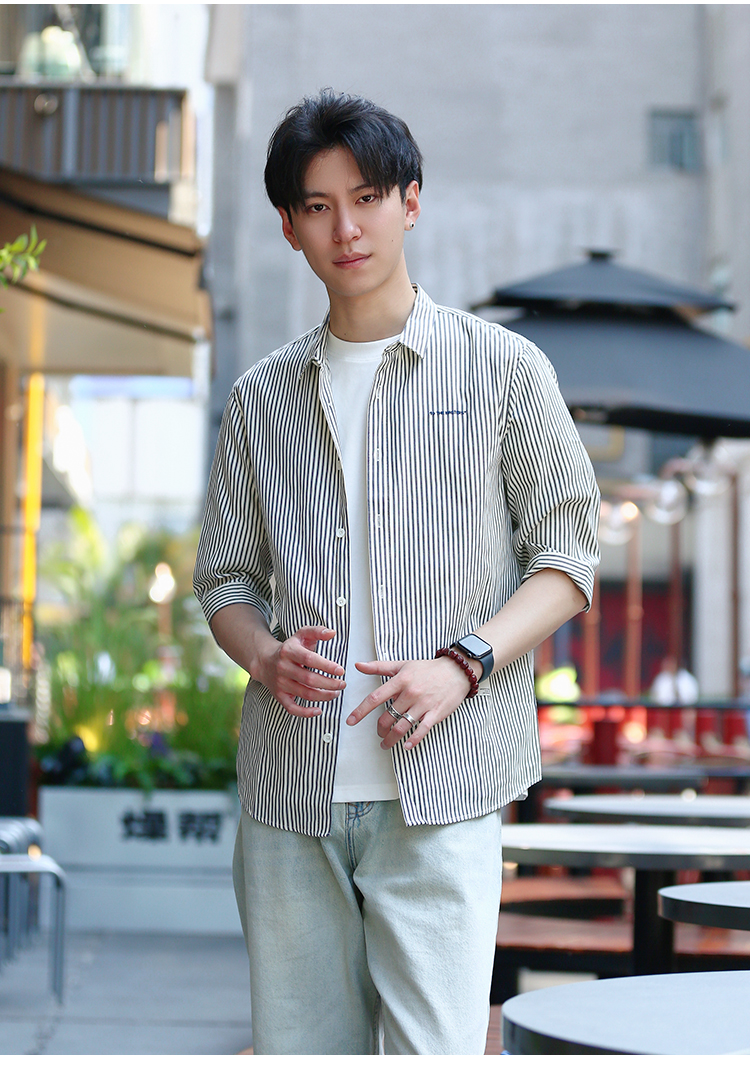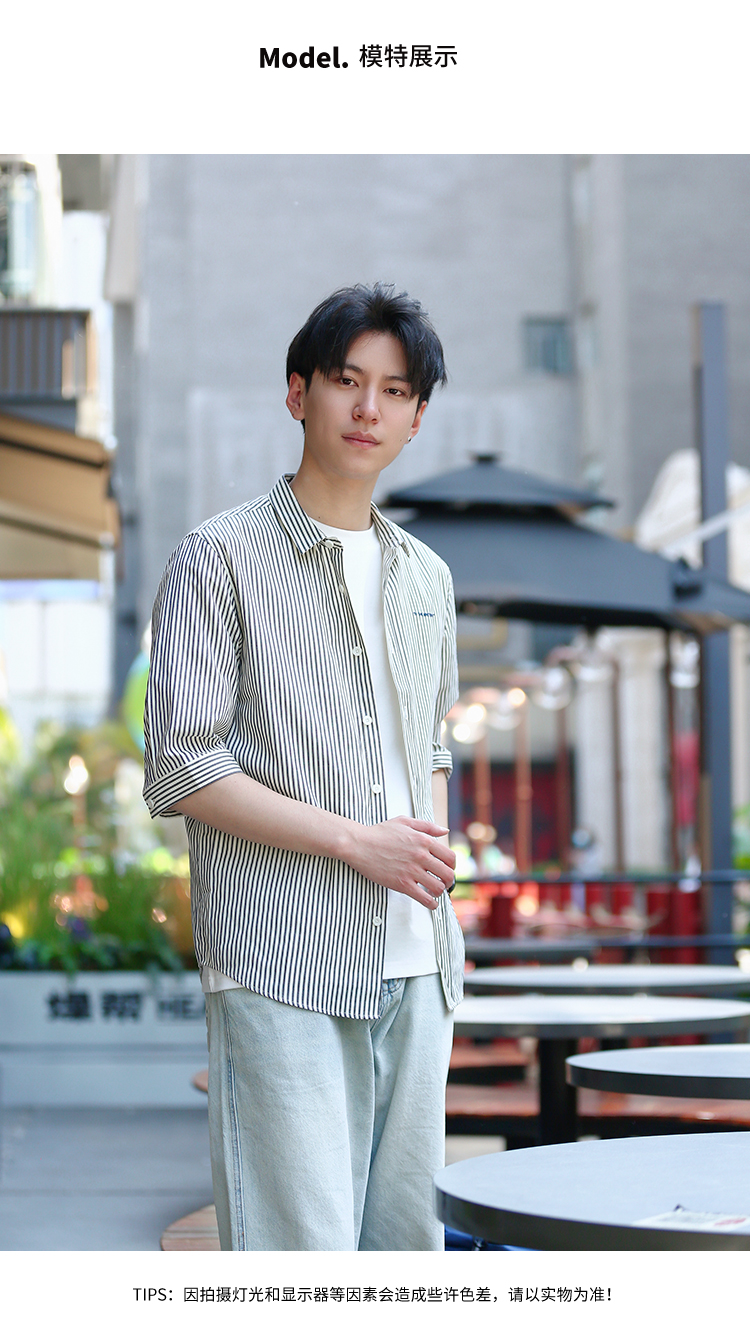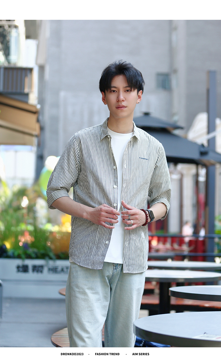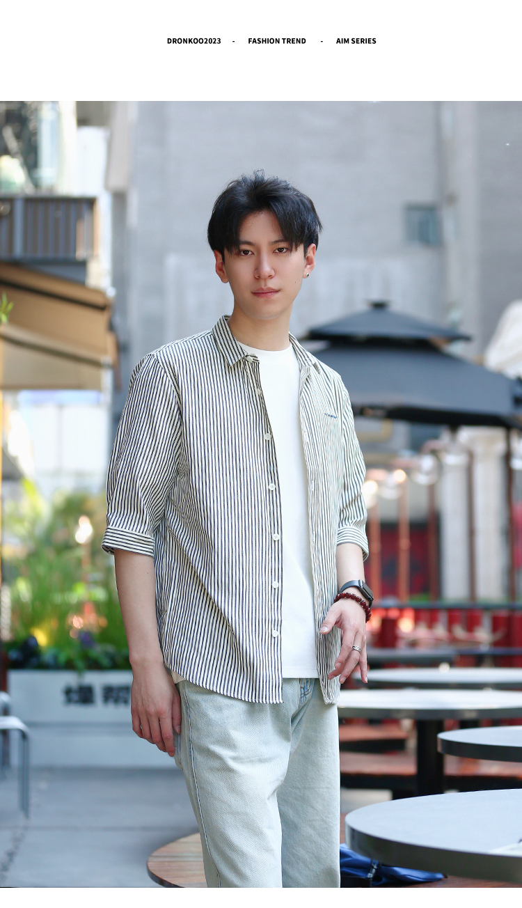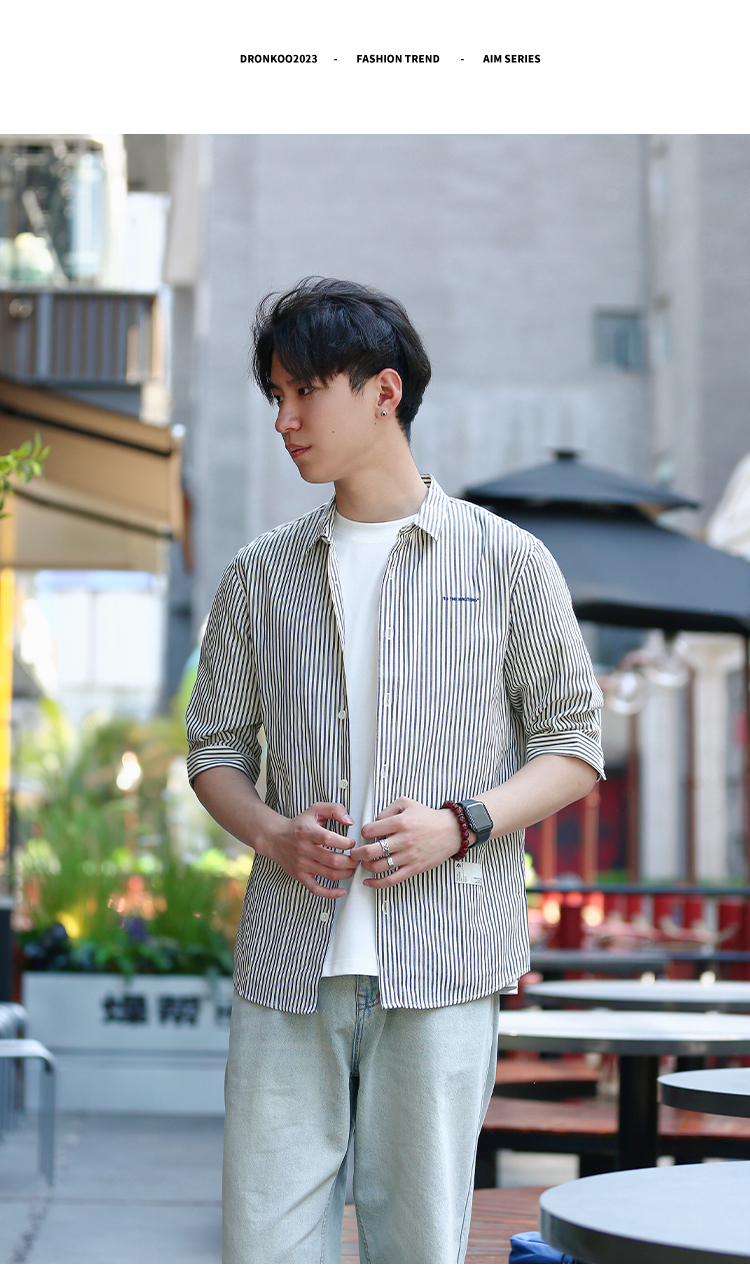 DRONKOO 2024 翻领左胸刺绣字母下贴标条纹修身中袖衬衣