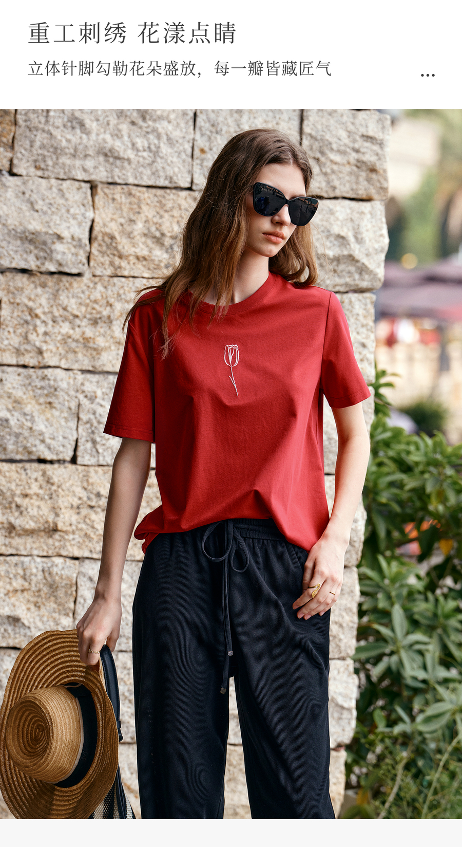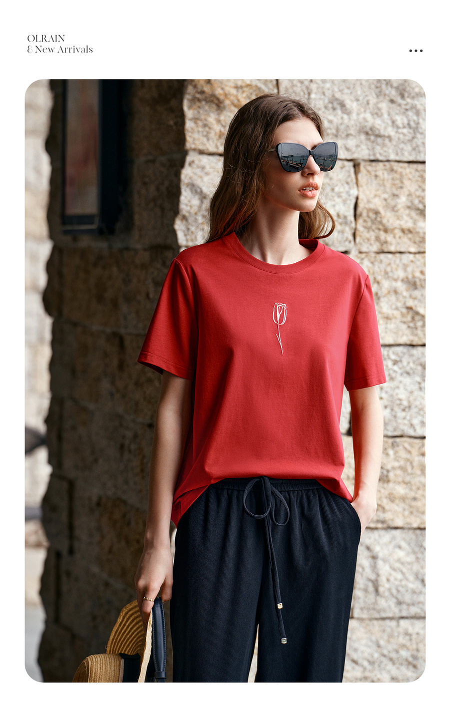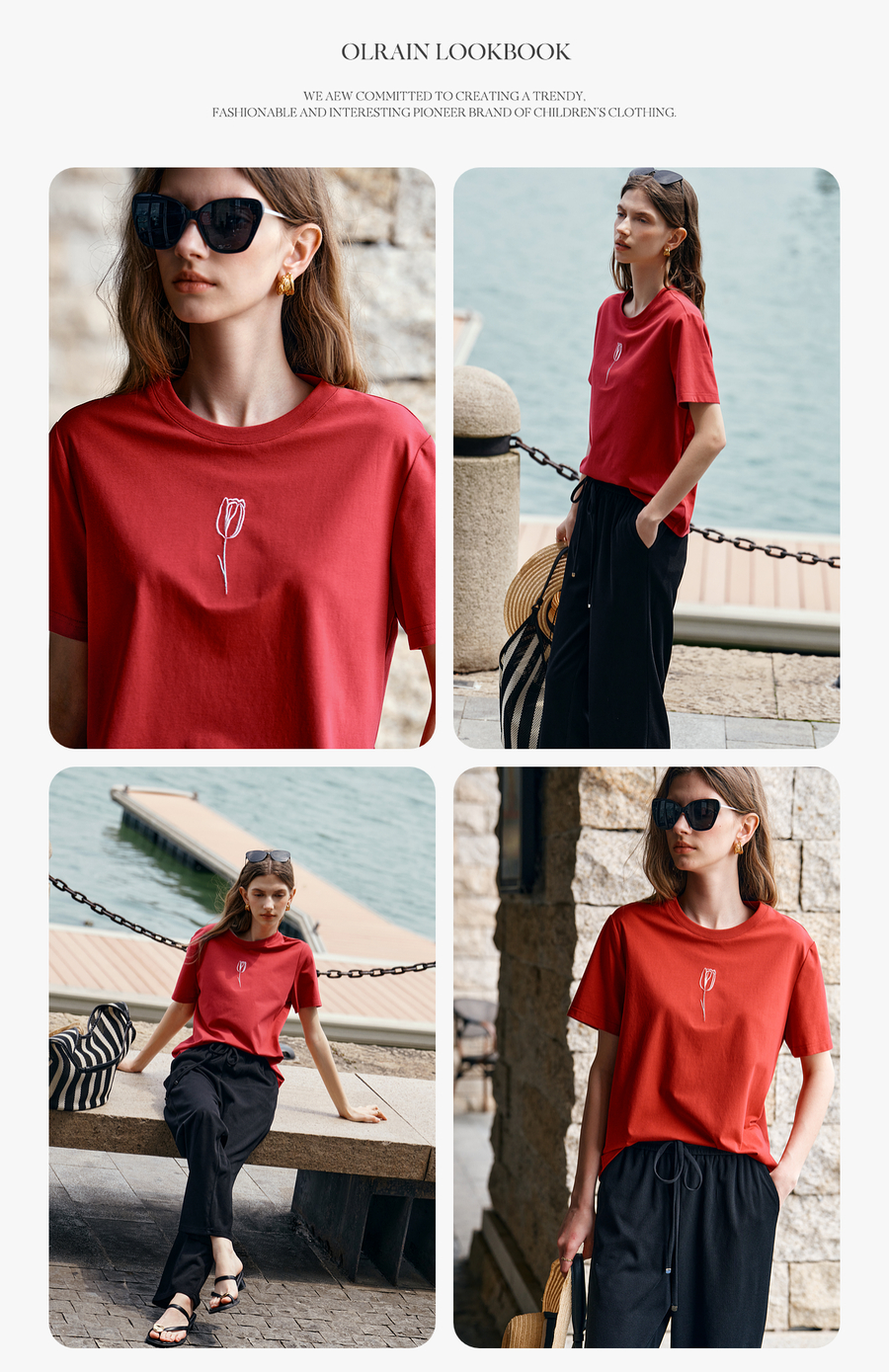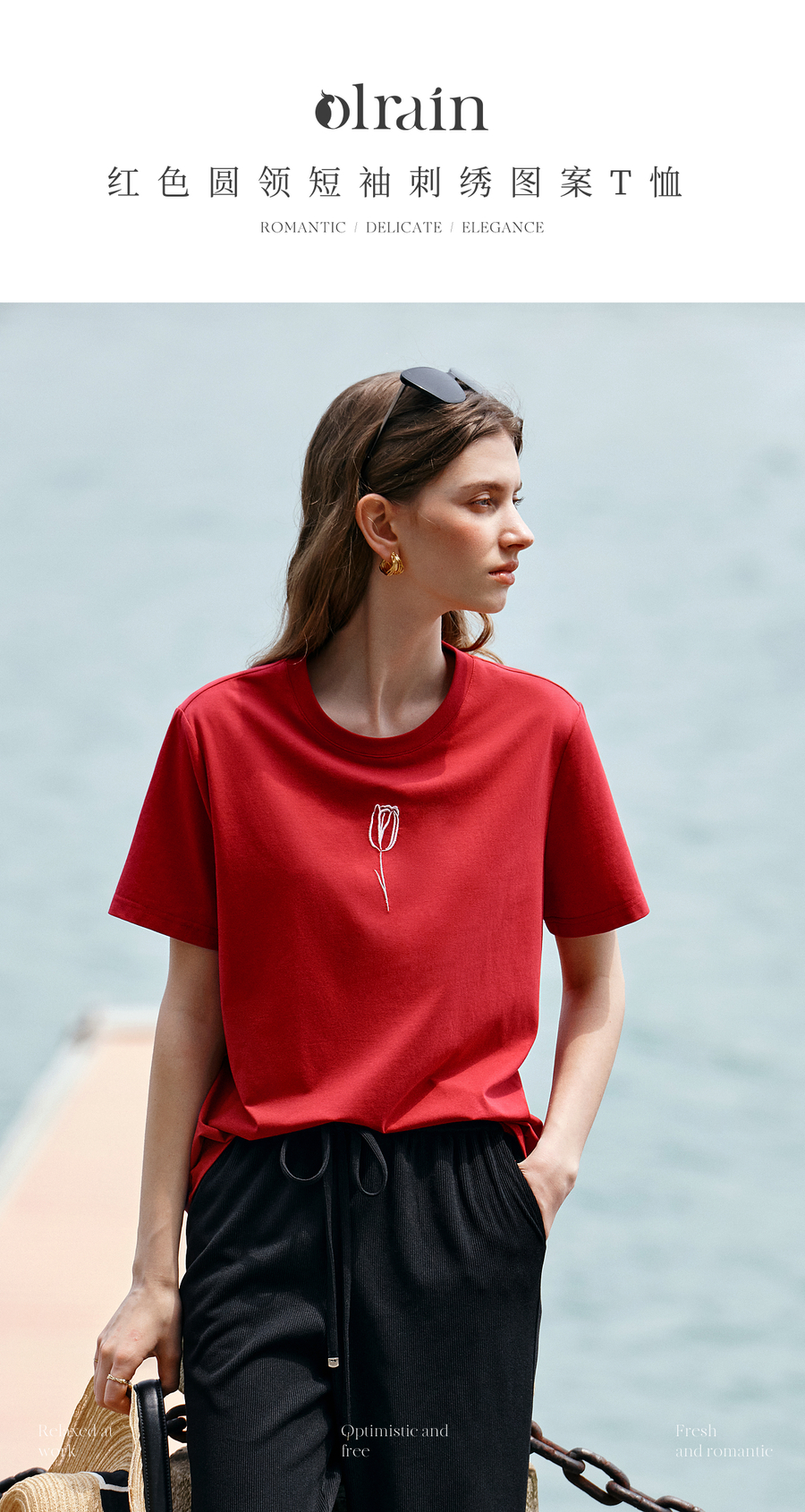 OLrain欧芮儿红色圆领短袖刺绣图案T恤女夏季2025年新款休闲上衣