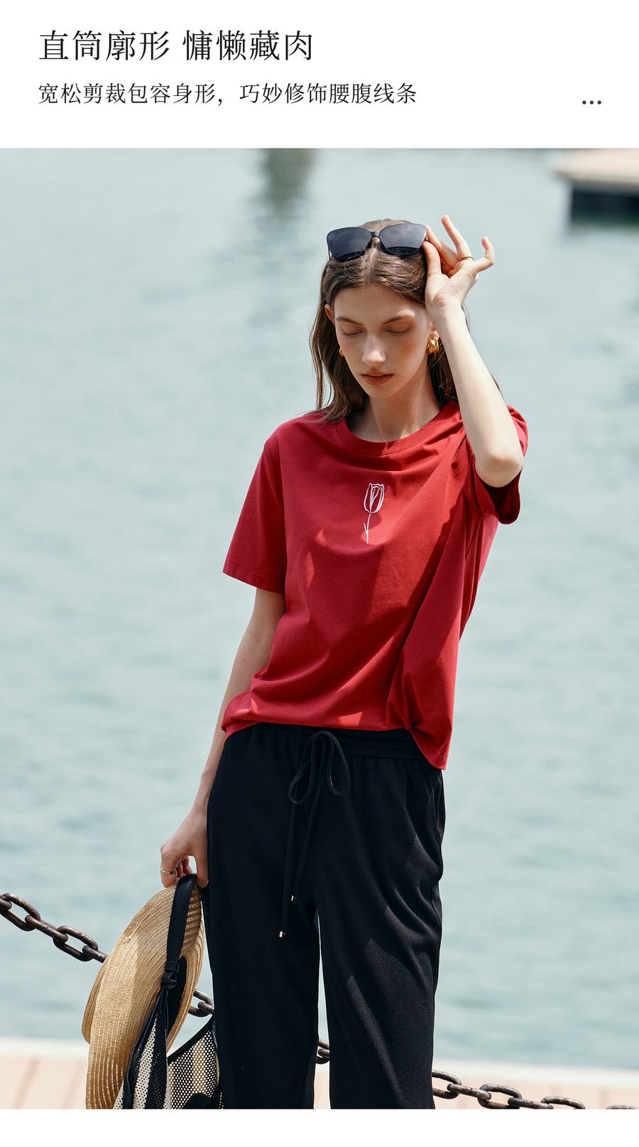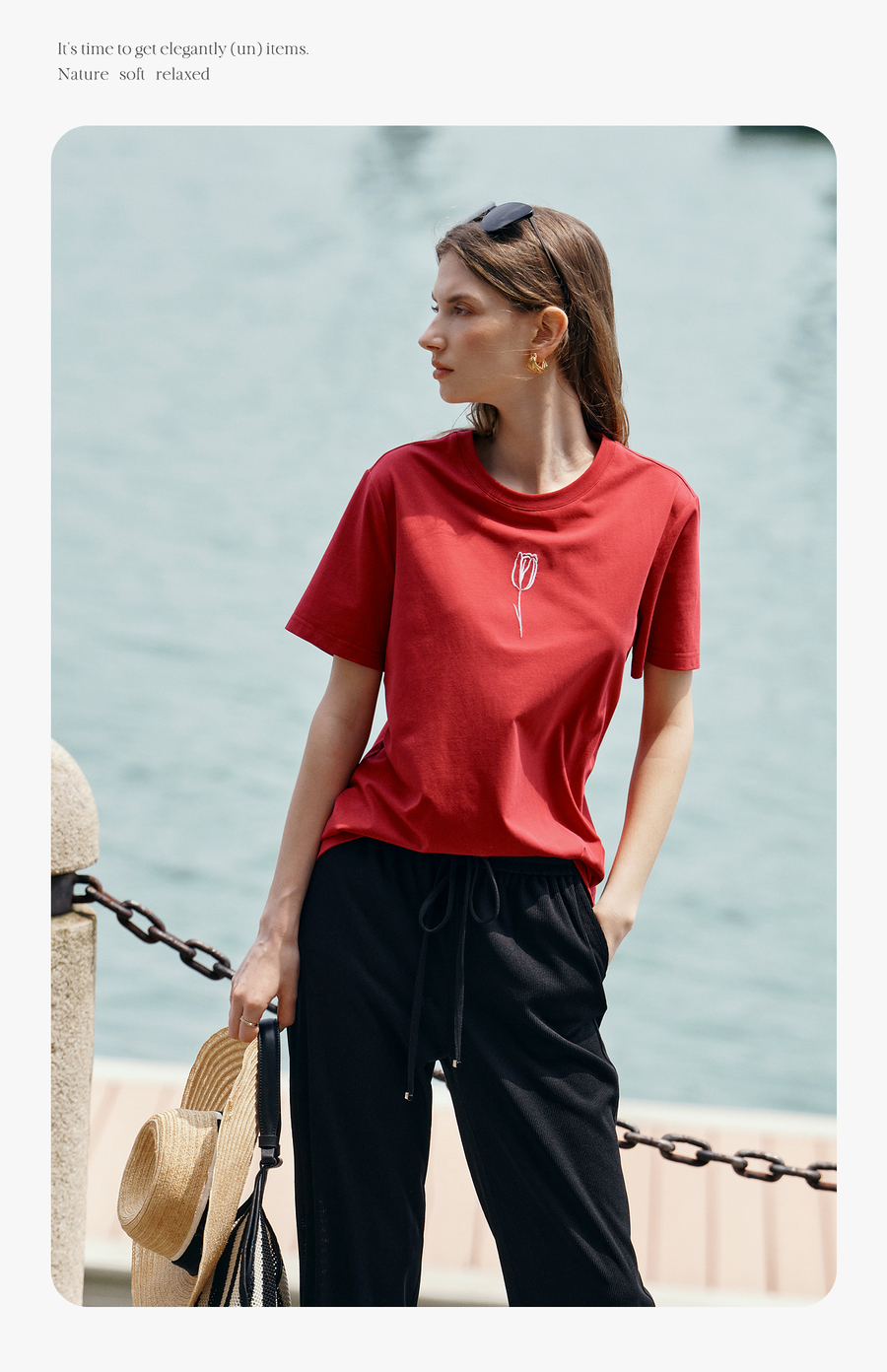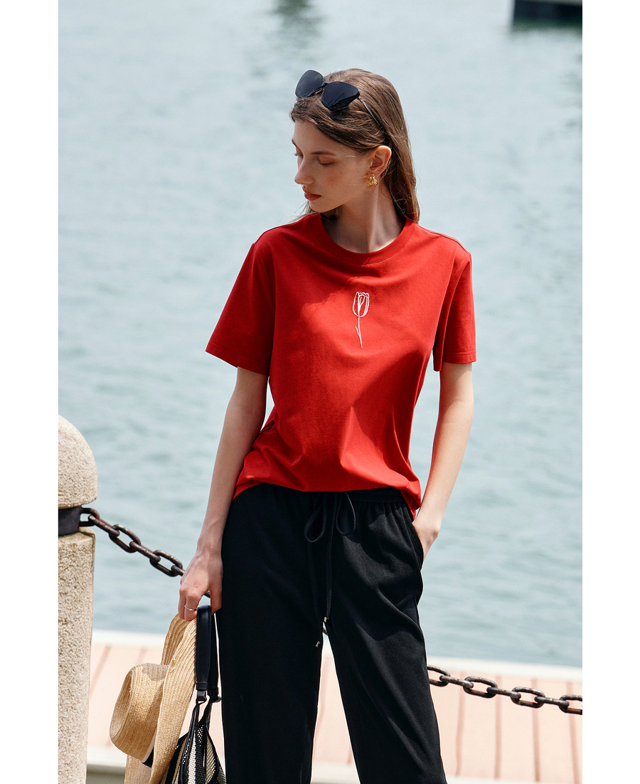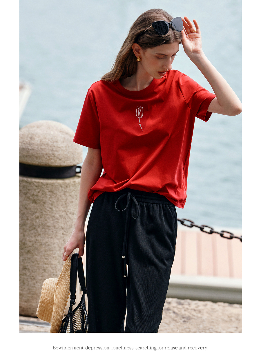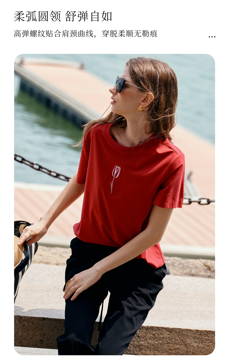 OLrain欧芮儿红色圆领短袖刺绣图案T恤女夏季2025年新款休闲上衣