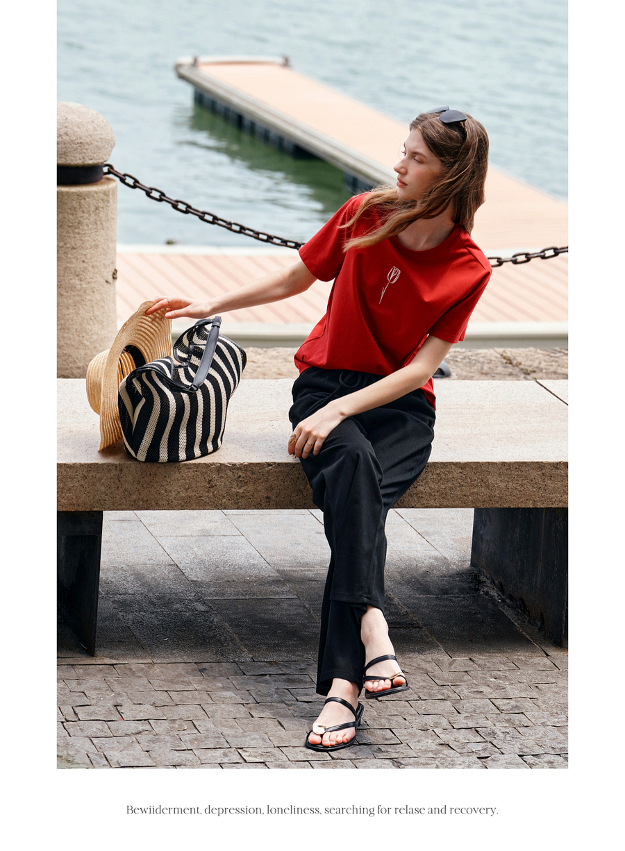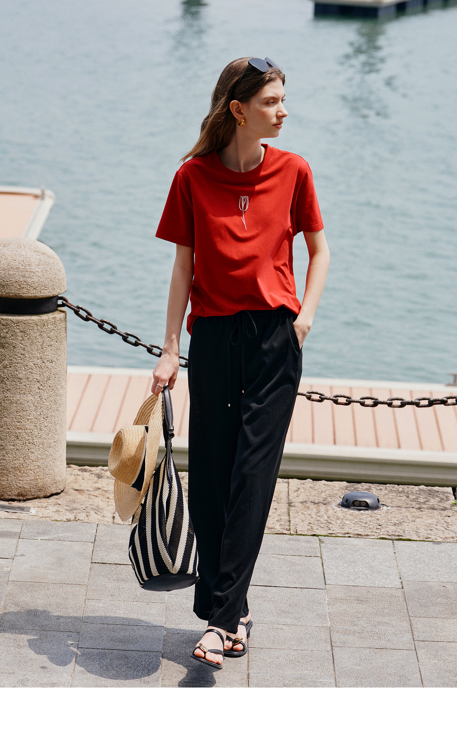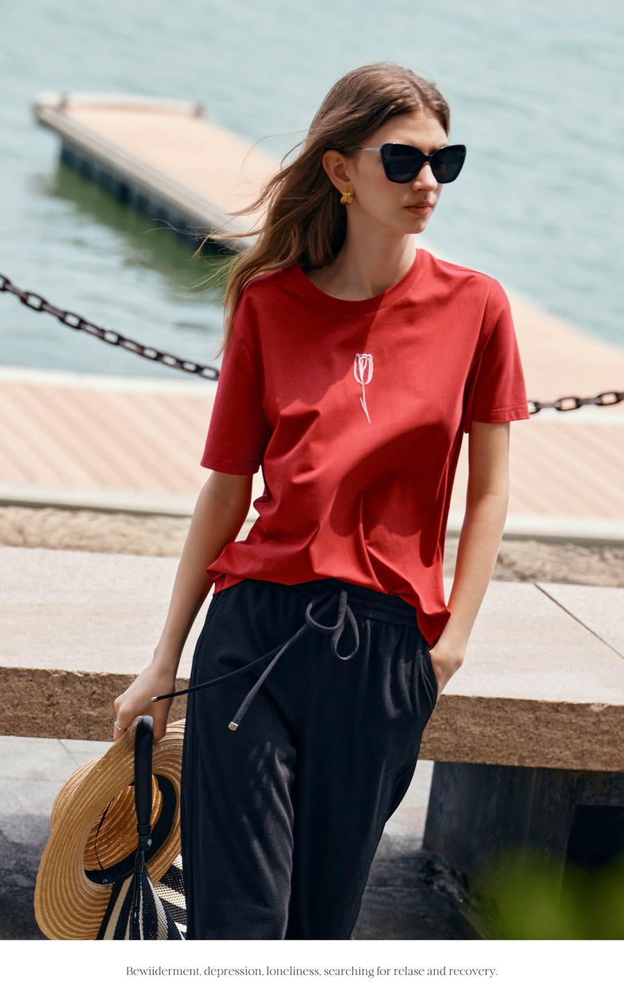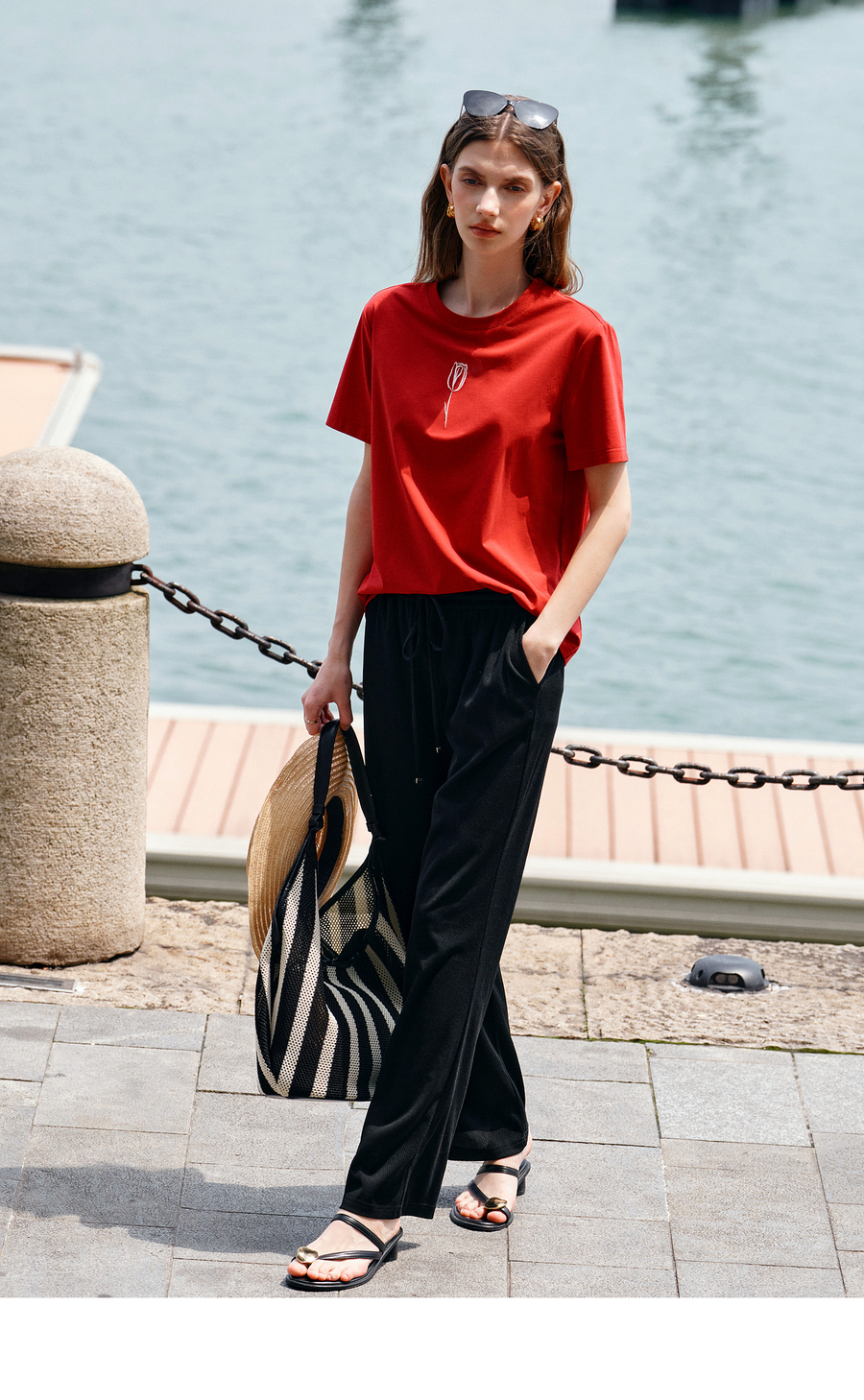 OLrain欧芮儿红色圆领短袖刺绣图案T恤女夏季2025年新款休闲上衣