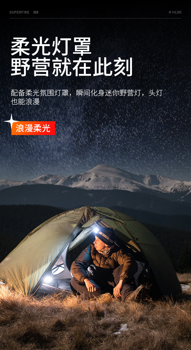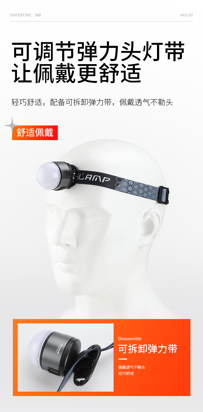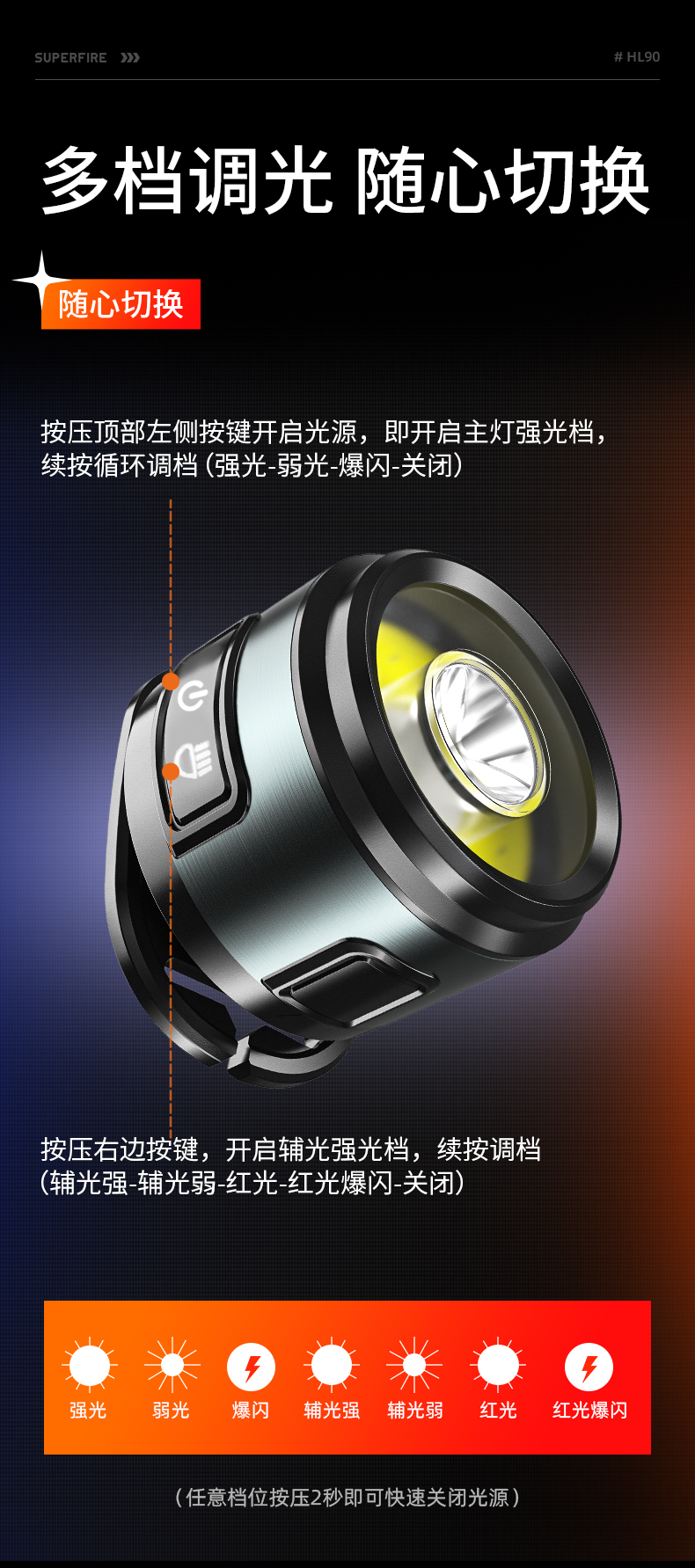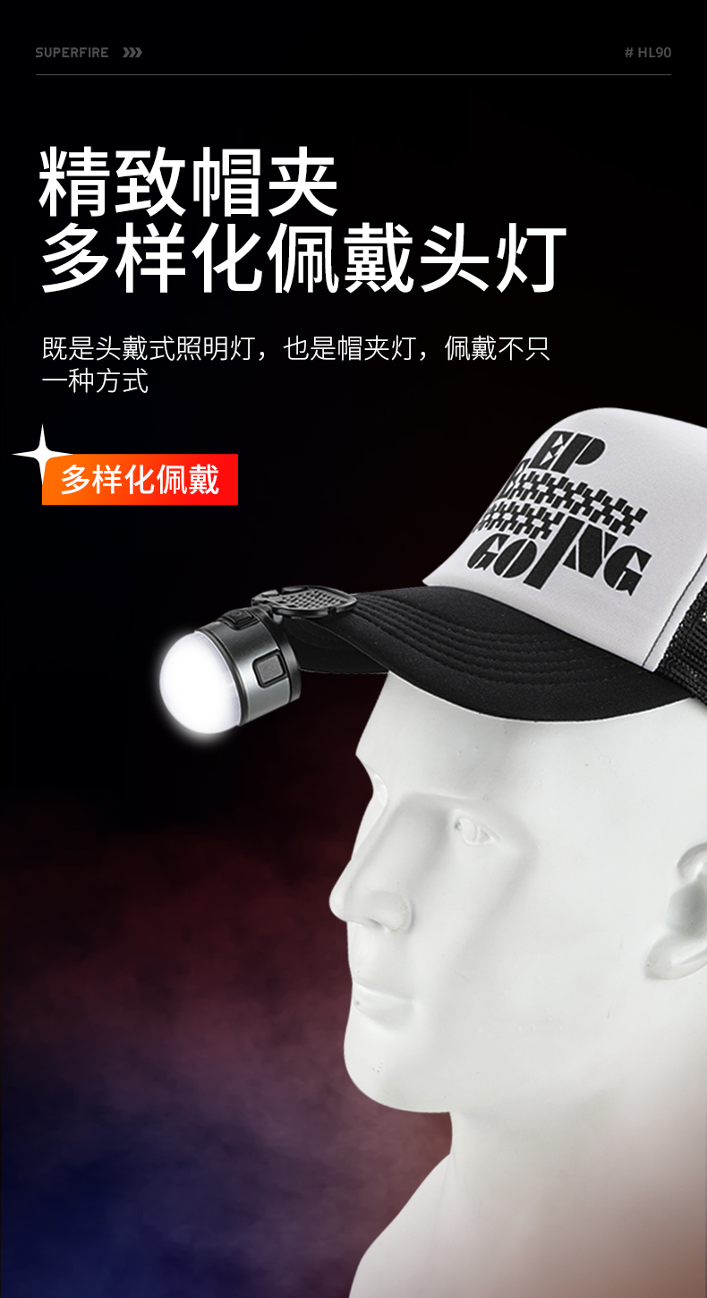SUPERFIRE神火HL90头灯超轻头戴式充电迷你户外野钓帽夹夜钓灯