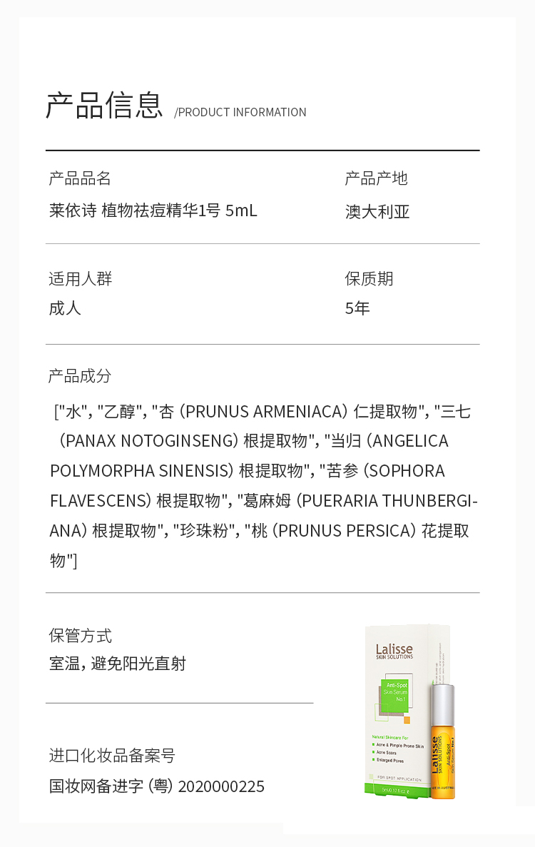 澳洲进口 Lalisse莱依诗 植物祛痘精华 5mL 1号日常巩固;2号集中对应 / 洁面啫喱100g