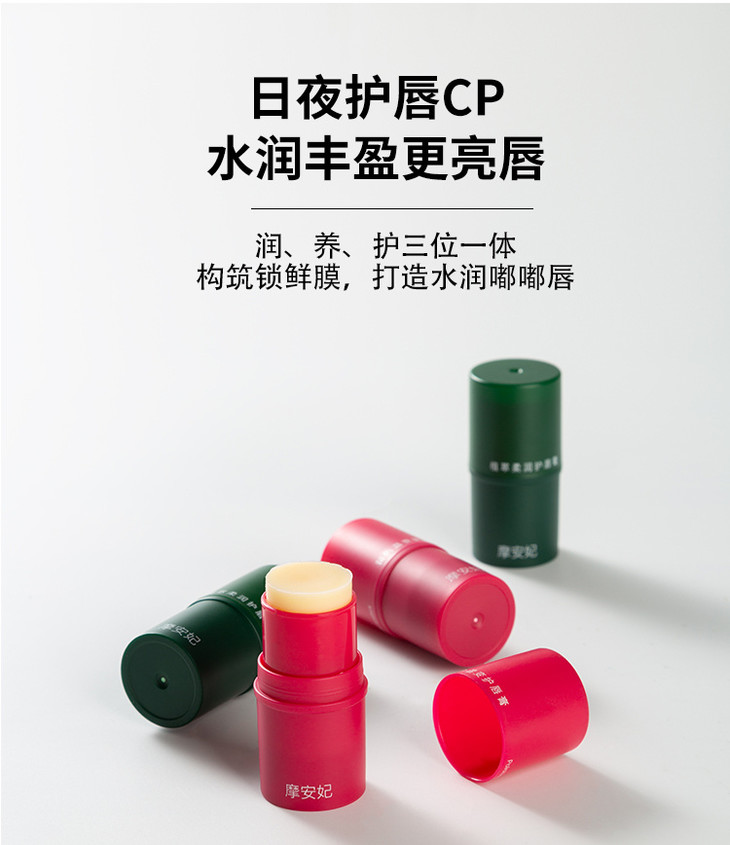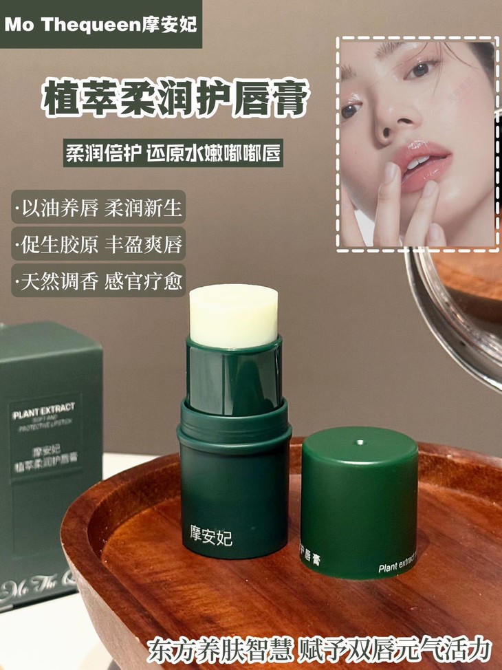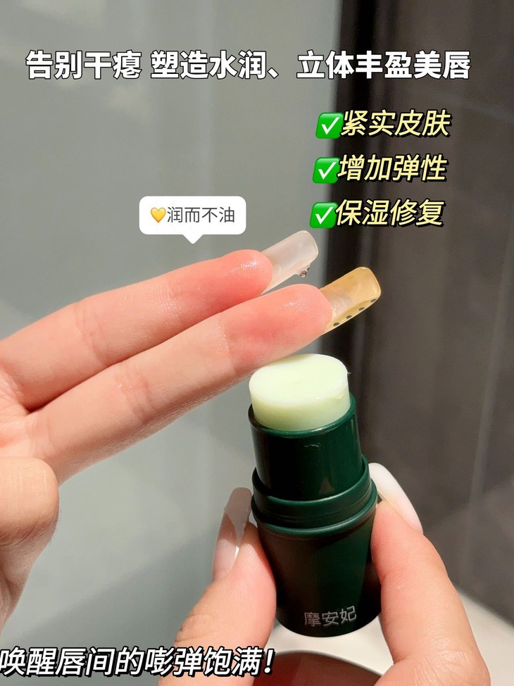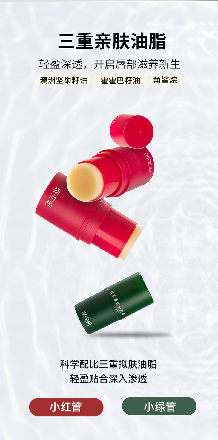 摩安妃·植萃柔润护唇膏 柔润倍护 还原水嫩嘟嘟唇 • 01 以油养唇,柔润新生 澳洲坚果籽油、霍霍巴籽油与角鲨烷 三重亲肤油脂轻盈贴合 深入滋养唇部肌底,同步形成锁水薄膜持久 防御水分流失,有效改善干燥、起皮 令双唇终日柔润饱满 • 02 促生胶原 ,丰盈双唇 玻色因刺激真皮层糖胺聚糖和胶原蛋白的生成 从根源撑起饱满唇形,让双唇自带自然丰盈感 • 03东方养肤智慧,赋予双唇元气活力 融入麒麟竭、铁皮石斛茎、紫草根三重植萃 龙血竭改善唇纹与干裂;铁皮石斛蕴含多糖精华 为干燥的双唇注入充沛水分;紫草改善唇部肌肤不适,三重滋养让双唇重拾元气活力 • 04天然调香,感官疗愈 唇部护理 清新柚果皮油调香,每一次涂抹仿佛一场 嗅觉 SPA,天然香气轻拂疲惫 润唇亦润心!尽享片刻宁静与愉悦