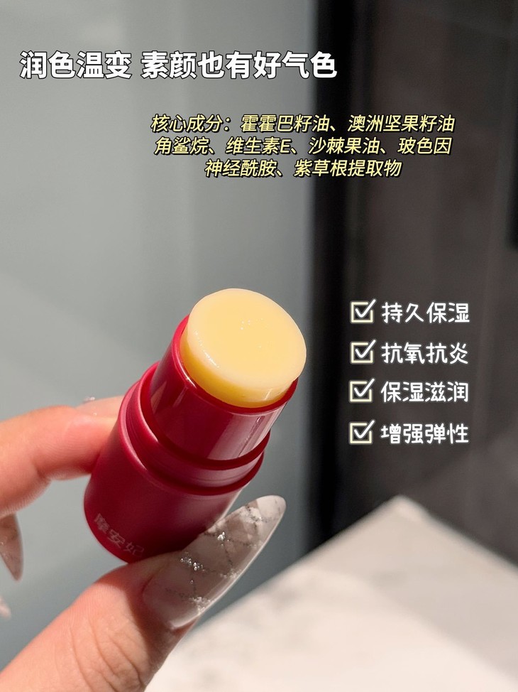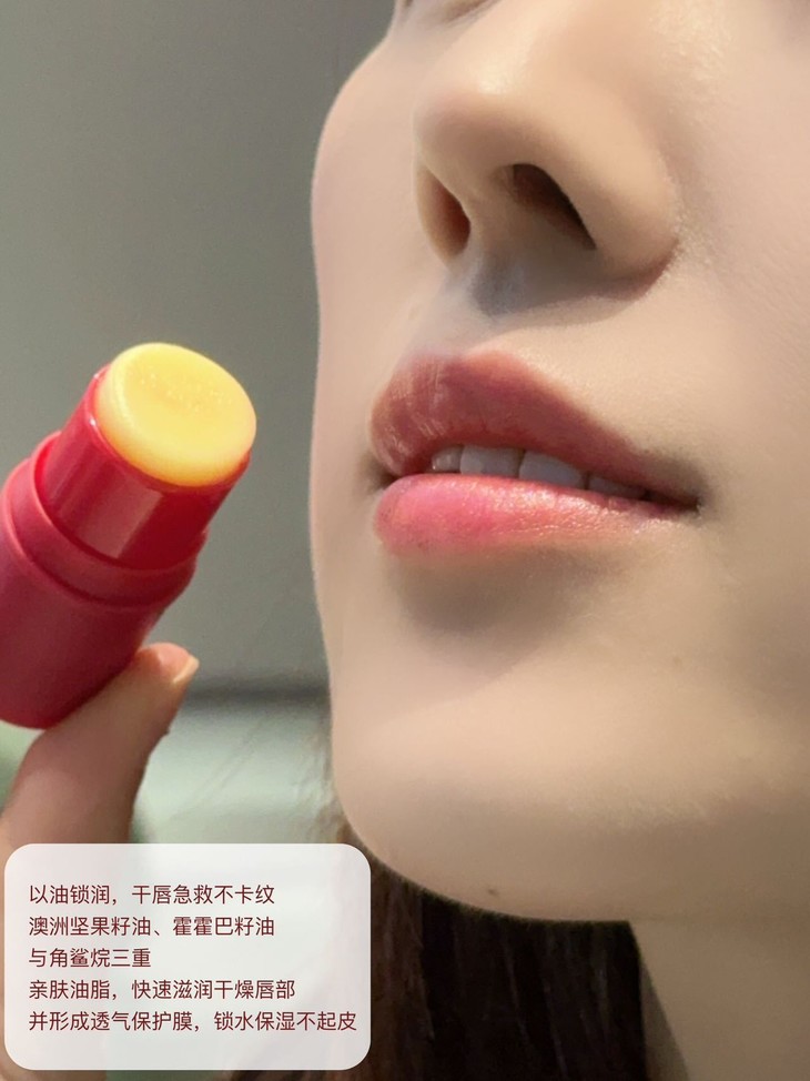 ★更绝的是它的“隐藏buff”成分! ●加了德国进口的沙棘果油—— 被称为“世界维C之王”,比普通维C还鲜活, 长期用能悄悄淡化唇纹暗沉; ●还有麒麟竭提取物和铁皮石斛, 都是维稳修护的好东西, 像我这种换季唇炎容易犯的人, 用它都能安安稳稳度过; ●紫草提取液还能舒缓泛红, 平时咬到嘴唇涂一点,修护力拉满!