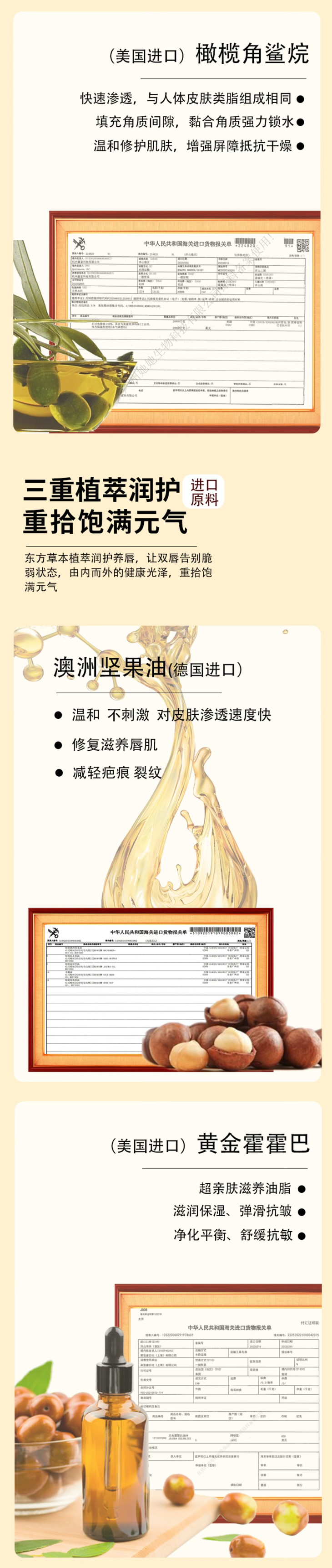 ▶以油锁润,干唇急救不卡纹 ▶澳洲坚果籽油、霍霍巴籽油与角鲨烷 ▶均是进口成分! ▶两大专利: 植物甾醇类(中国专利) 专利号:ZL 2012 10019987.2 角鲨烷(中国专利) 专利号:ZL2021 1 1334606.5