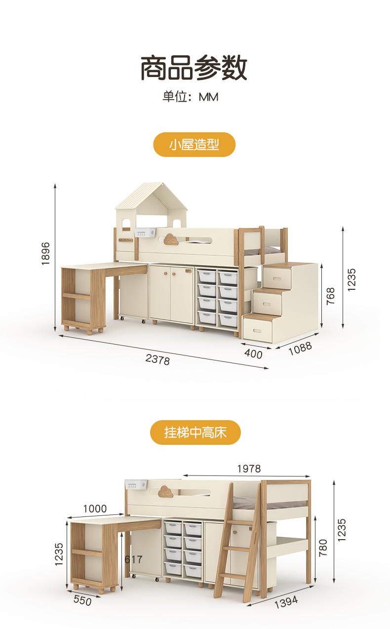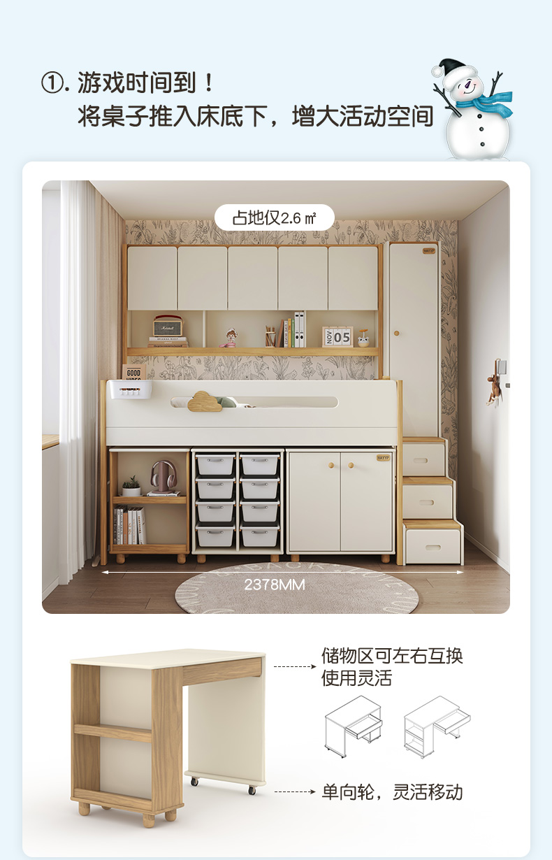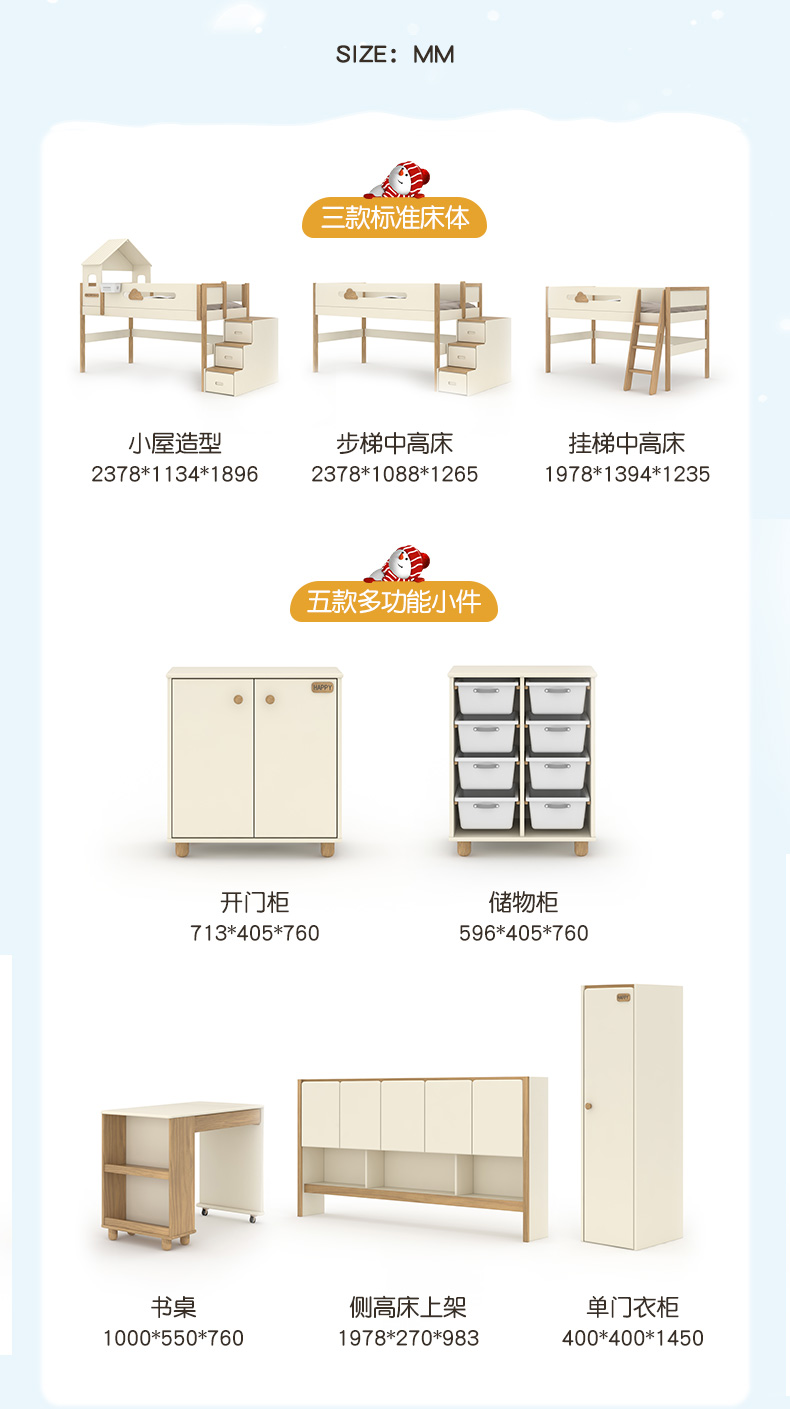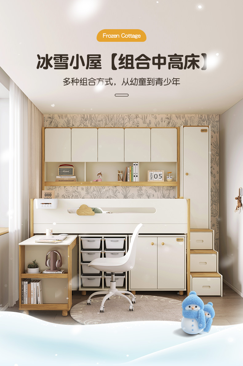 喜梦宝小屋儿童床带书桌收纳储物多功能半高床书柜床衣柜床冰雪小屋系列