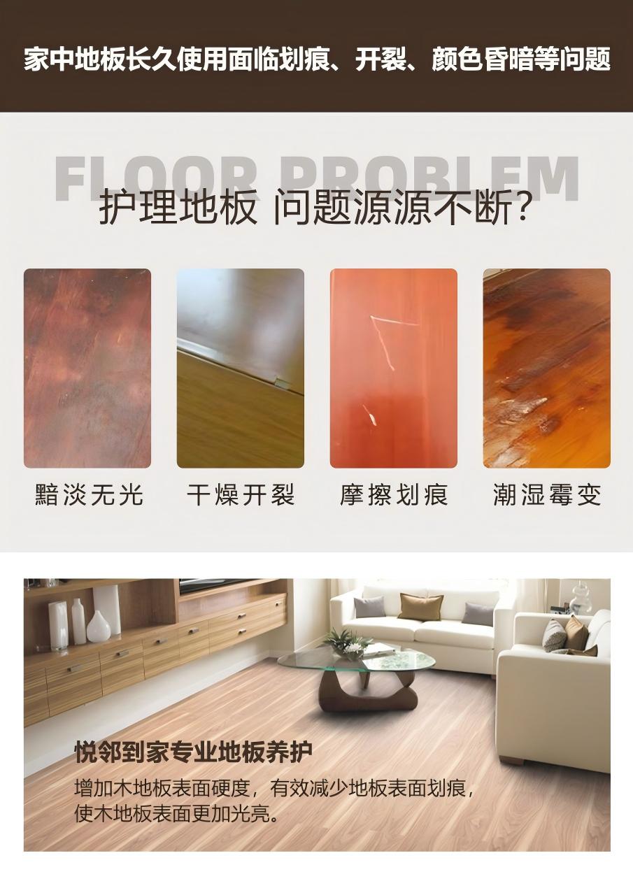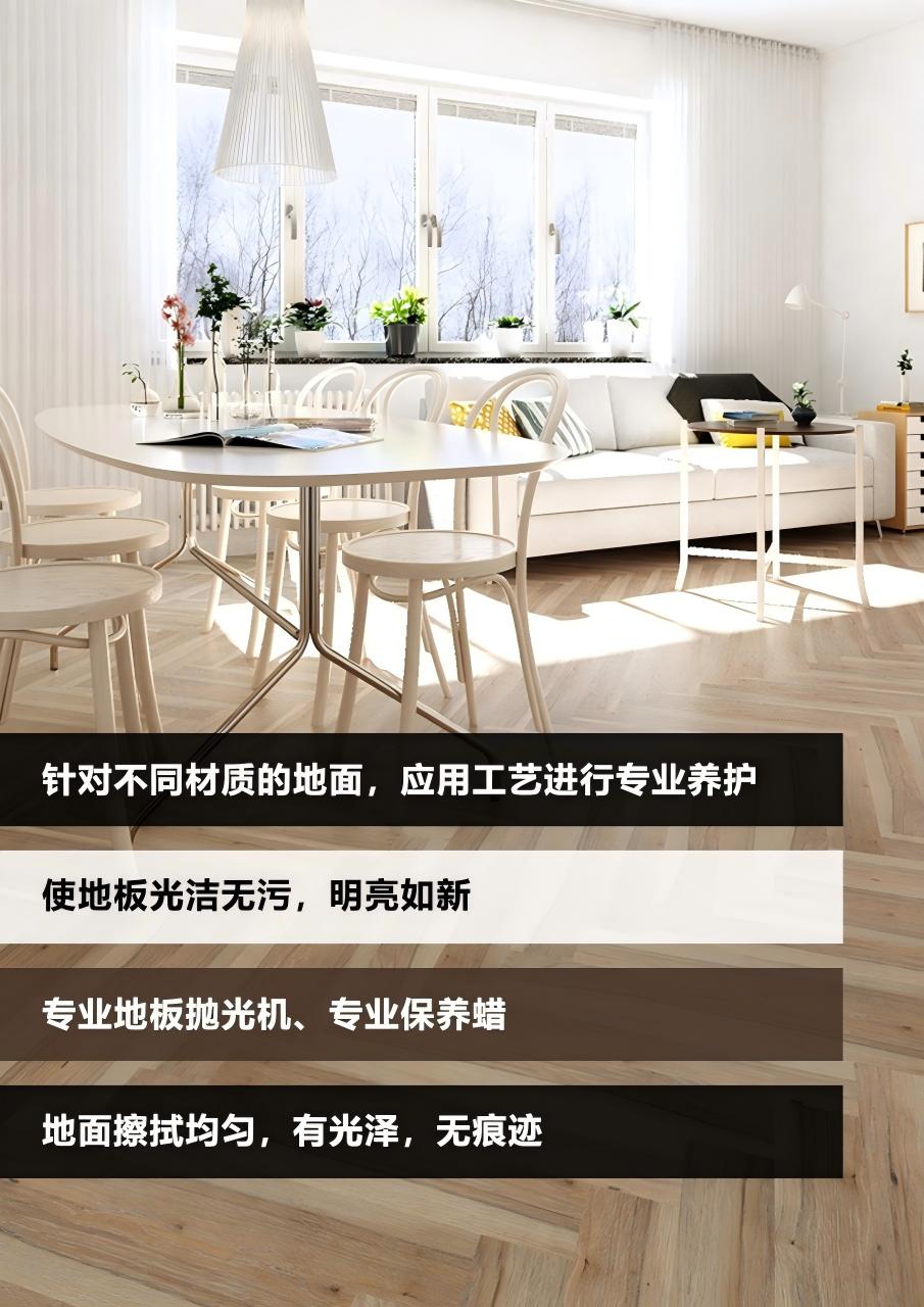 产品说明:使用专业进口蜡—博纳品牌地板蜡,对地板表面擦拭,形成保护模,使地板光亮,延长使用受命,30平起做,不足30平按30平收费