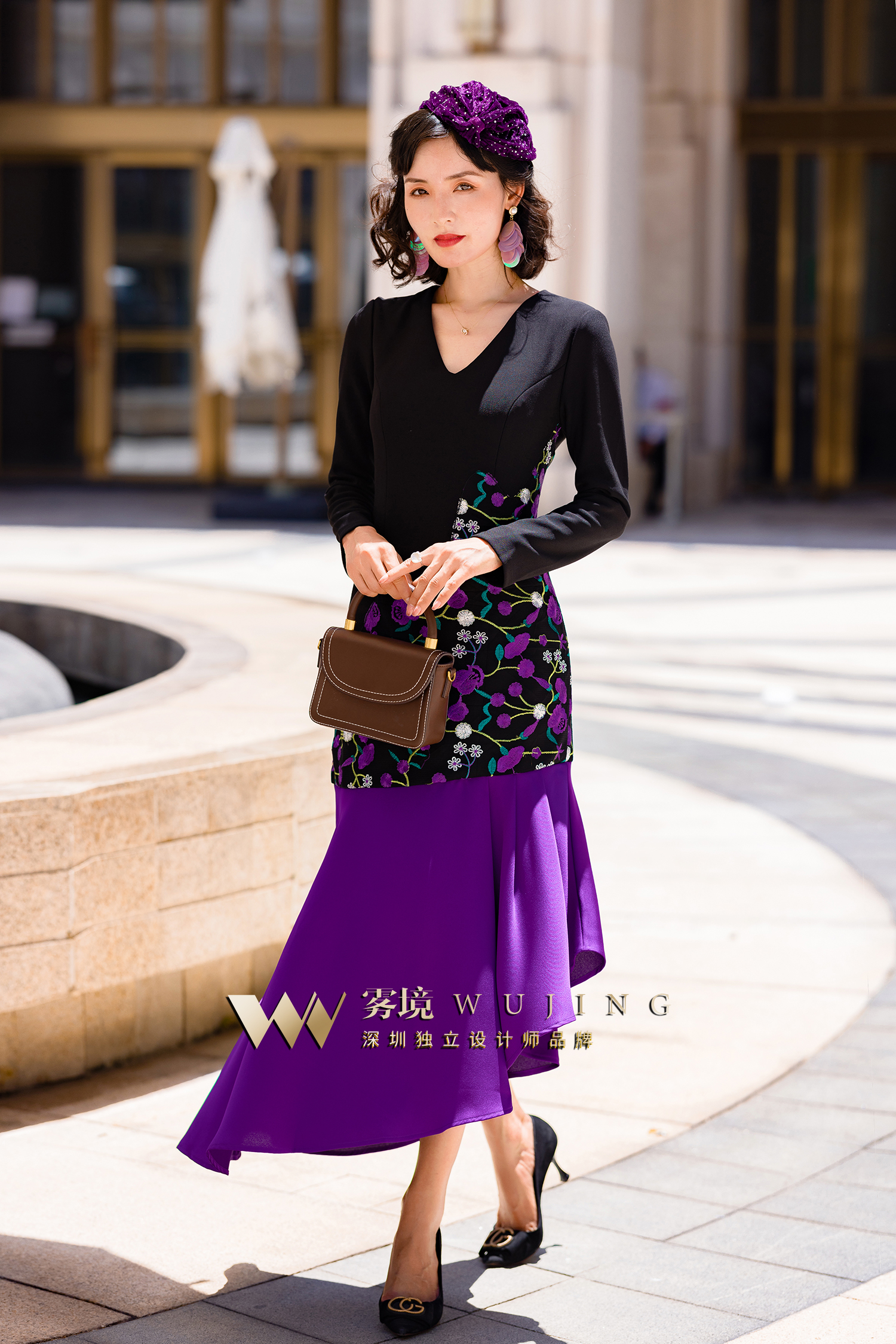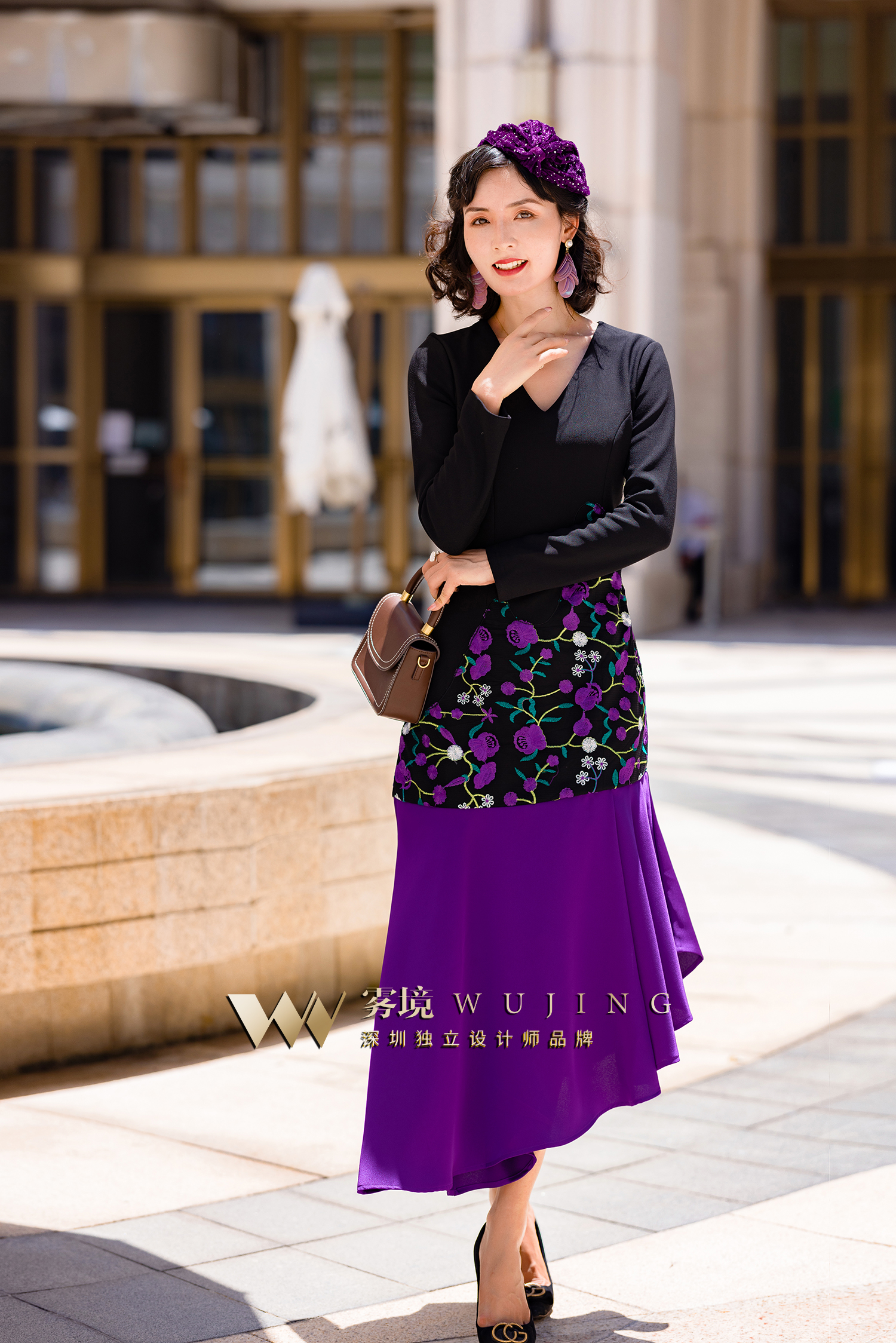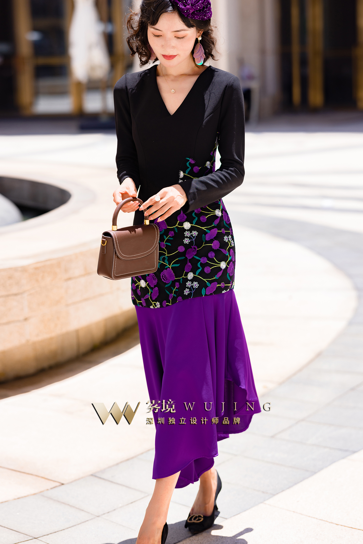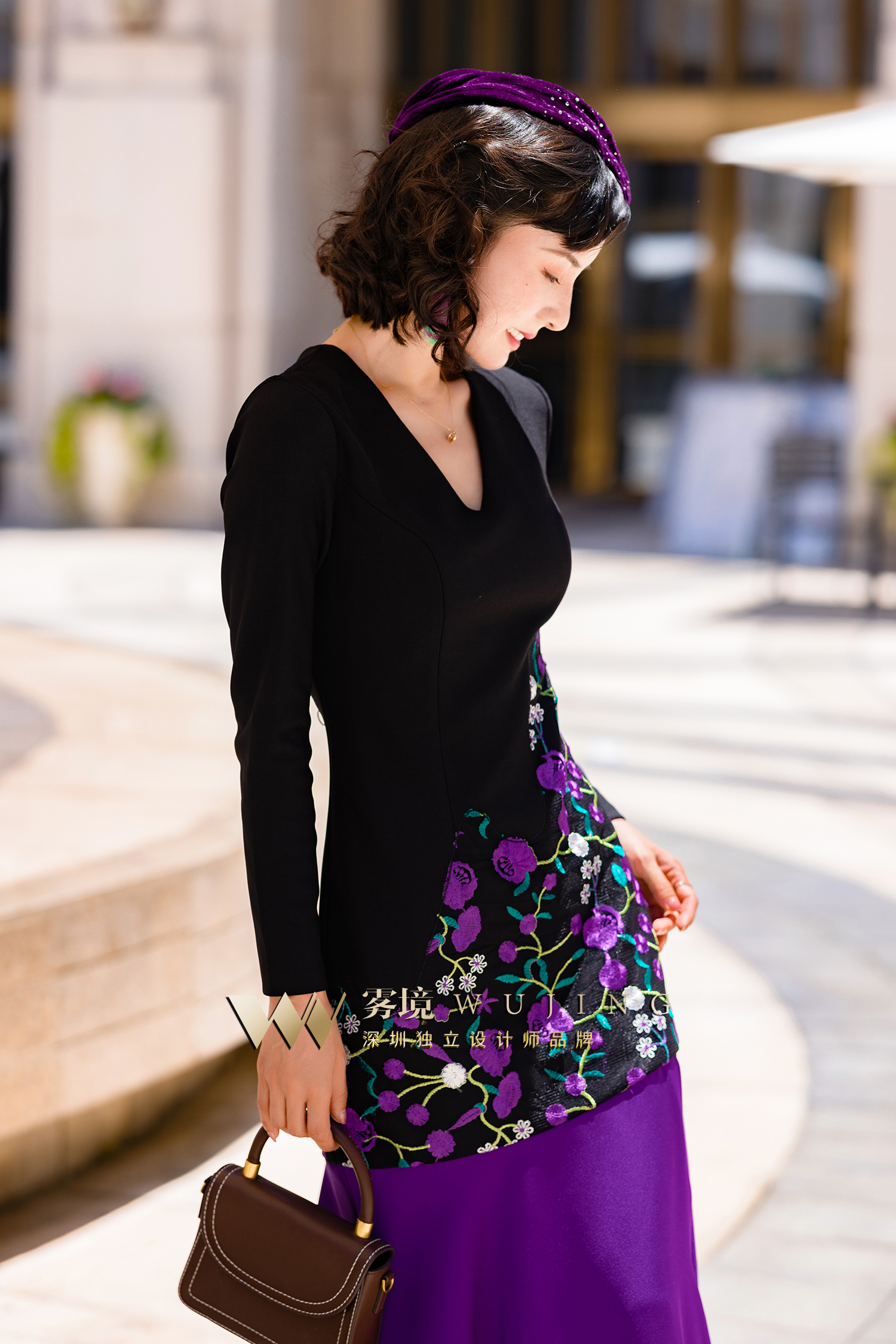 2202176 青都紫薇 双层高弹乱麻 醋酸缎 定制绣花料连衣裙 雾境
