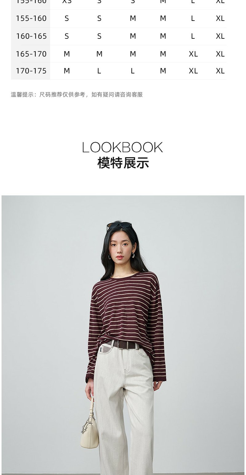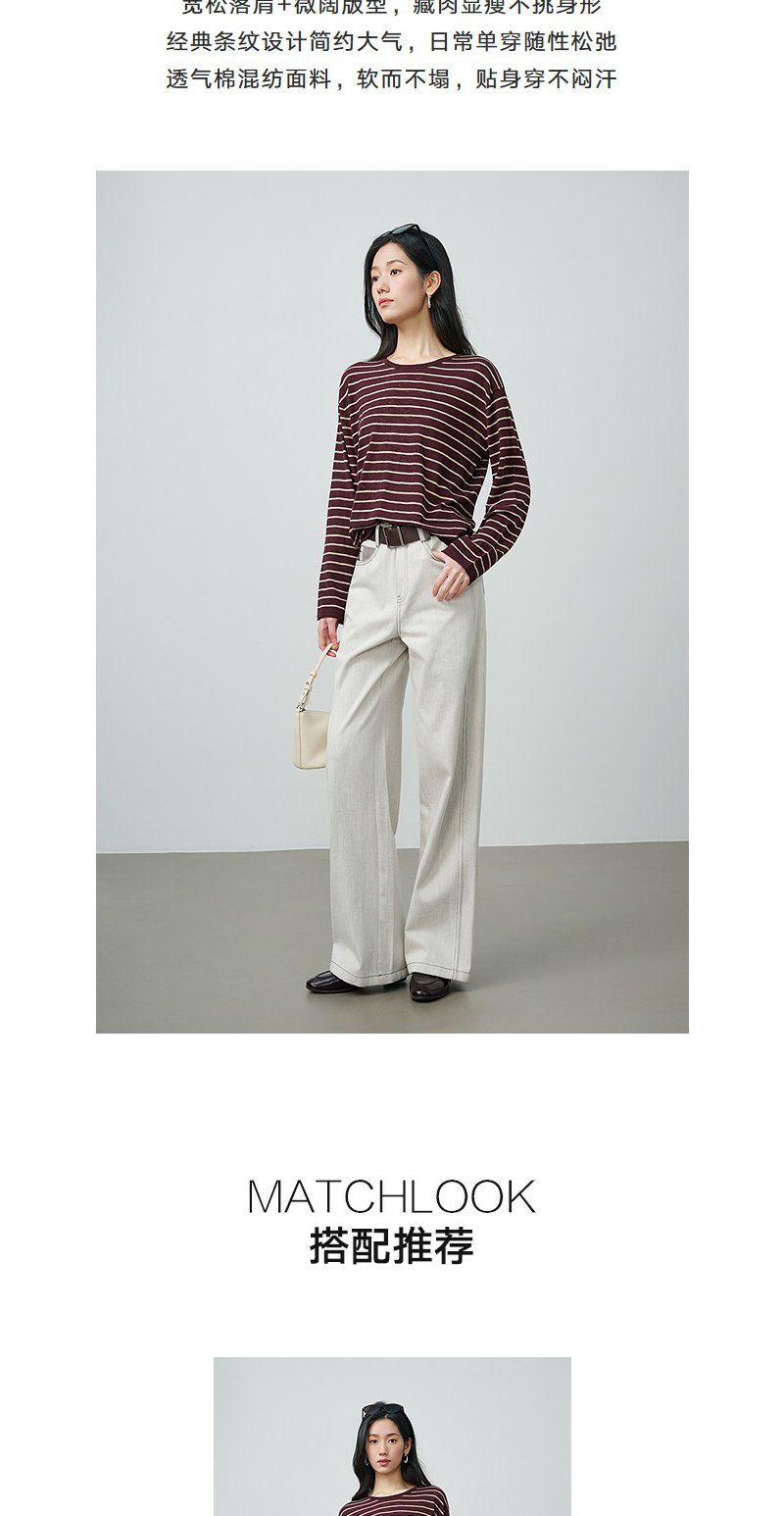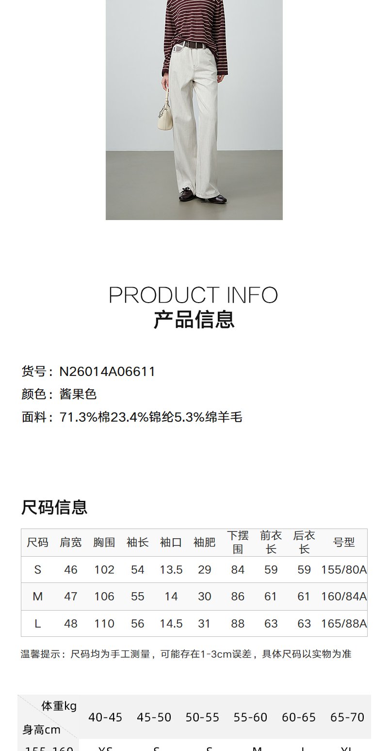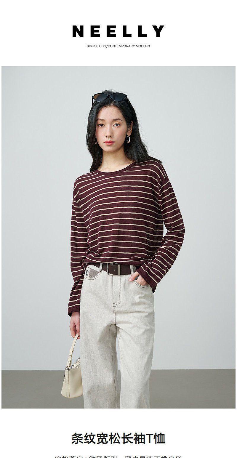 NEELLY纳俪商场同款春季新款复古条纹圆领撞色T恤女简约随性上衣N26014A06611