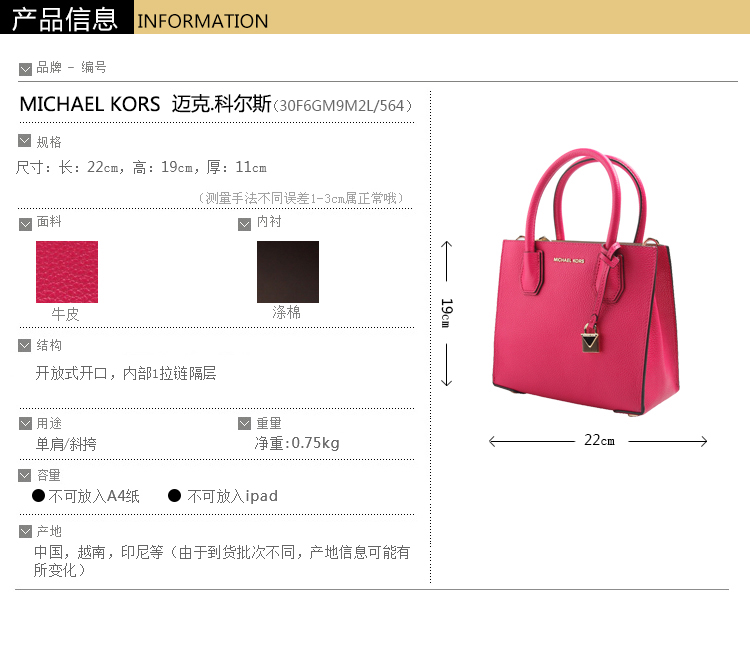 Michael Kors/迈克·科尔斯 MK女士CYNTHIA系列牛皮时尚单肩手提包 30T8TCYS2L DX