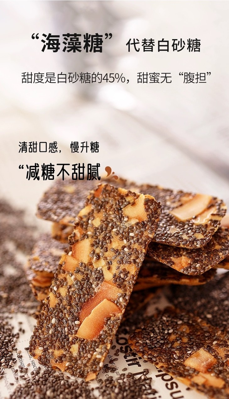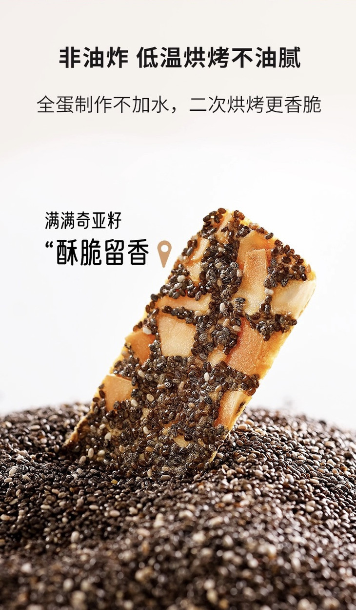 🤎清甜口感,“减糖不甜腻” 配料表中还用“海藻糖”代替白砂糖! 甜度降低了,热量也降低了! 整体香脆清爽,口感比较清淡, 金黄脆饼叠加饱满奇亚籽仁,是纯谷物的味道!