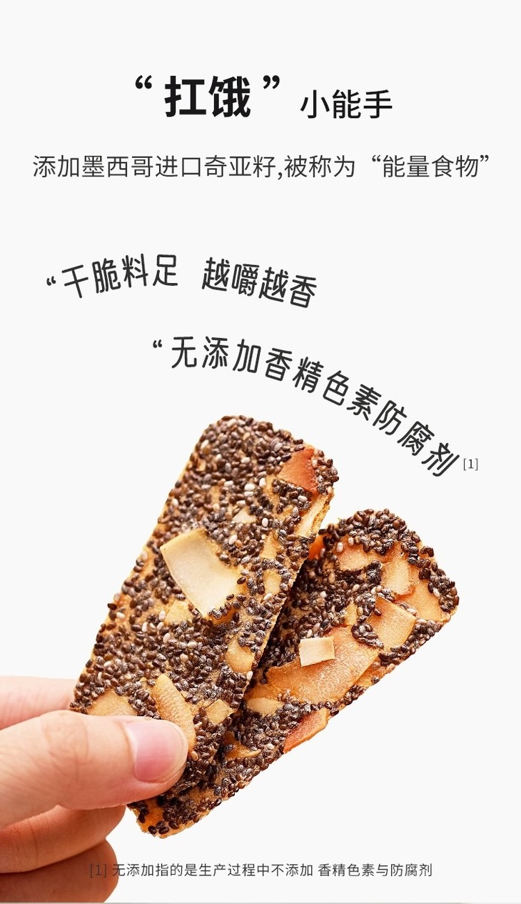 干脆料足,越嚼越香! 一片饼干上满满奇亚籽, 颗颗分明,这种咀嚼感太满足了! 奇亚籽吸水能力很强, 遇水膨胀变大变重, 瞬间就能获得较强的饱腹感。 ➕饼体加入了椰子片, 自然椰香与谷物香并行,奶香肆意迸发。 整体的那种焦香、脆香,会酥到你骨子里去。
