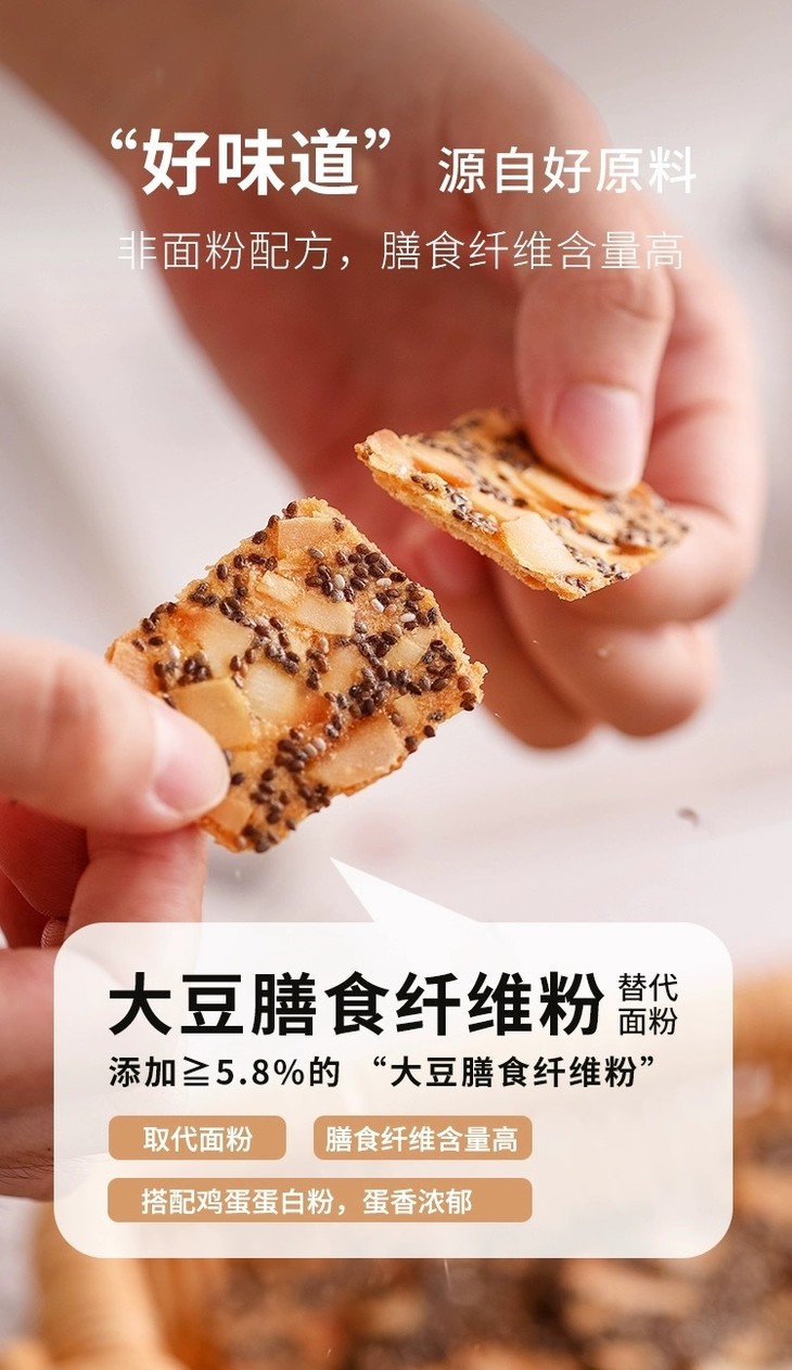 🤎非面粉配方,膳食纤维加倍! 添加≥5.8的大豆膳食纤维, 摒弃原本的面粉配方, 还能闻到饼干的豆香味哦~ 焦黄酥脆的饼干, 混合浓郁的蛋奶香, 和谷物的自然清香。 轻轻一掰, 酥脆得奇亚籽仁都往外蹦跶~ 吃了一块还想再吃第二块, 完全停不下来的节奏。