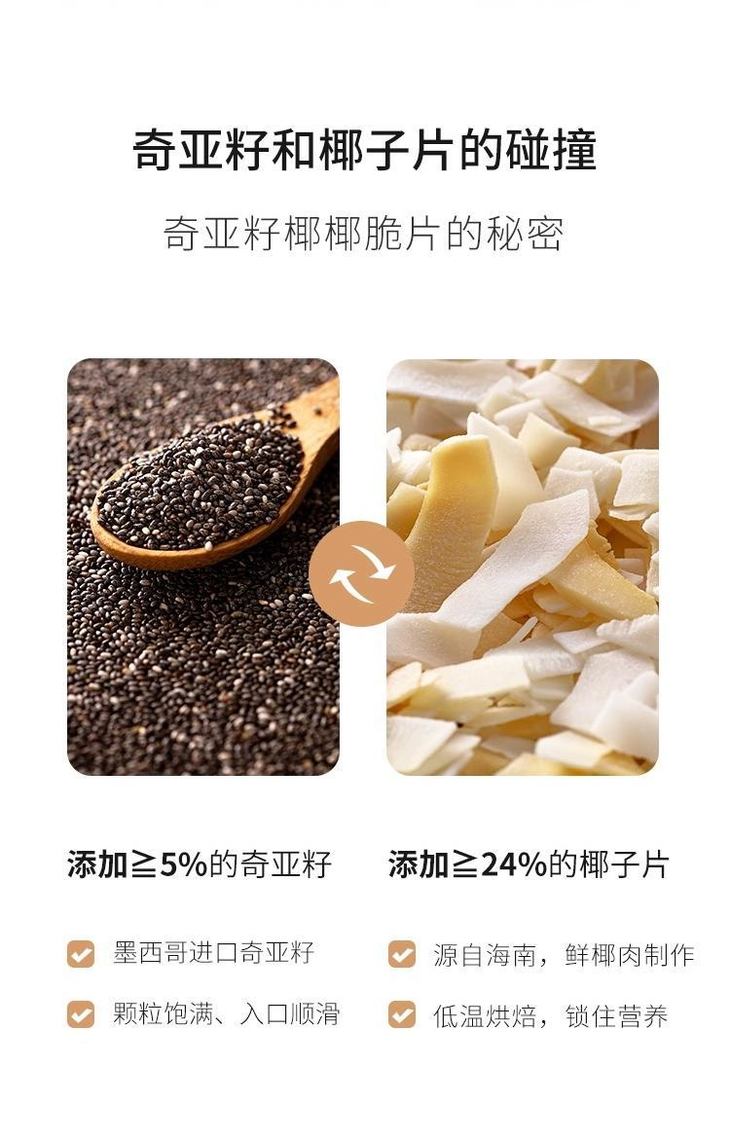 无数小红书博主强烈种草的【奇亚籽椰椰脆片】 🔸奇亚籽+椰子片+焦香薄饼! 🔸代餐新零食!健身人士新宠! 🔸看着很朴素,其实吃完很香浓,一口不够还想再吃,意犹未竟的美味! 🔸高能量高饱腹,轻卡健康,减糖还给身体减负担!