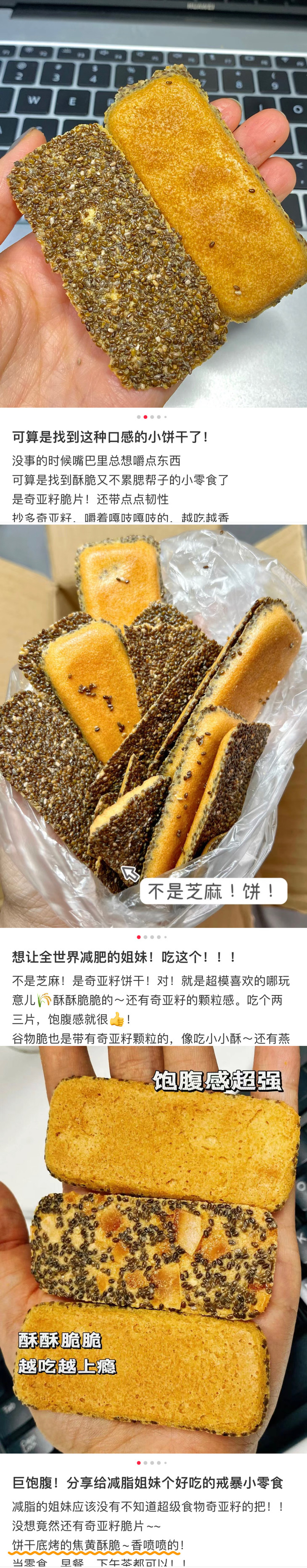 🤎“抗饿小能手” 这款饼干看起来超级健康! 居然有5%以上的奇亚籽添加! 高纤维高饱腹感!减脂人狂喜的小零食! 浓香的饼干上铺满一层厚厚的真实奇亚籽, 口口脆香,满满饱腹感! 饼干脆脆的,香气浓郁, 搭配奇亚籽一起咀嚼超级香!一整个大爱哇!
