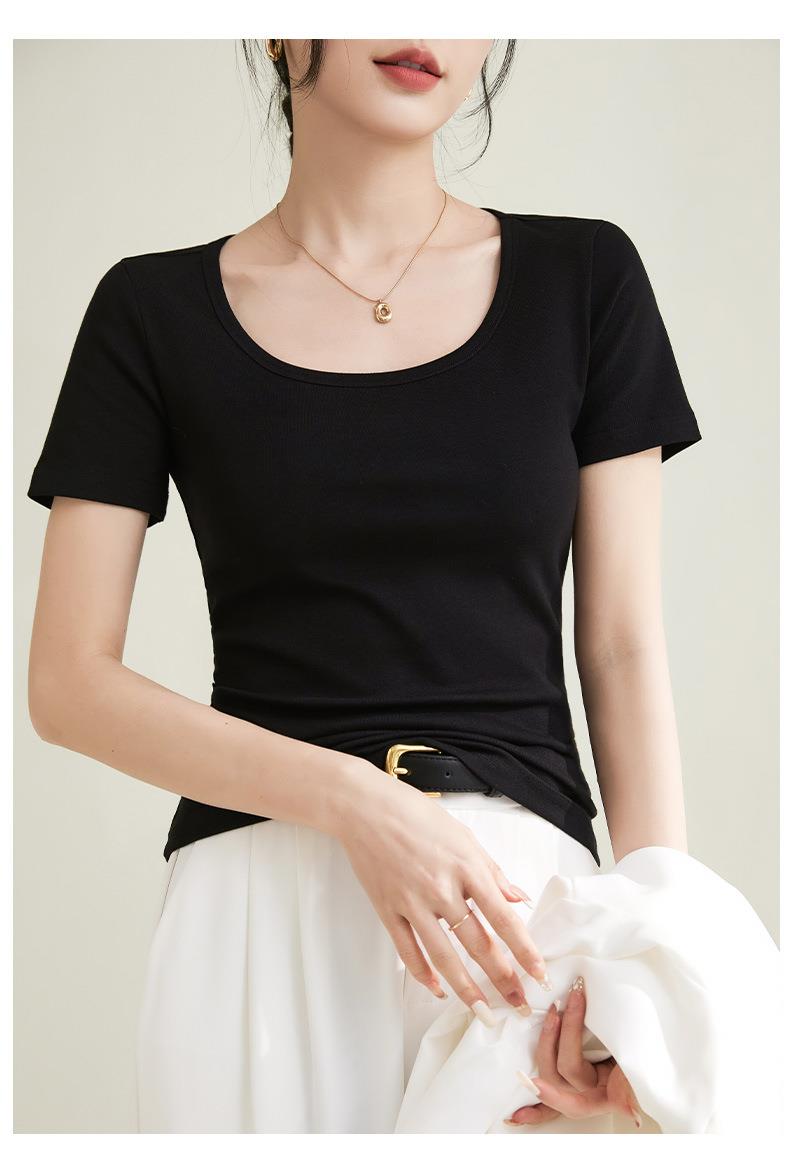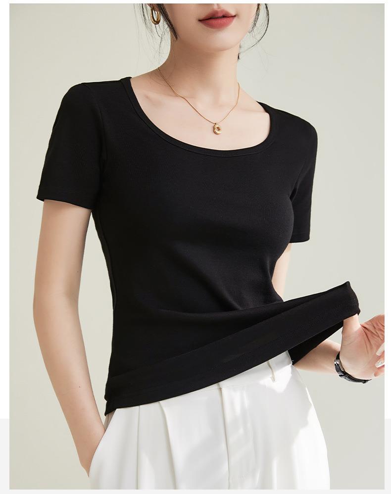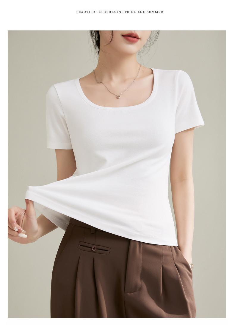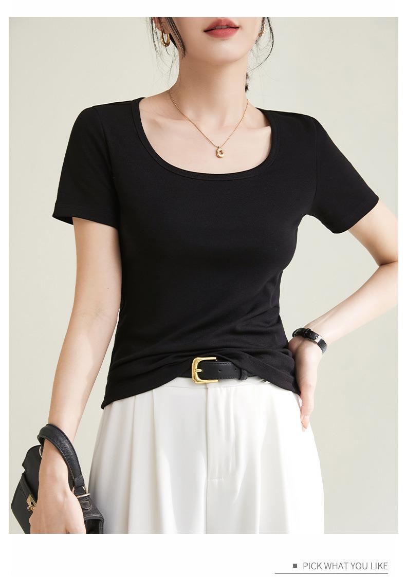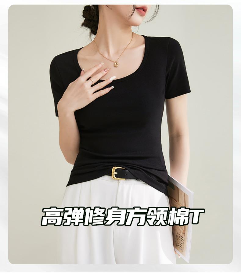 法式方圆领打底高级感高弹棉短袖T恤女2024春夏新款套头修身上衣