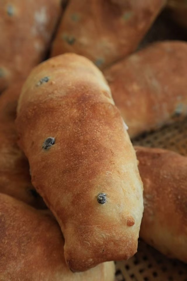 恰巴塔:名字挺好听,意大利语翻译过来的名字其实叫拖鞋,长得像拖鞋。制作它时,不拍掉气孔,它里面特别疏松。加了橄榄油、有少量的盐。