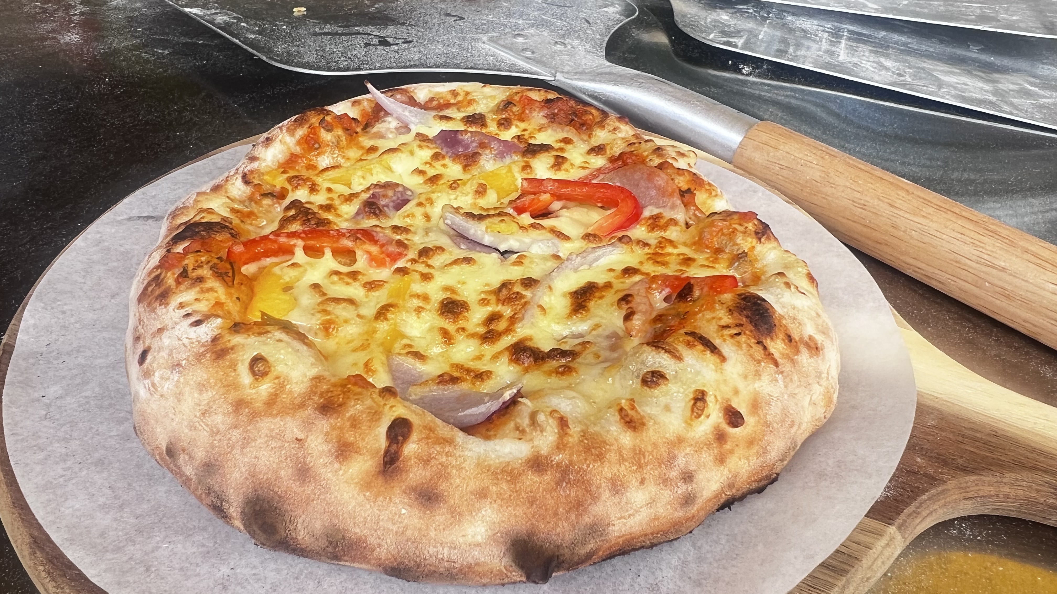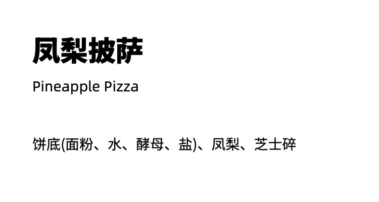 凤梨披萨(甜):饼底(面粉、水、酵母、盐)、凤梨、芝士碎