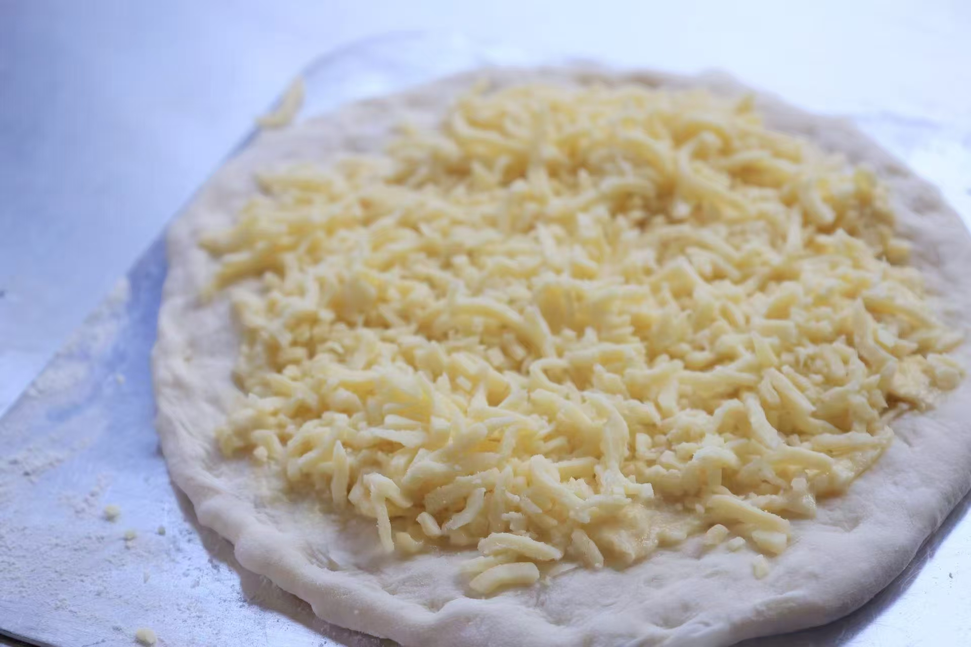 糯米肠玉米芝士披萨(甜咸):饼底(面粉、水、酵母、盐)、糯米肠、玉米、芝士片、芝士碎