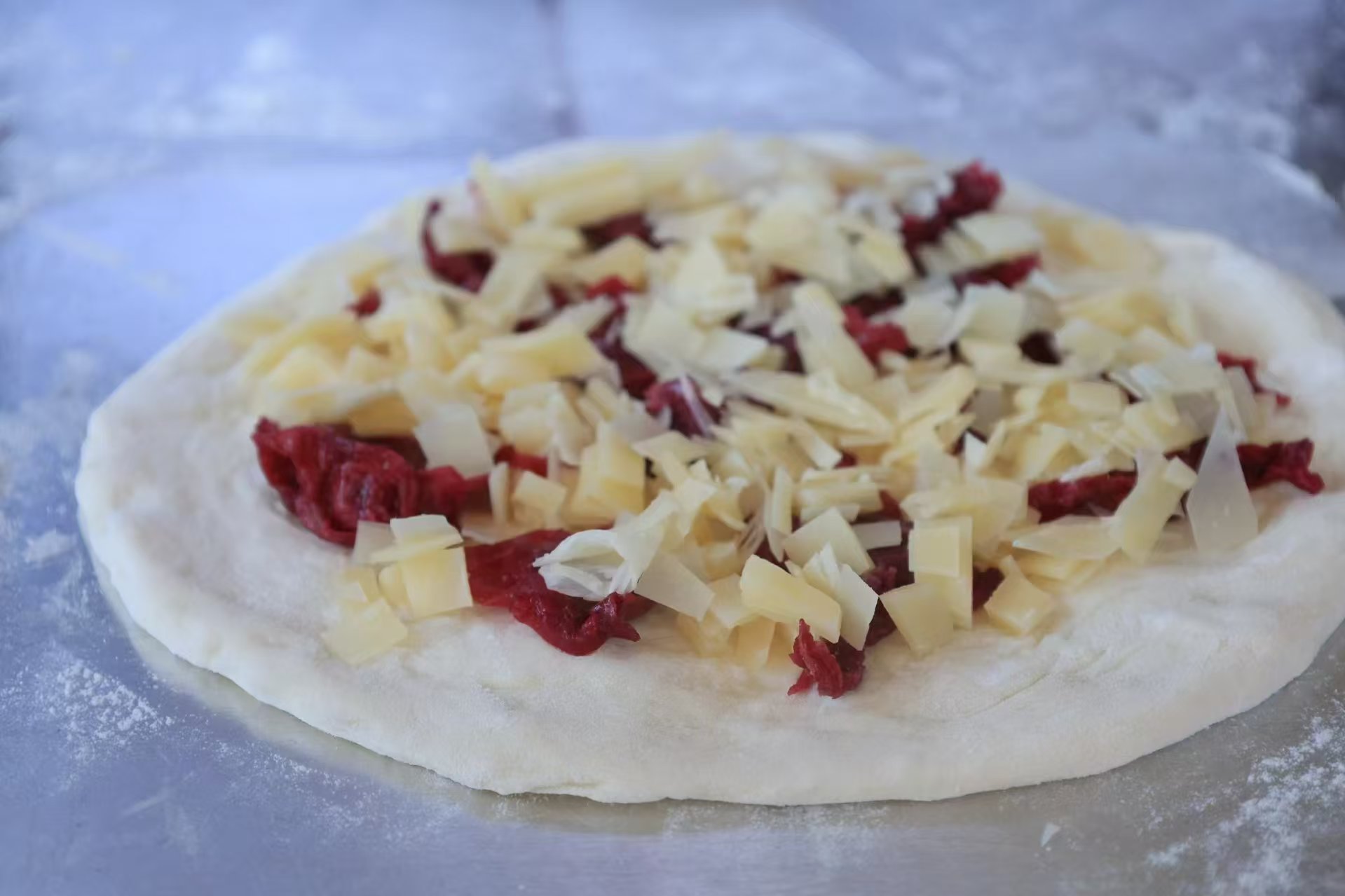 玫瑰乳扇披萨(甜):有机面粉、天然酵母、玫瑰酱、乳扇、芝士碎、少量粉盐