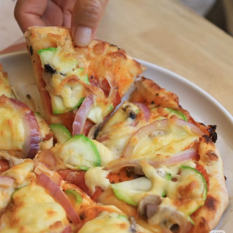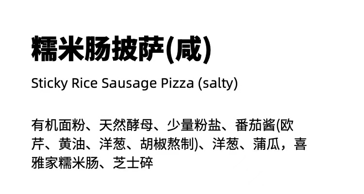 糯米肠披萨(咸):有机面粉、天然酵母、少量粉盐、番茄酱(欧芹、黄油、洋葱、胡椒熬制)、洋葱、蒲瓜,喜雅家糯米肠、芝士碎