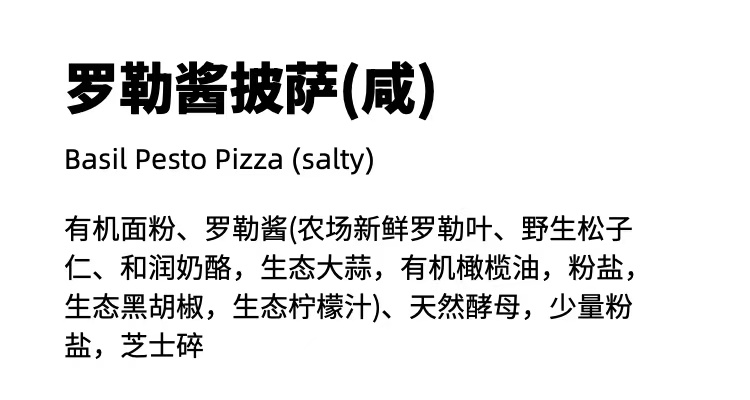 罗勒酱披萨(咸):有机面粉、罗勒酱(农场新鲜罗勒叶、野生松子仁、和润奶酪,生态大蒜,有机橄榄油,粉盐,生态黑胡椒,生态柠檬汁)、天然酵母,少量粉盐,芝士碎