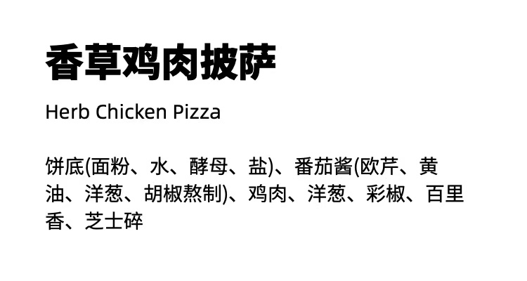 香草鸡肉披萨(咸):饼底(面粉、水、酵母、盐)、番茄酱(欧芹、黄油、洋葱、胡椒熬制)、鸡肉、洋葱、彩椒、百里香、芝士碎