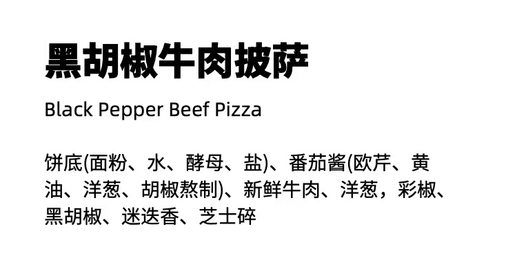 黑胡椒牛肉披萨(咸):饼底(面粉、水、酵母、盐)、番茄酱(欧芹、黄油、洋葱、胡椒熬制)、新鲜牛肉、洋葱,彩椒黑胡椒、迷迭香、芝士碎