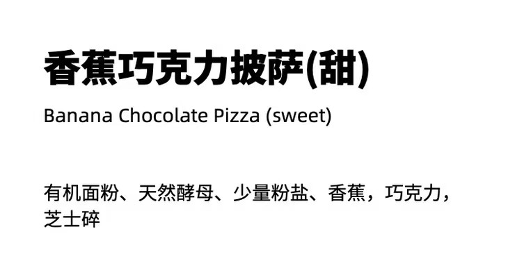 香蕉巧克力披萨(甜):有机面粉、天然酵母、少量粉盐、香蕉,巧克力,芝士碎