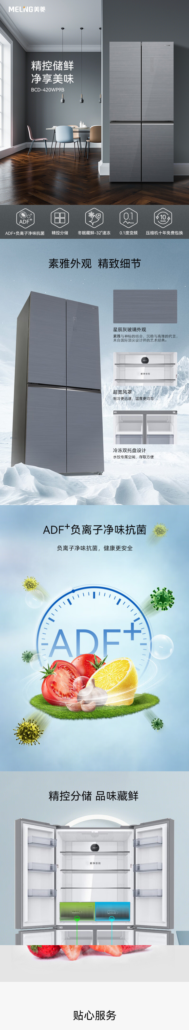 美菱(202670)420升变频十字对开门冰箱BCD-420WP9B