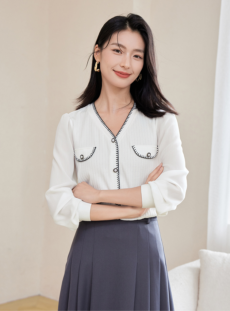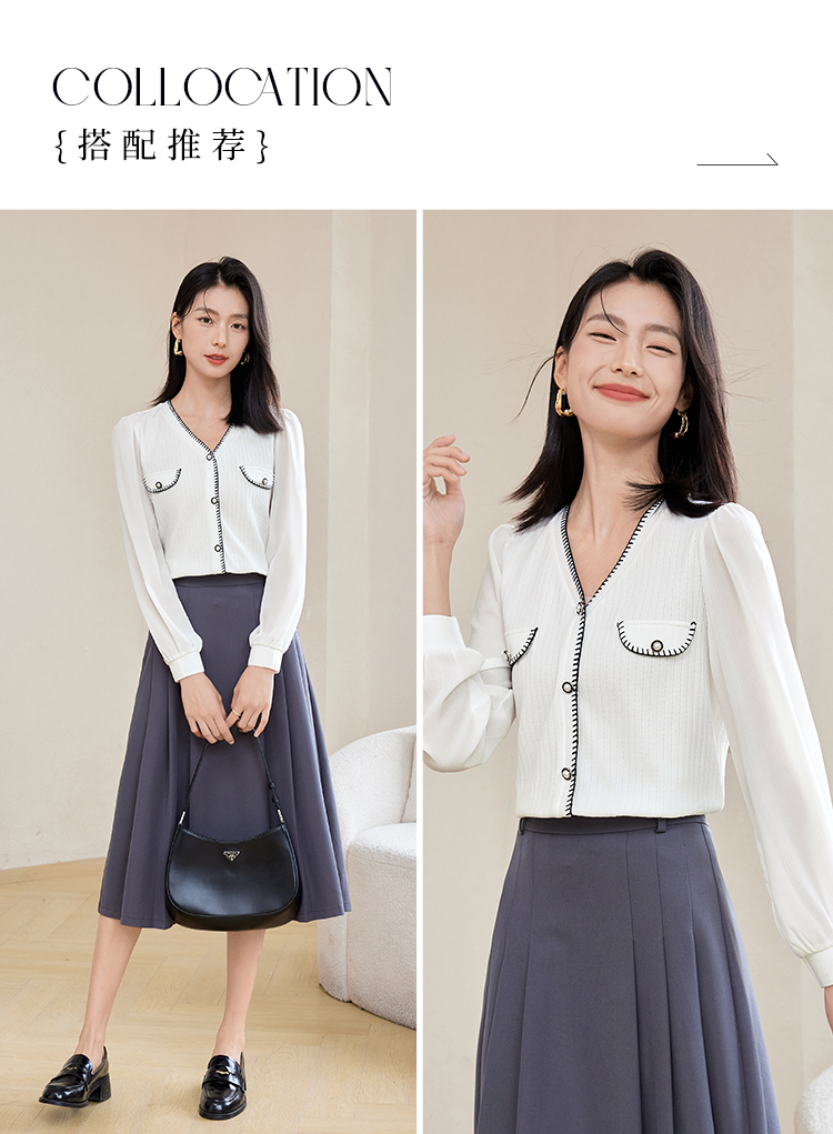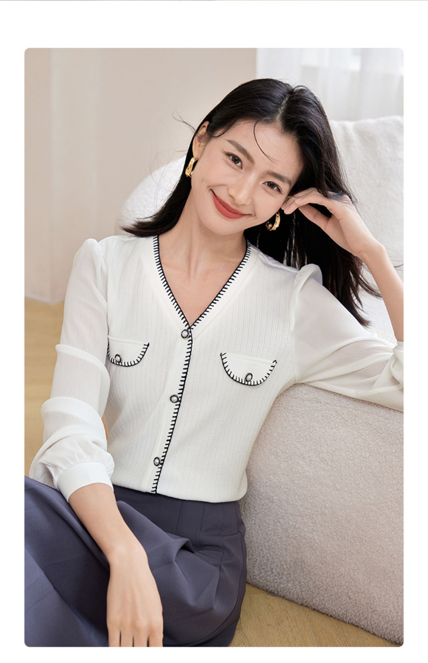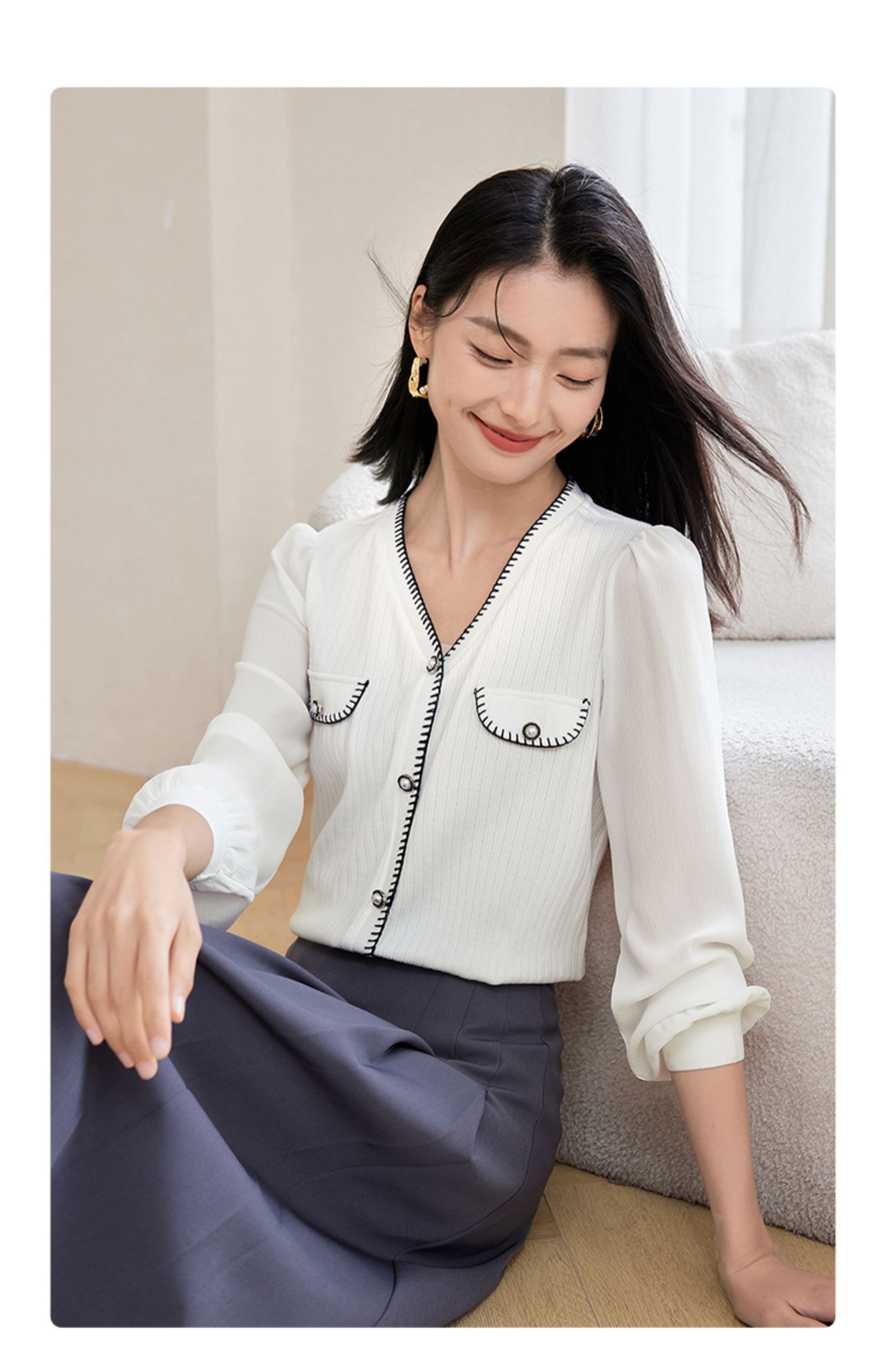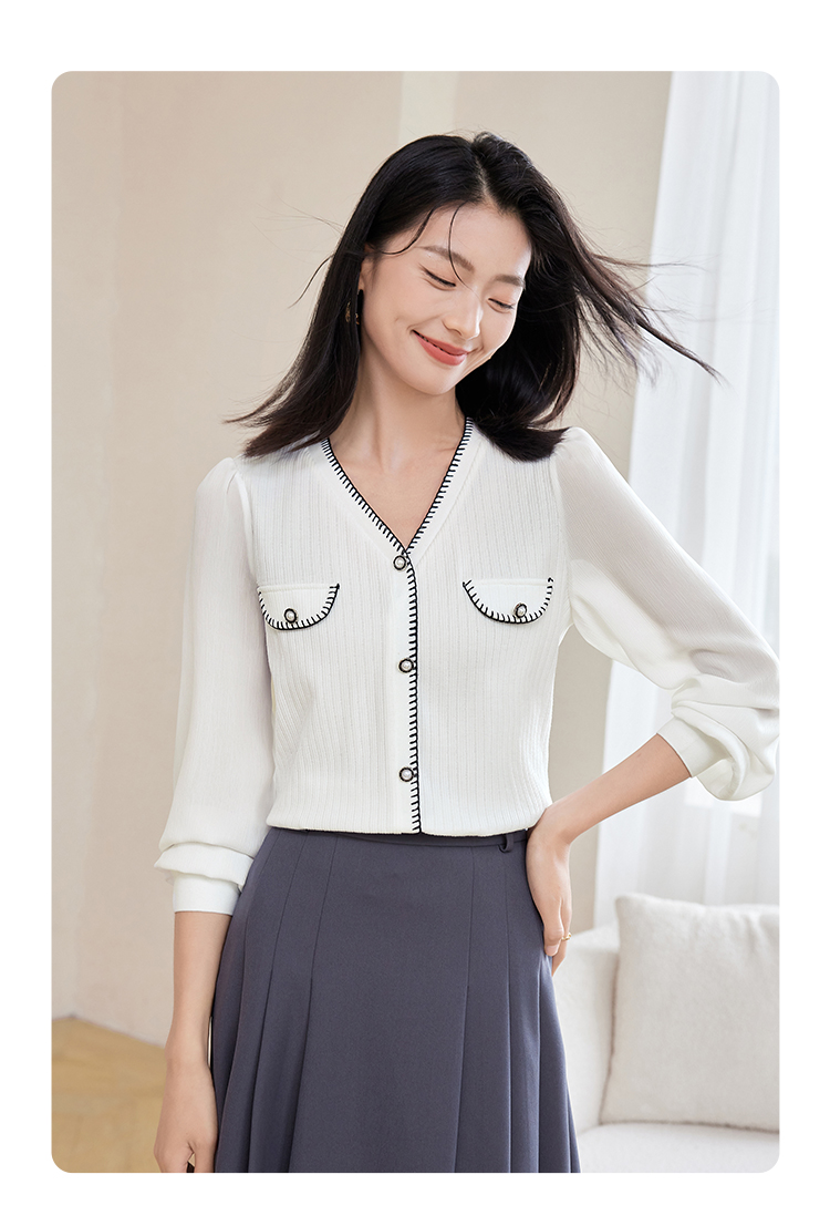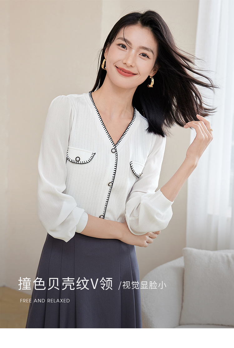 【年终特卖】熙世界小香风撞色织带V领长袖雪纺上衣时尚气质小衫2025秋新款