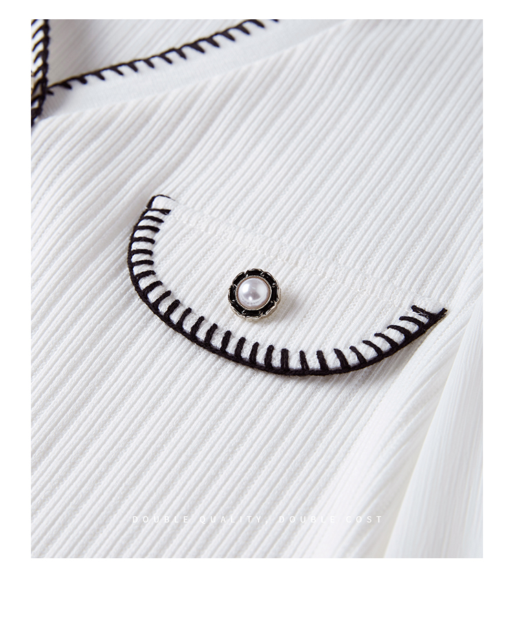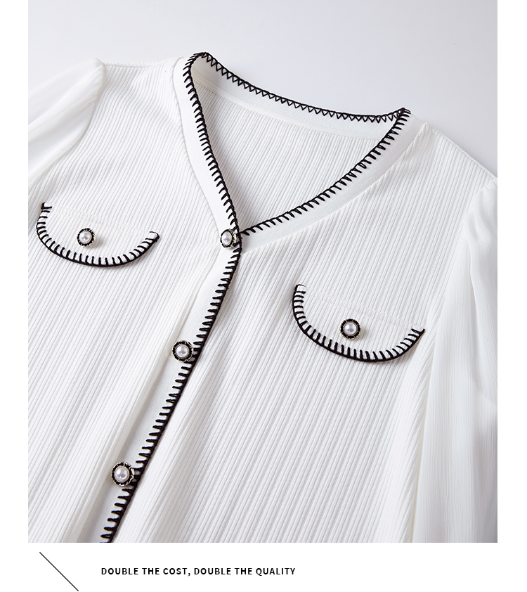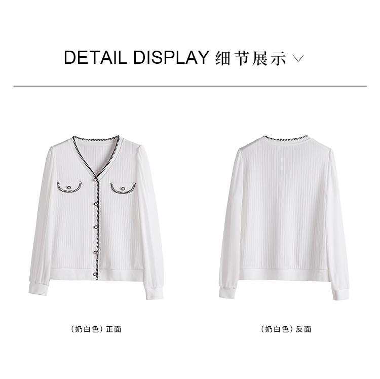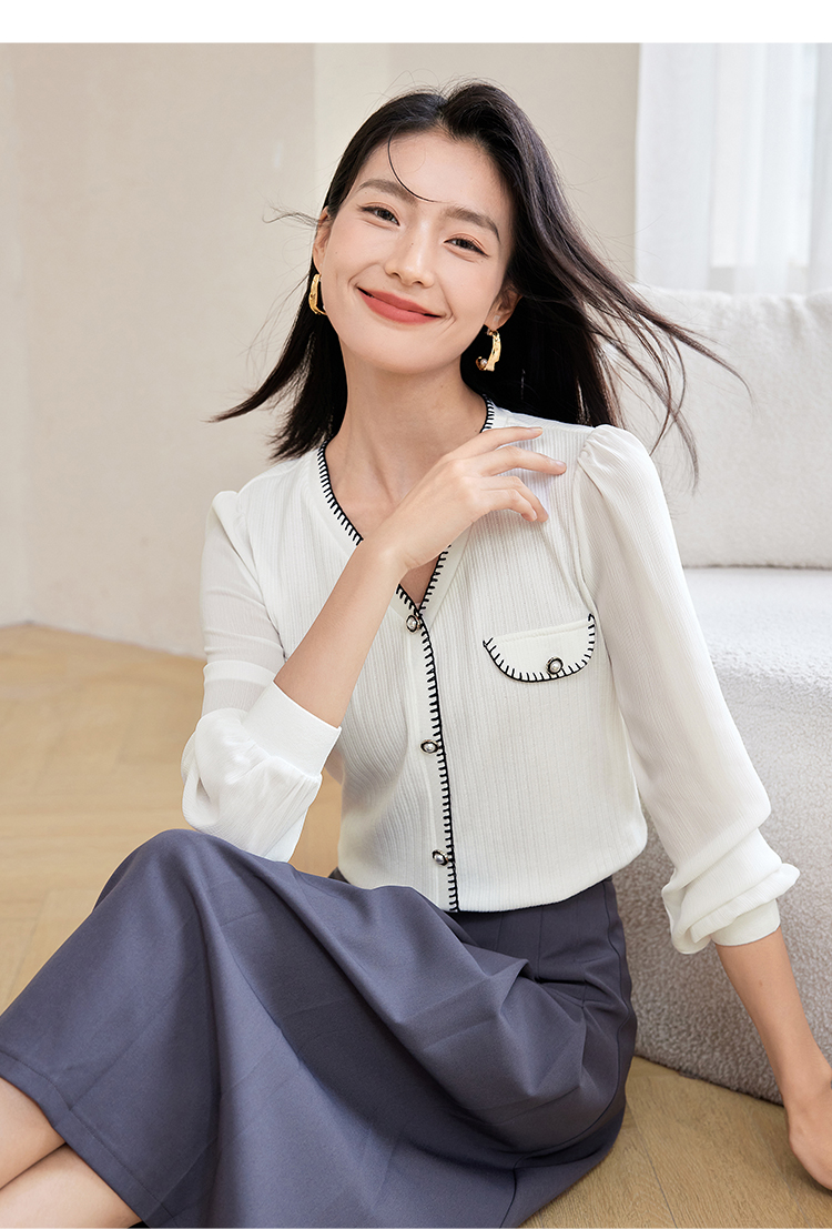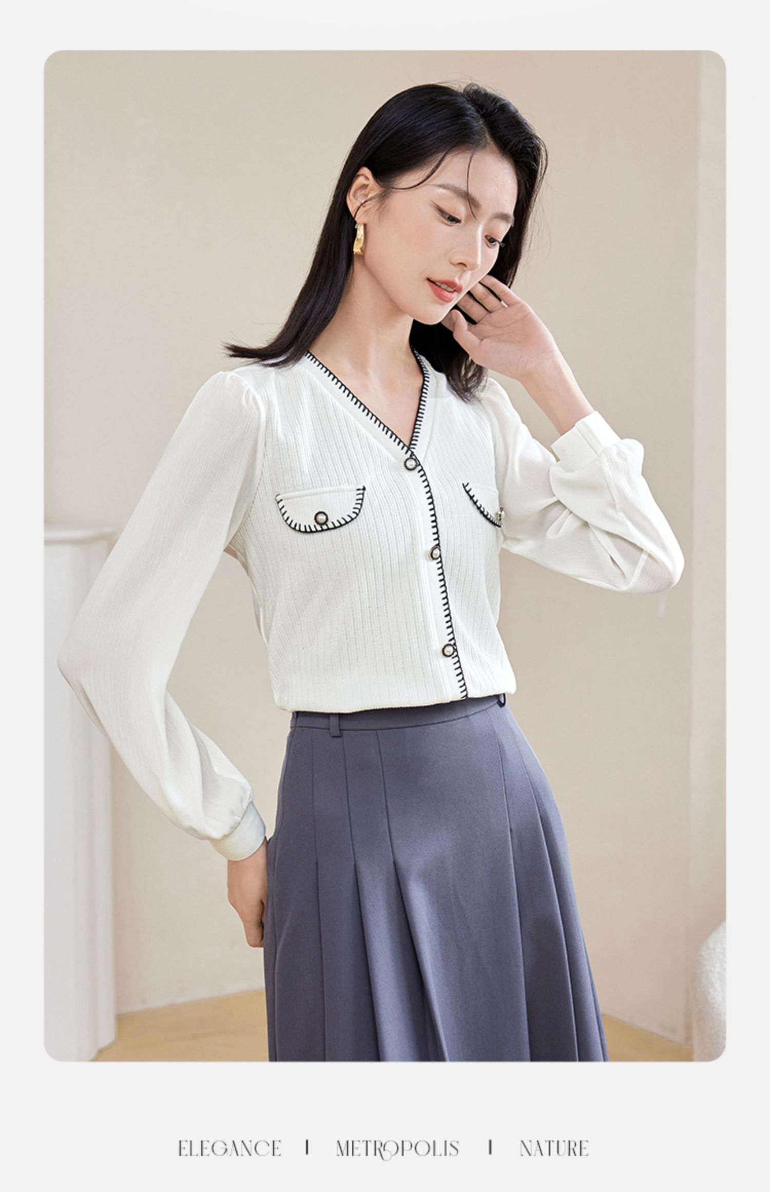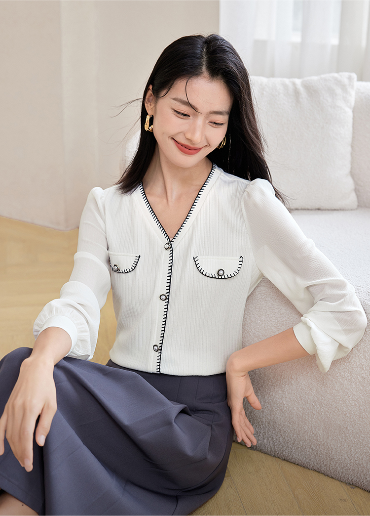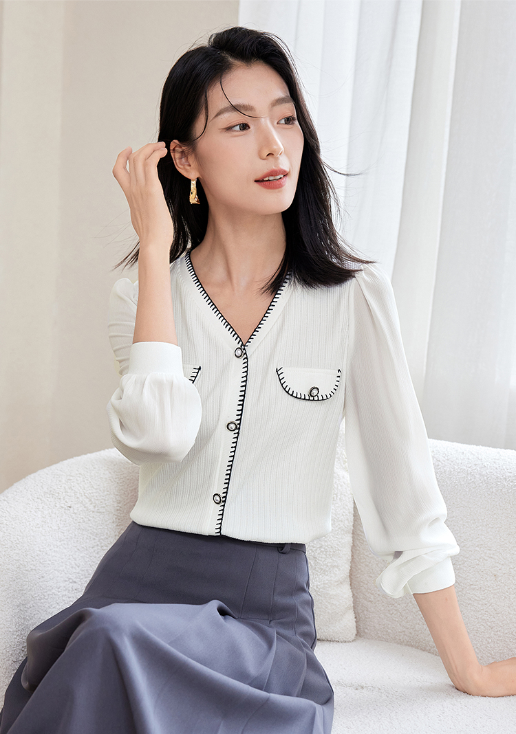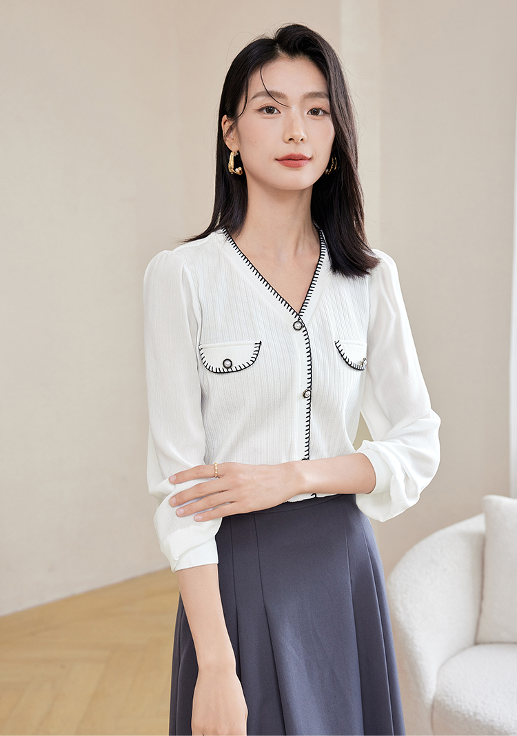 【年终特卖】熙世界小香风撞色织带V领长袖雪纺上衣时尚气质小衫2025秋新款
