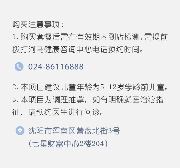 视力+耳穴护理卡(单次时间:15-20分钟)适用年龄:5-12岁学龄期儿童 需提前3天拨打河马健康咨询中心电话预约时间 咨询电话024-86116888