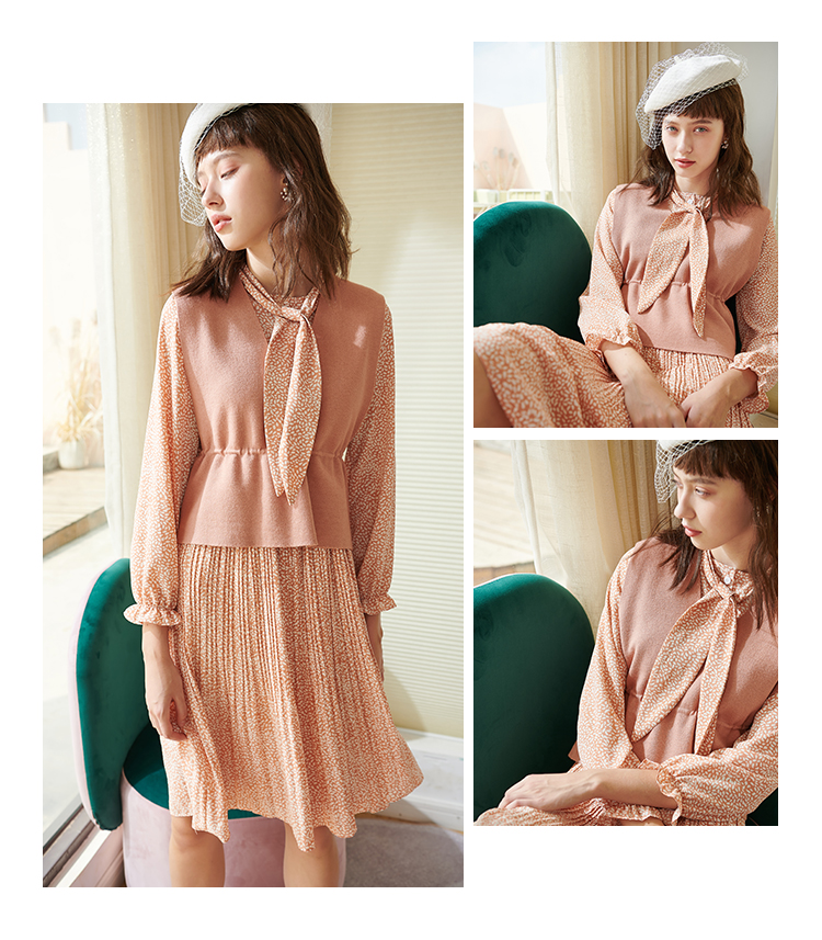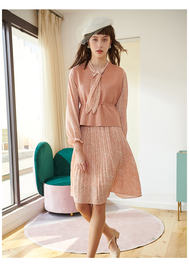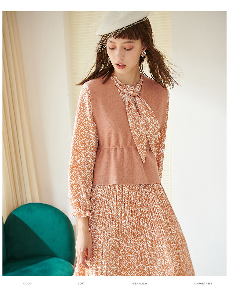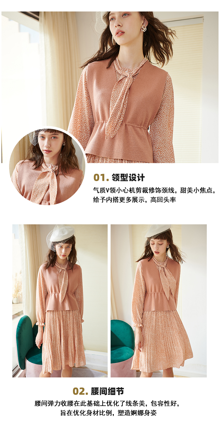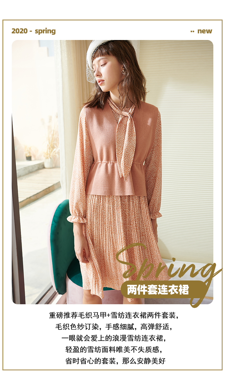 欧芮儿春新款两件套小香风套背心针织衫加碎花雪纺连衣裙