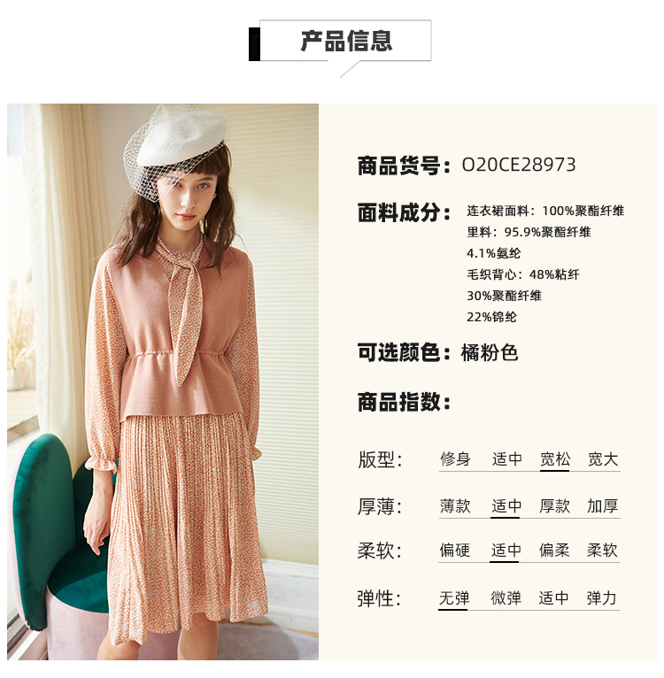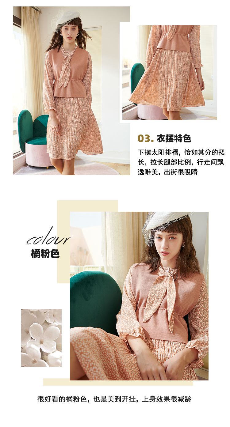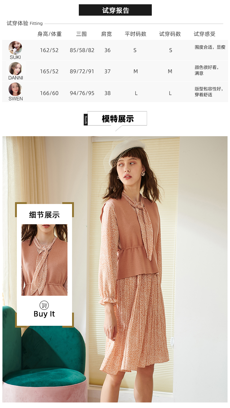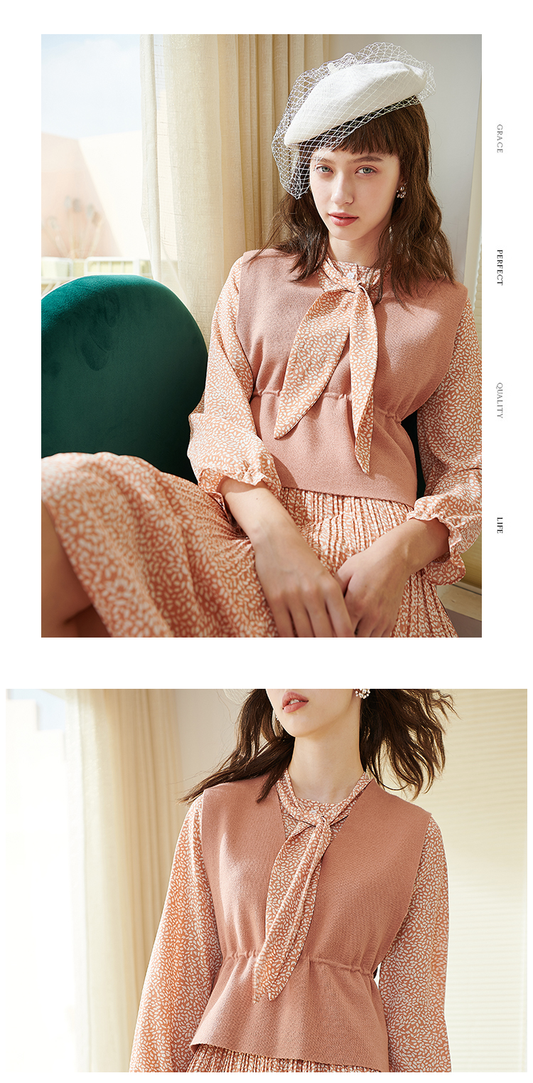 欧芮儿春新款两件套小香风套背心针织衫加碎花雪纺连衣裙