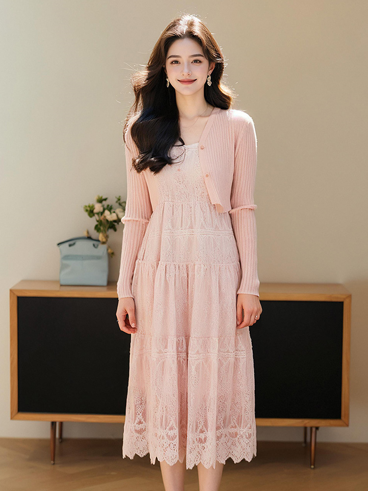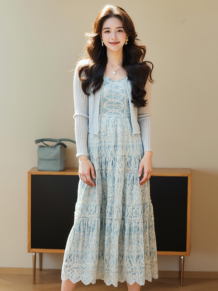 奢姿大码女装2025春季蕾丝吊带绣花连衣裙两件套胖妹妹时尚套装9952956382