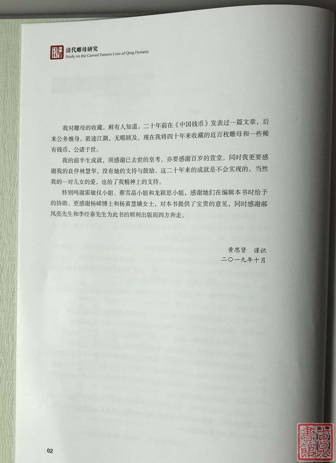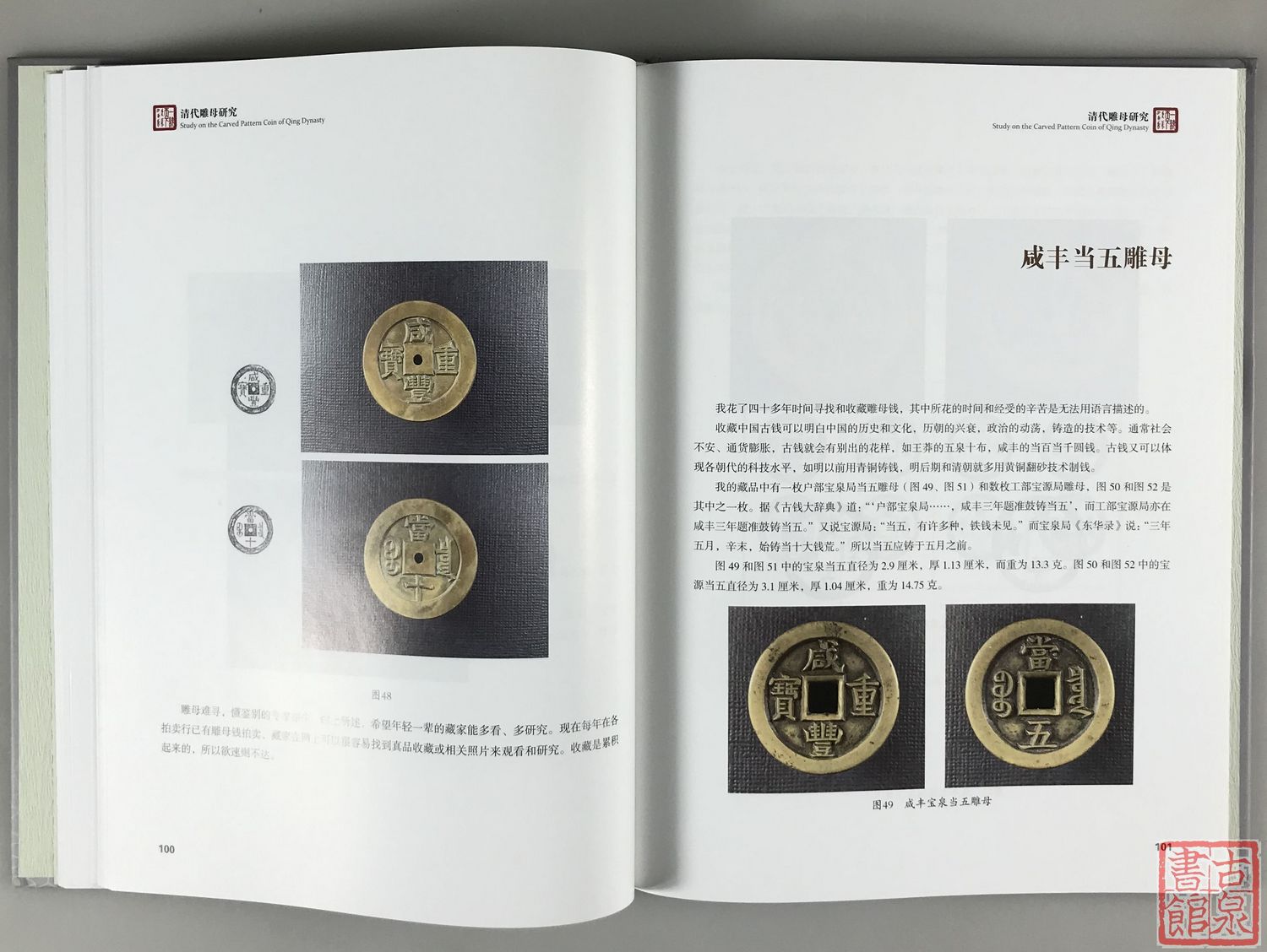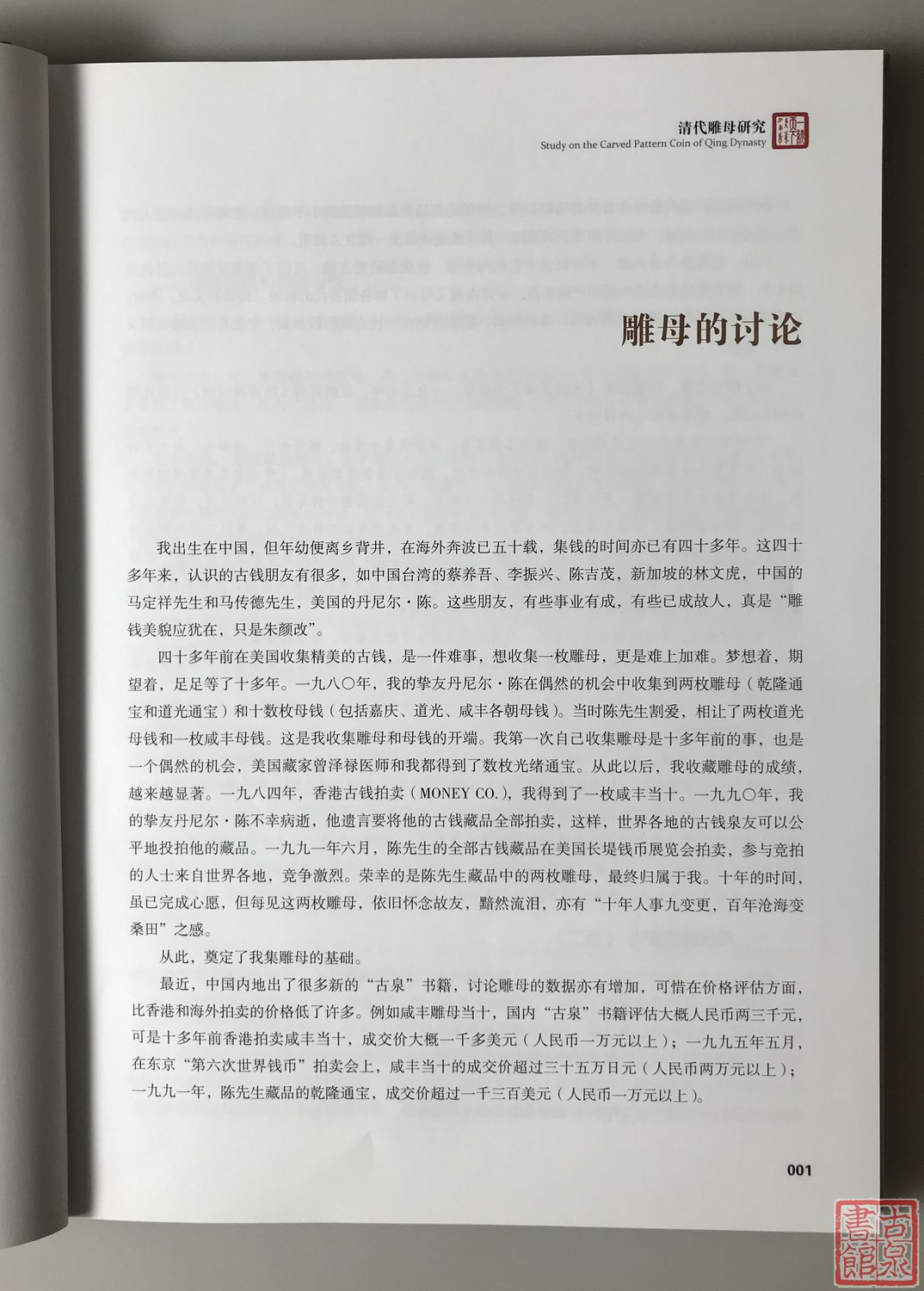 该书为美国华人黄思贤先生潜心研究四十年的重要成果,其中含有大量清代母钱及雕母的研究文字,深入浅出的诠释了雕母的雕母的奥秘。其内容涵盖讨论雕母钱和母钱、未开金口的钱币——母钱或样钱、各种伪造雕母的方法、中国古钱的、中国铸钱的阶段等。作者古钱收藏已有四十多年的历史,起初只是在美国各中国城、古玩铺买些普通品,三十多年前从E. Kann先生的藏品中买了十数枚元宝,后来从Howard Gibbs藏品买了一些空首布和金错刀。一个偶然的机会又收购了罗彻斯特大学所藏Speicher氏的所有收藏品。