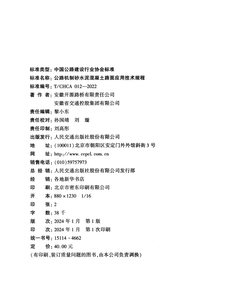 书名:公路机制砂水泥混凝土路面应用技术规程(T/CHCA 012—2022)