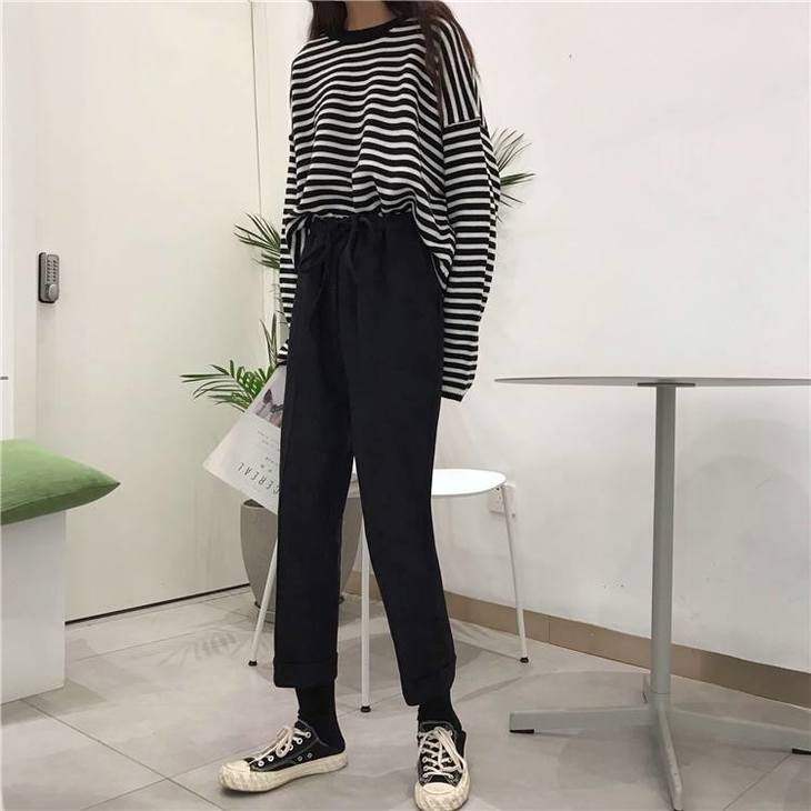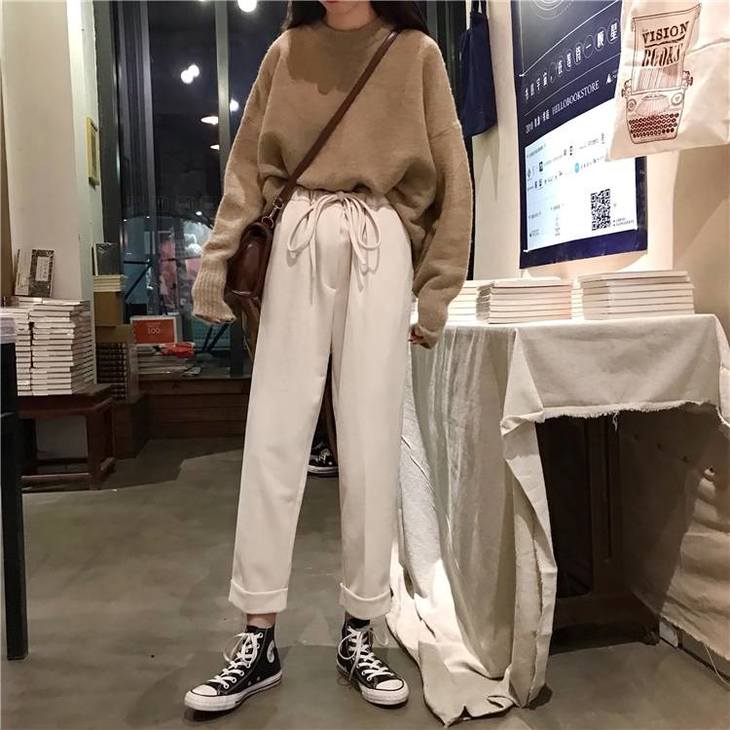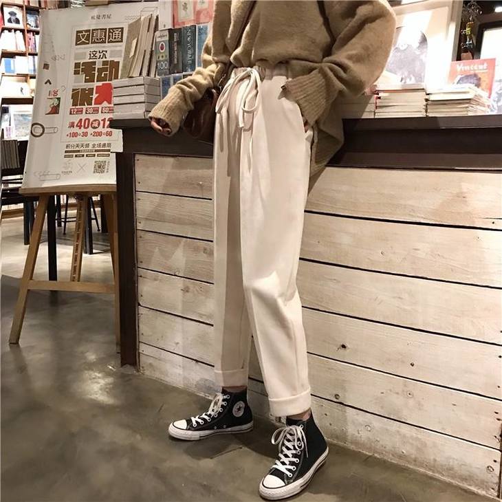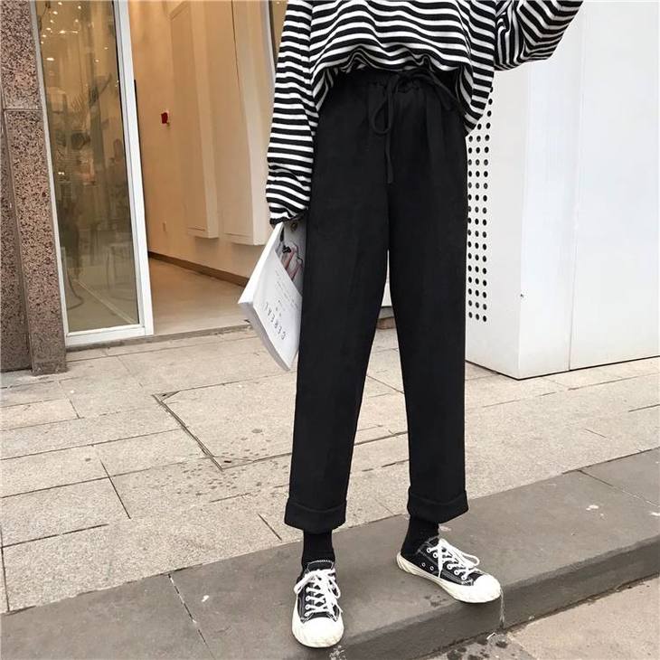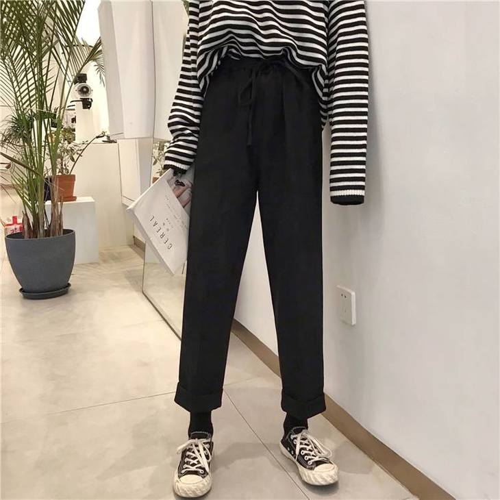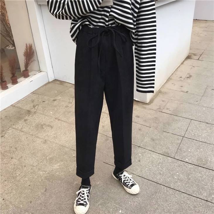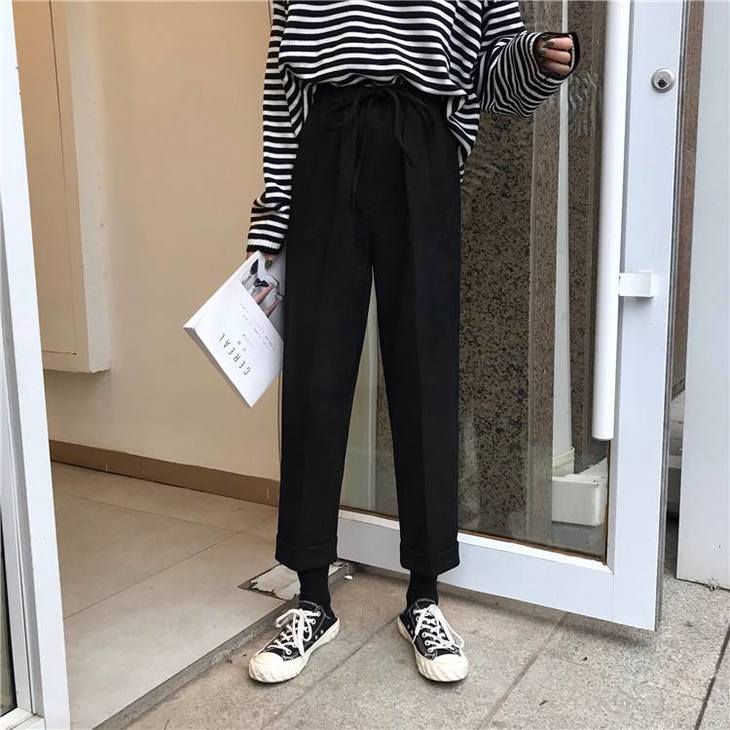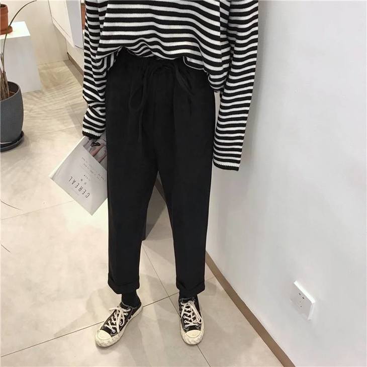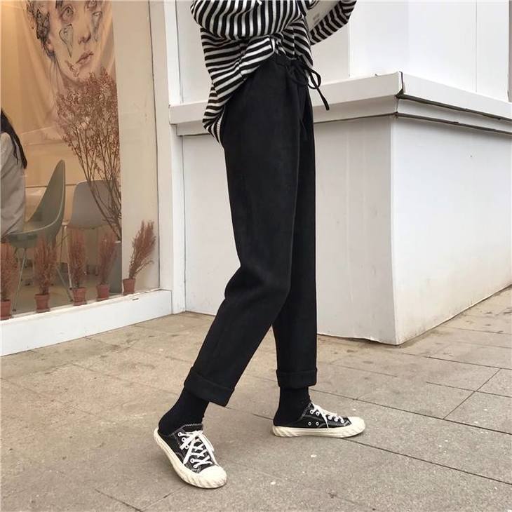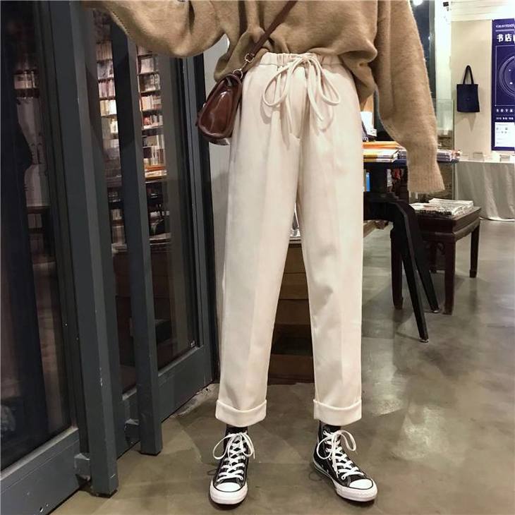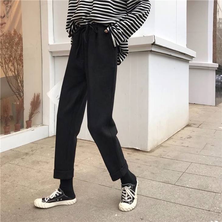 韩版宽松加厚松紧腰休闲高腰直筒毛呢显瘦裤长裤学生裤子七夕情人节