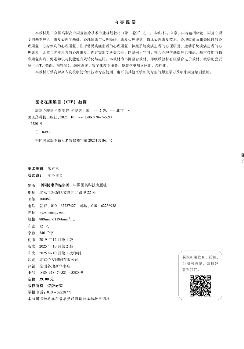 康复心理学 第2二版(高职高专康复治疗技术专业第二轮教材)李明芳 初晓艺 主编 供康复治疗技术专业用 中国医药科技出版社
